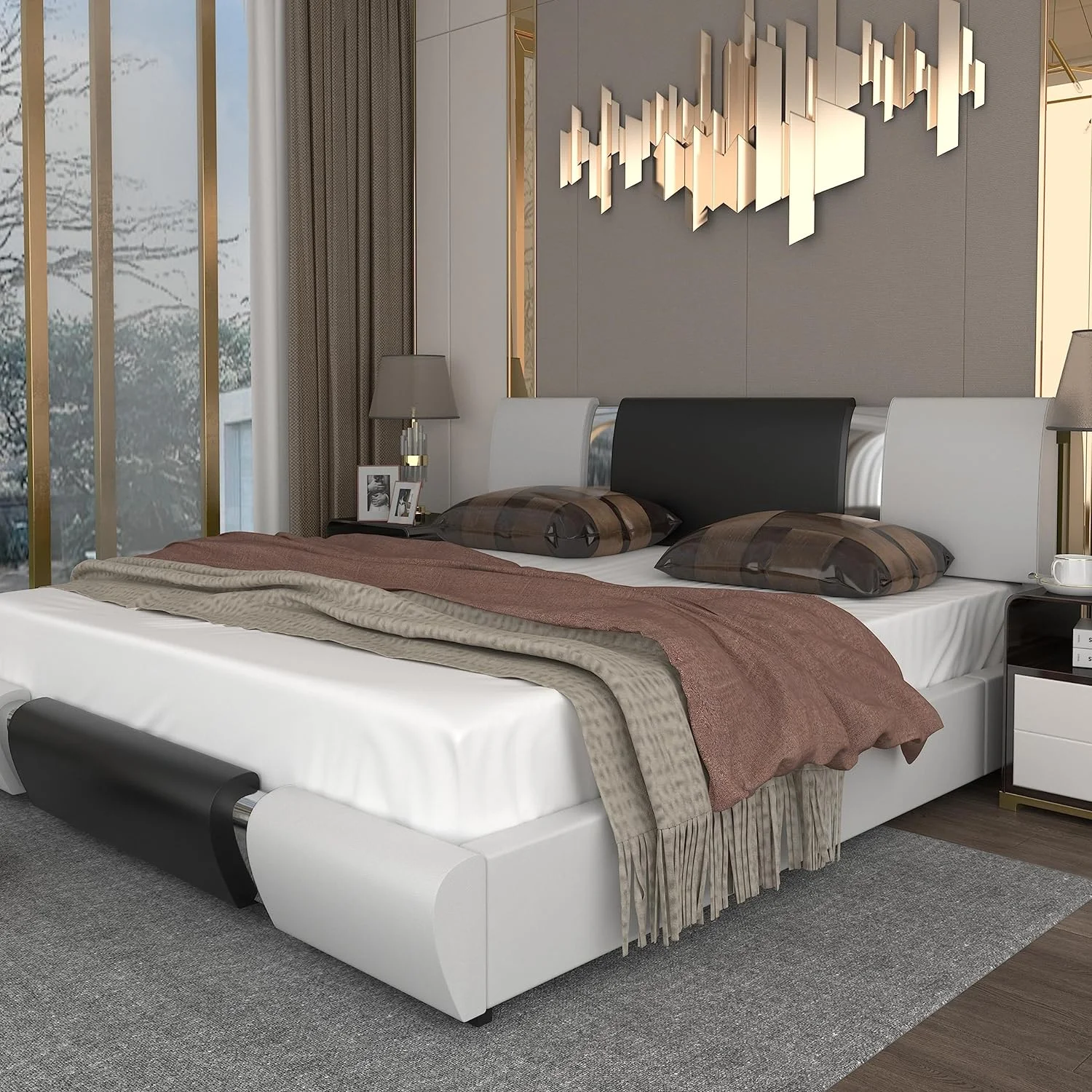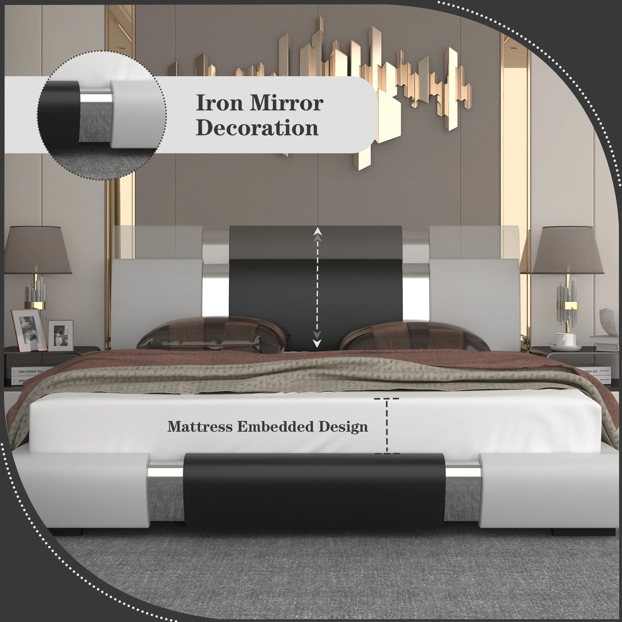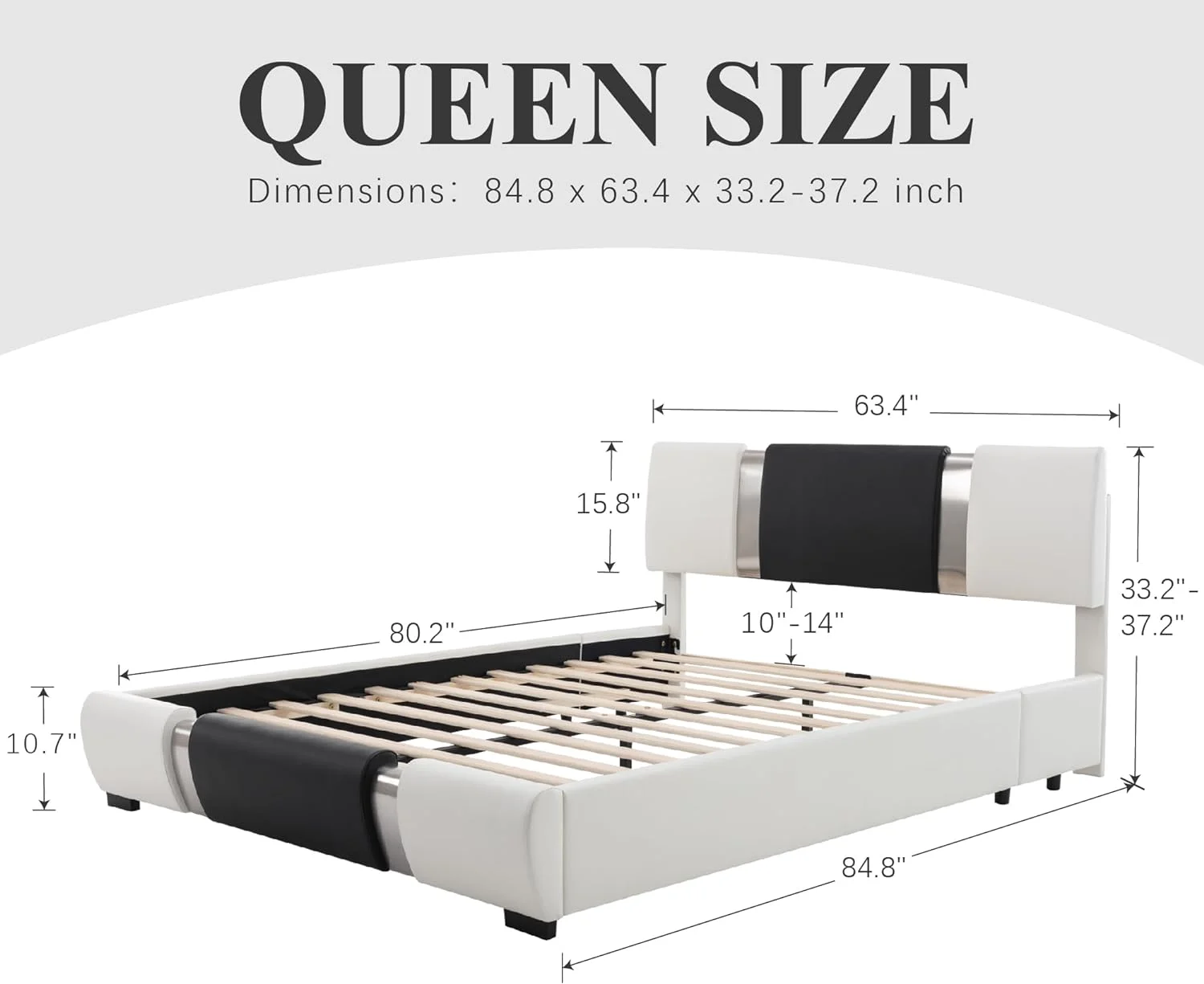 Kallabe Queen Size Modern Bed Frame with Iron Pieces Decor and Faux Leather Headboard, Black & White