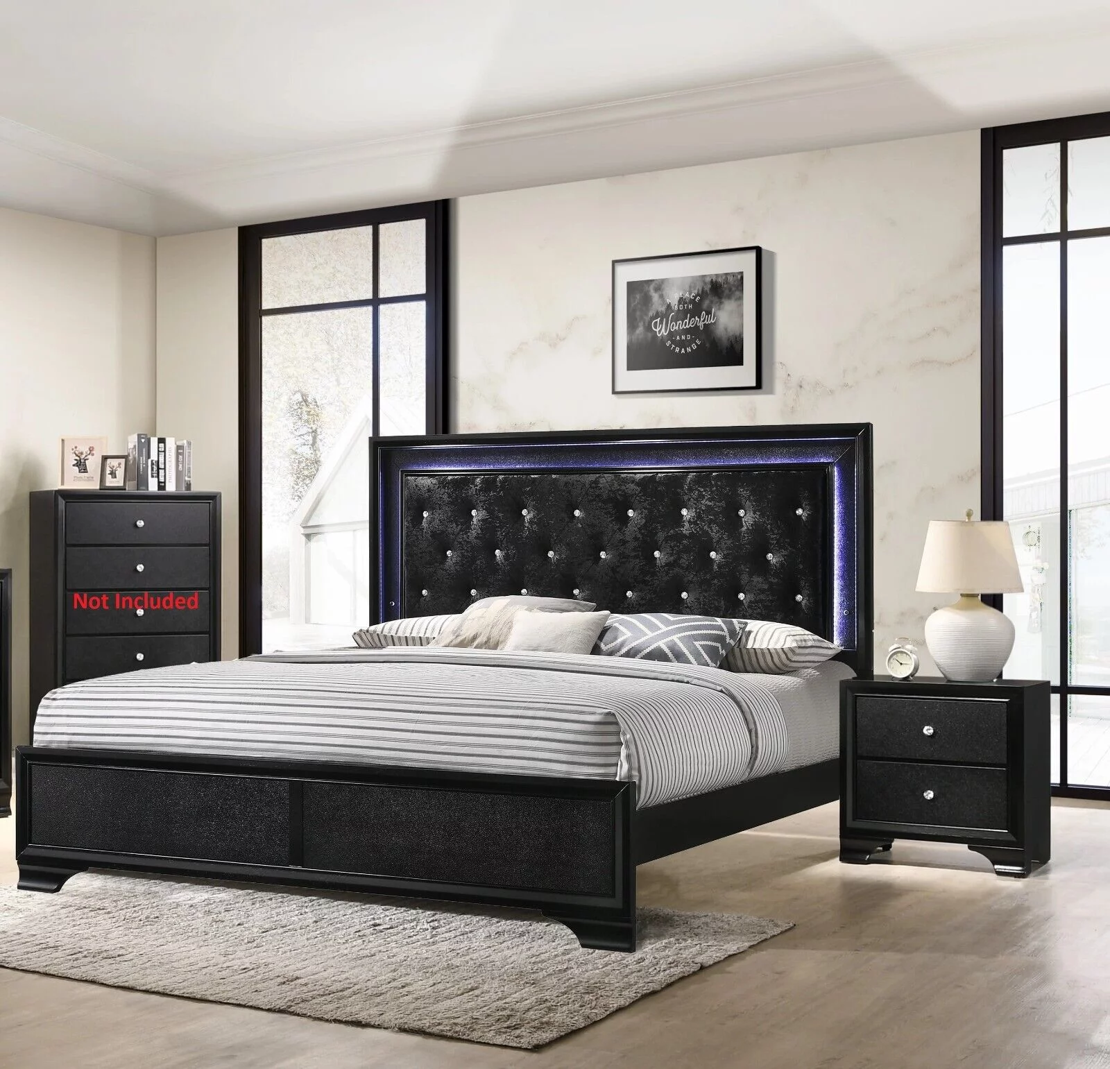 1pc Modern Glam Style King Size Upholstery LED Panel Bed Wooden Bedroom Furniture Black