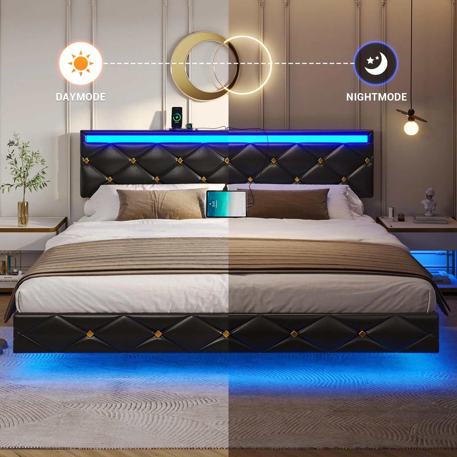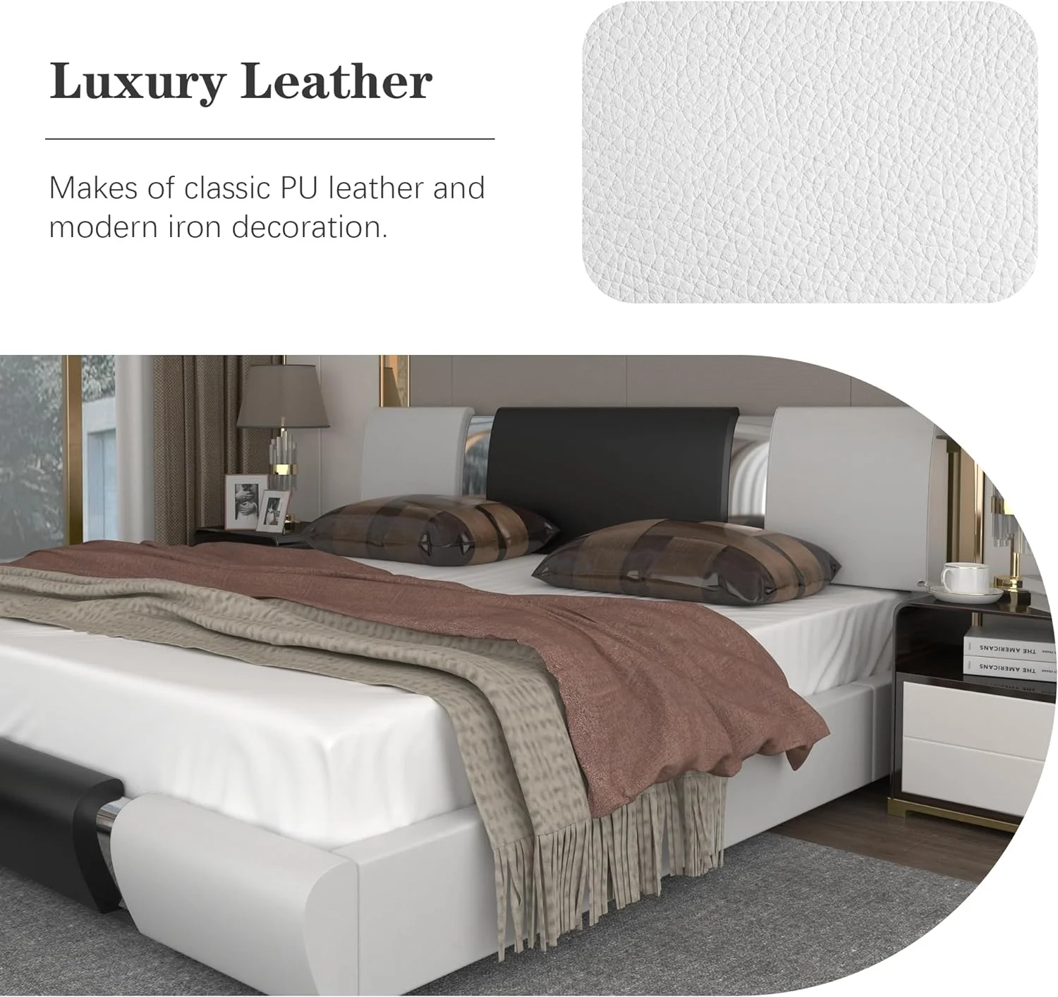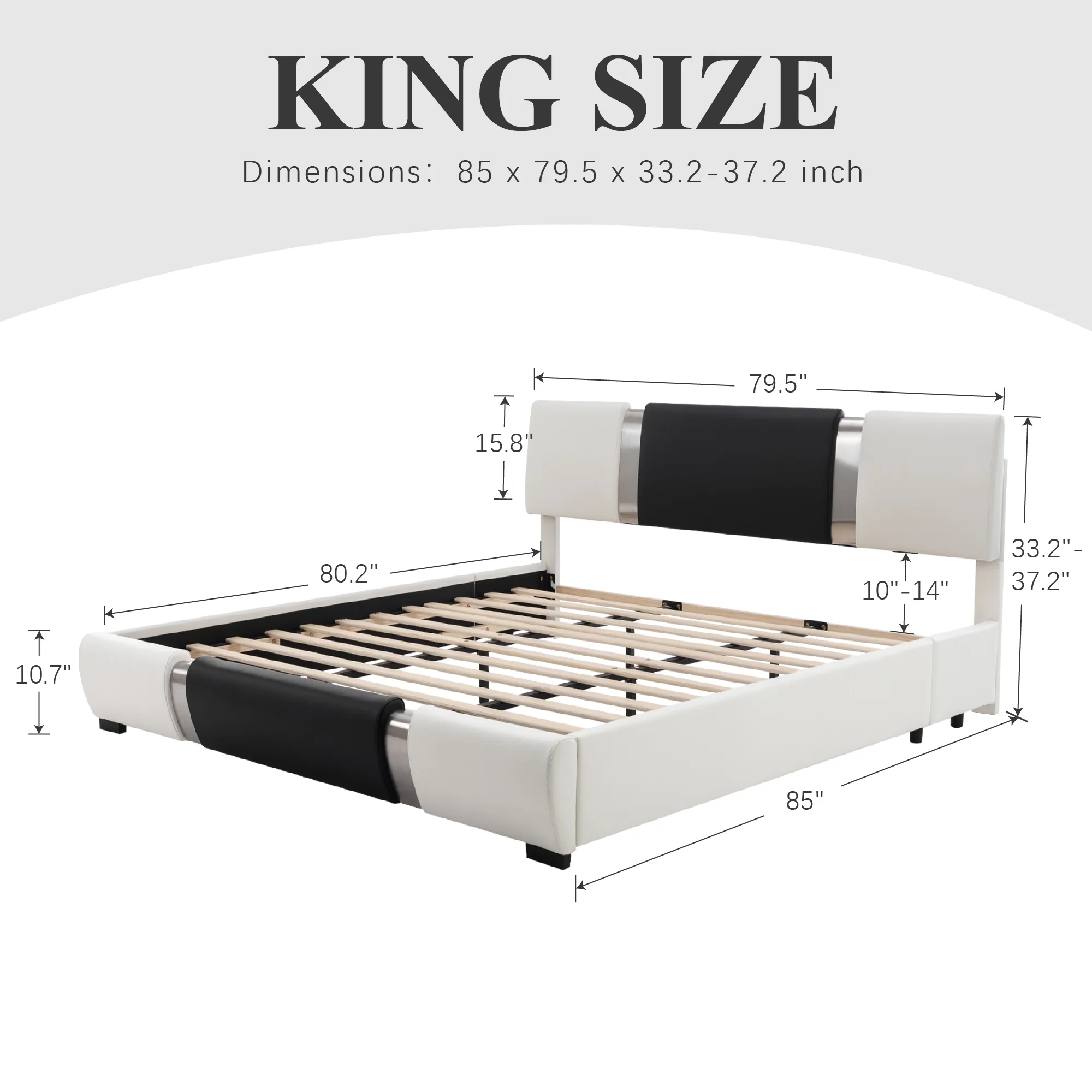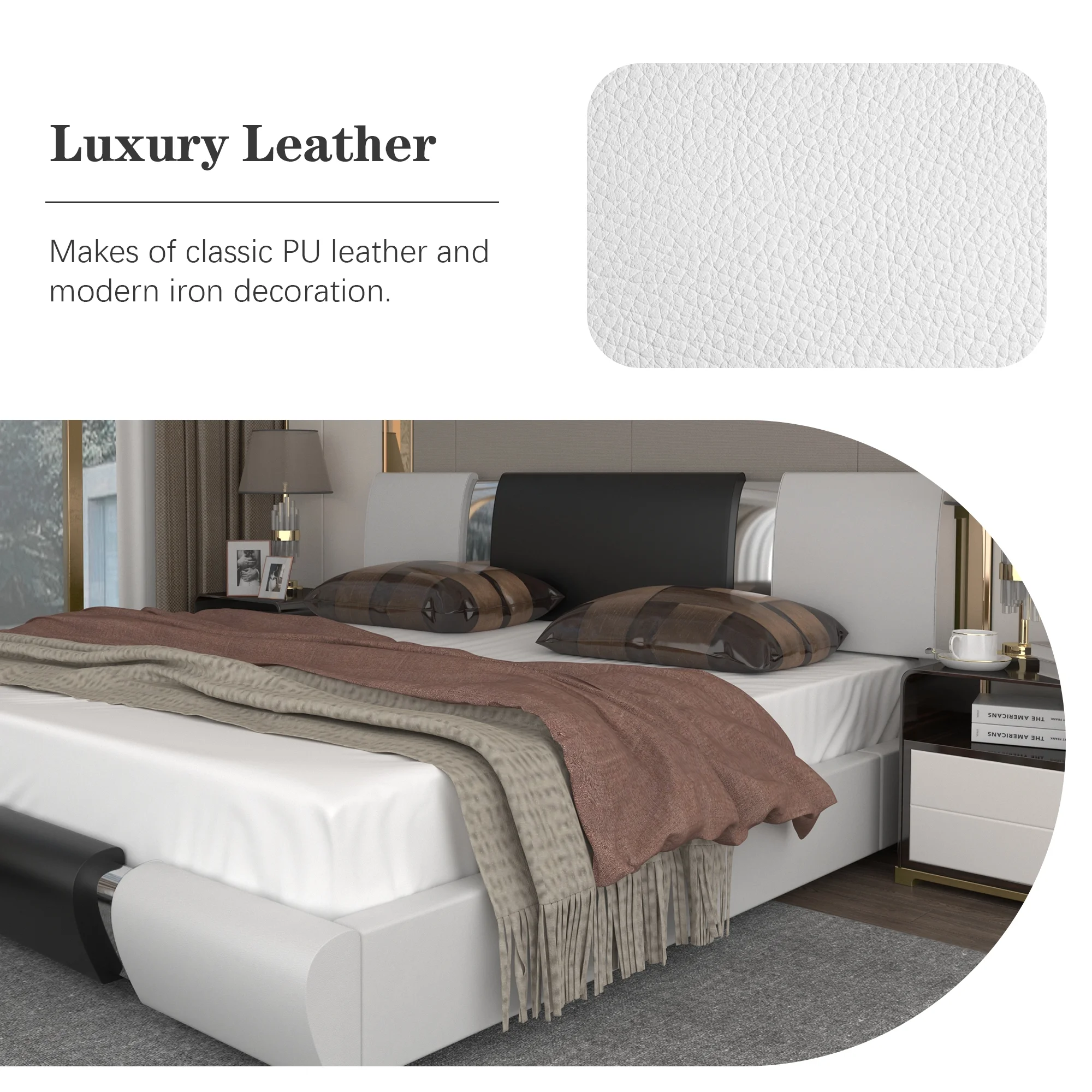 Kallabe King Size Modern Bed Frame with Led Light,Iron Pieces Decor and Faux Leather Headboard, Black & White