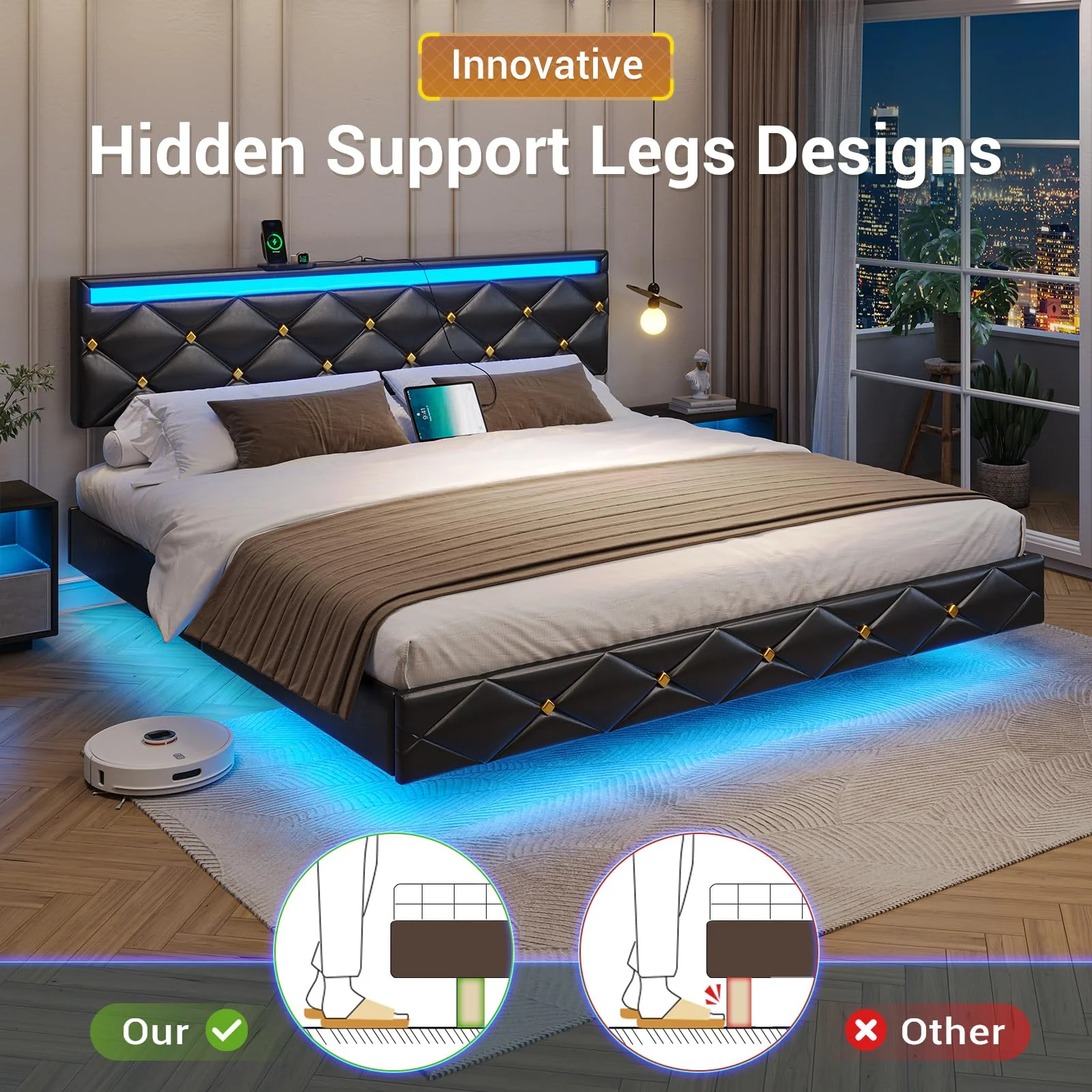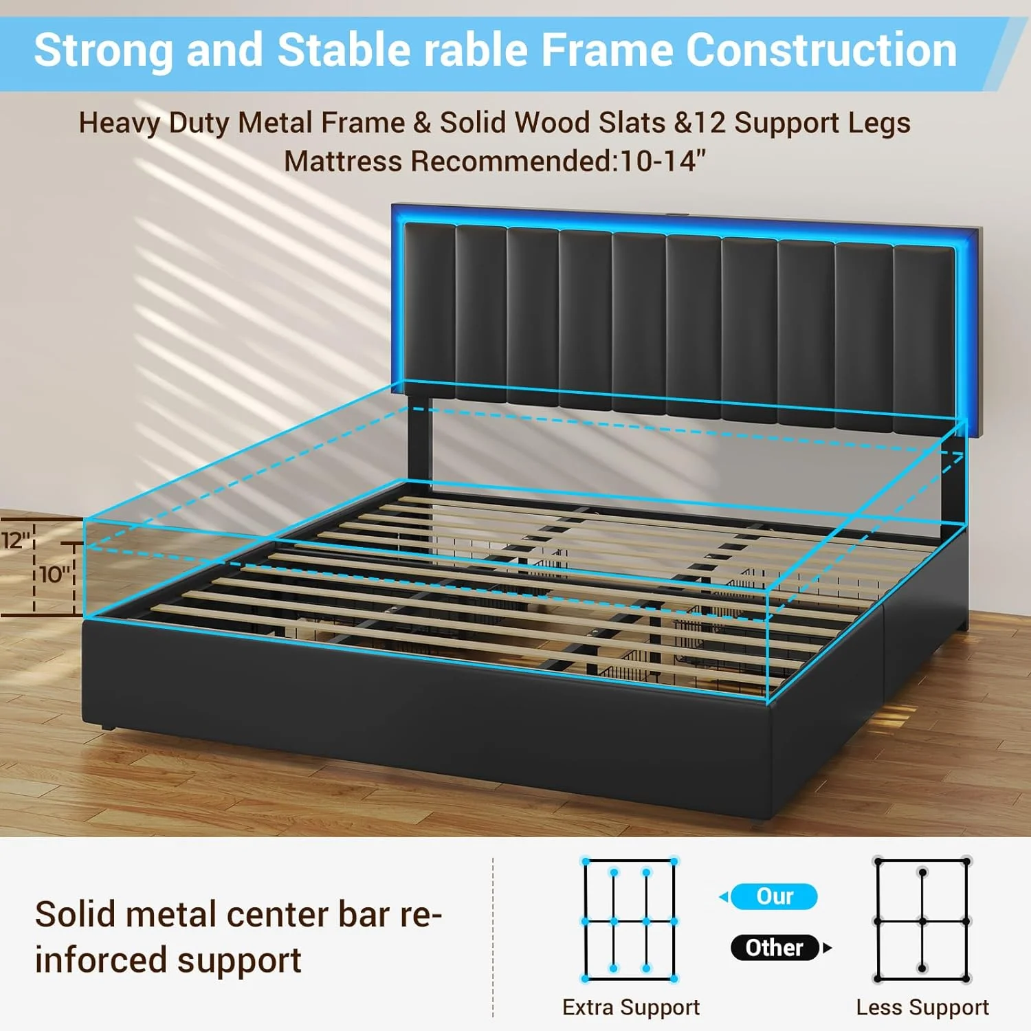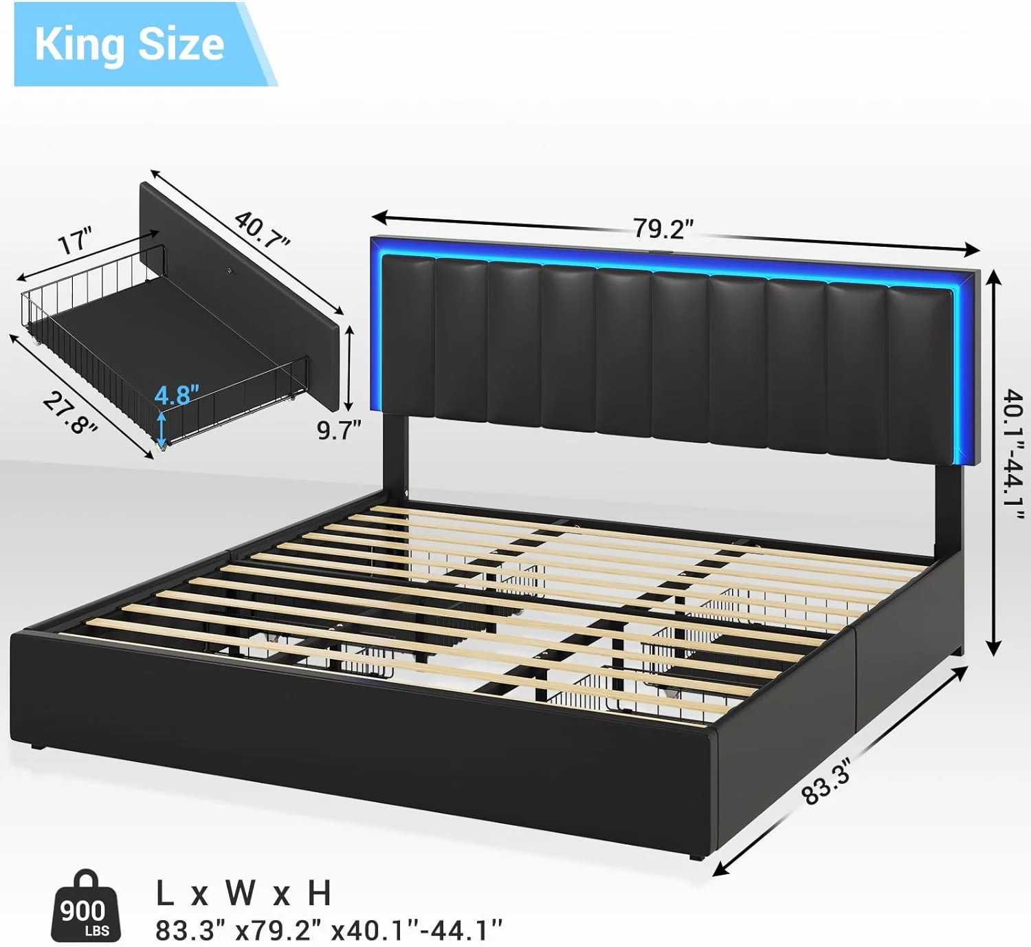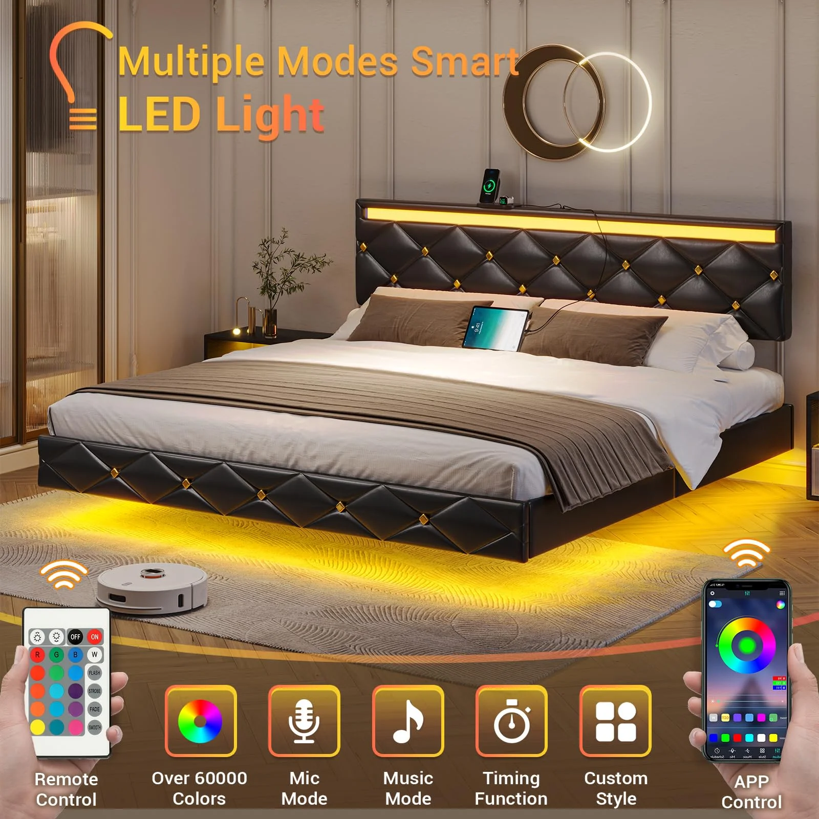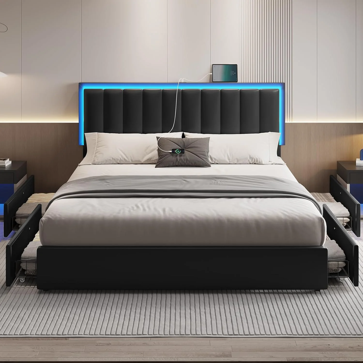 Kallabe King Size Modern Bed Frame with Led Light,Iron Pieces Decor and Faux Leather Headboard, Black & White