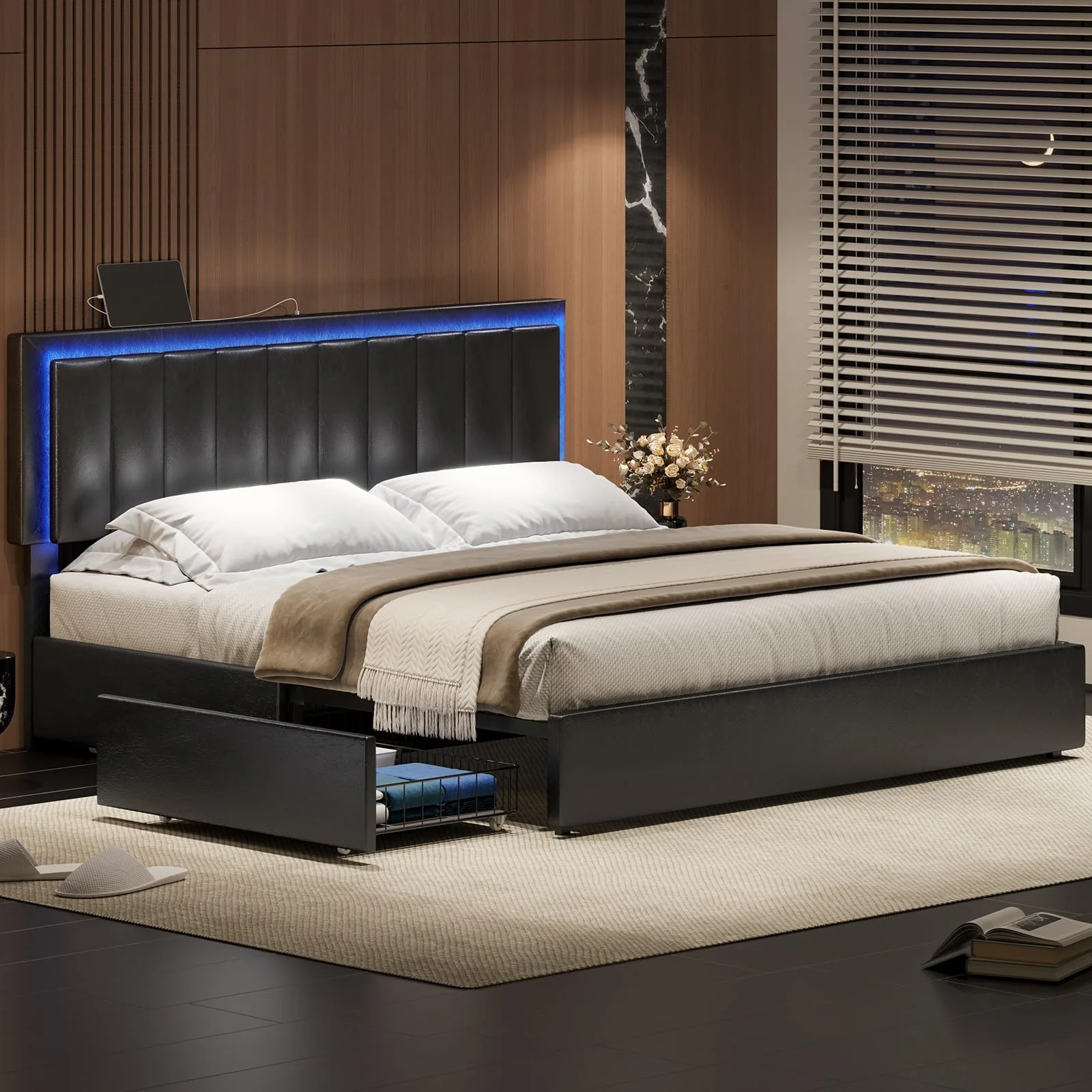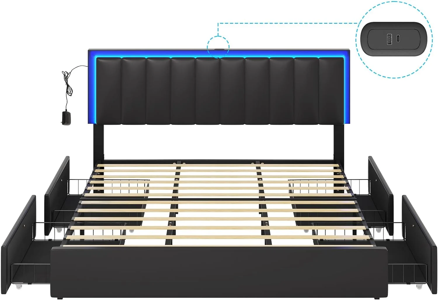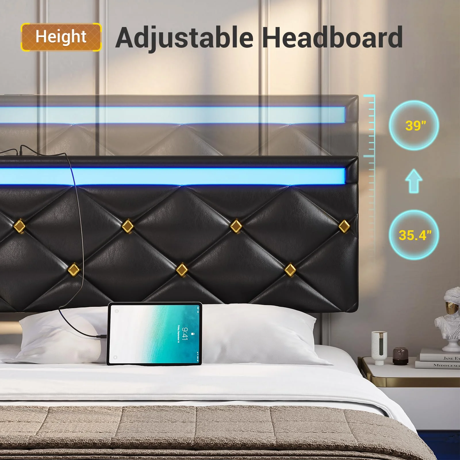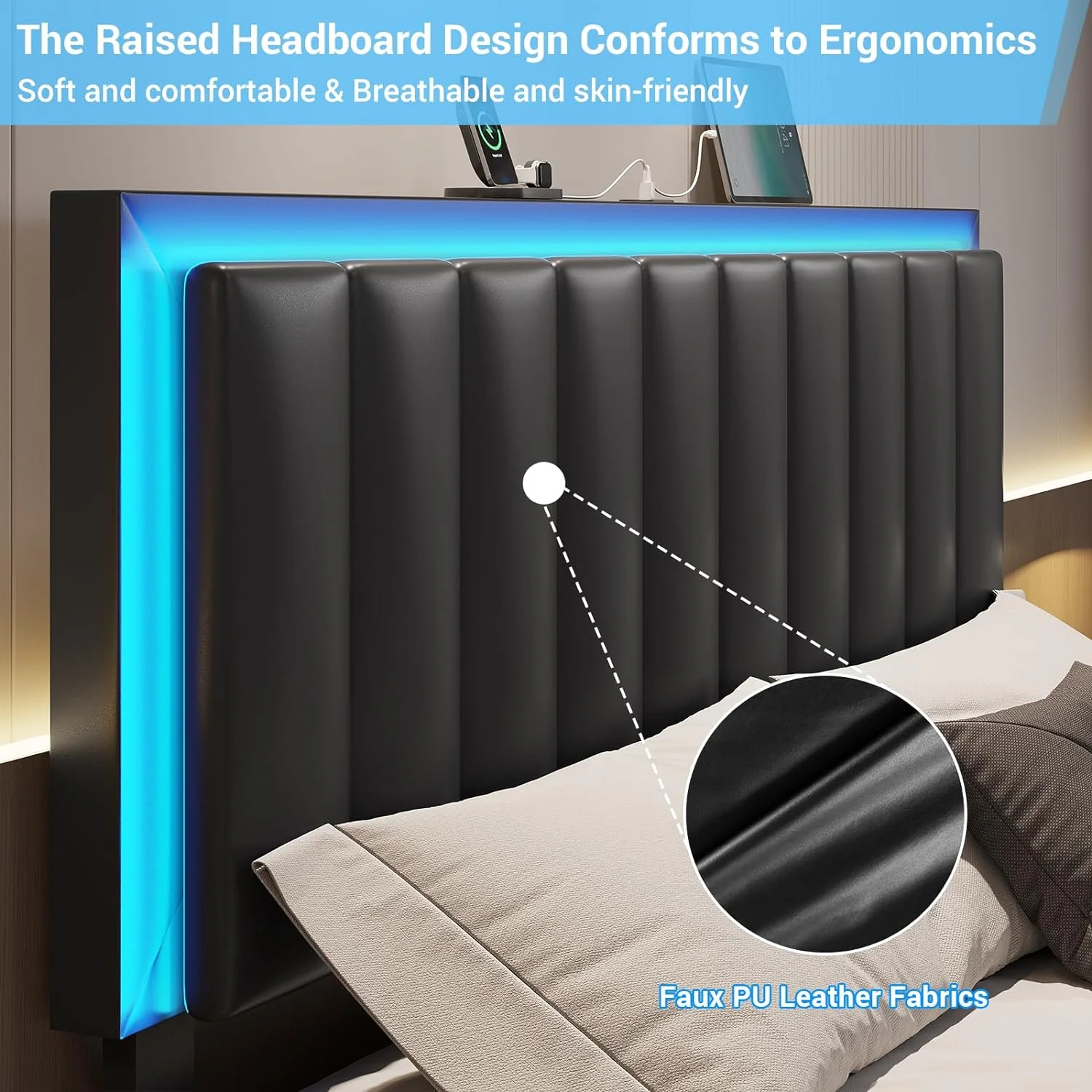 Kallabe King Size Modern Bed Frame with Led Light,Iron Pieces Decor and Faux Leather Headboard, Black & White