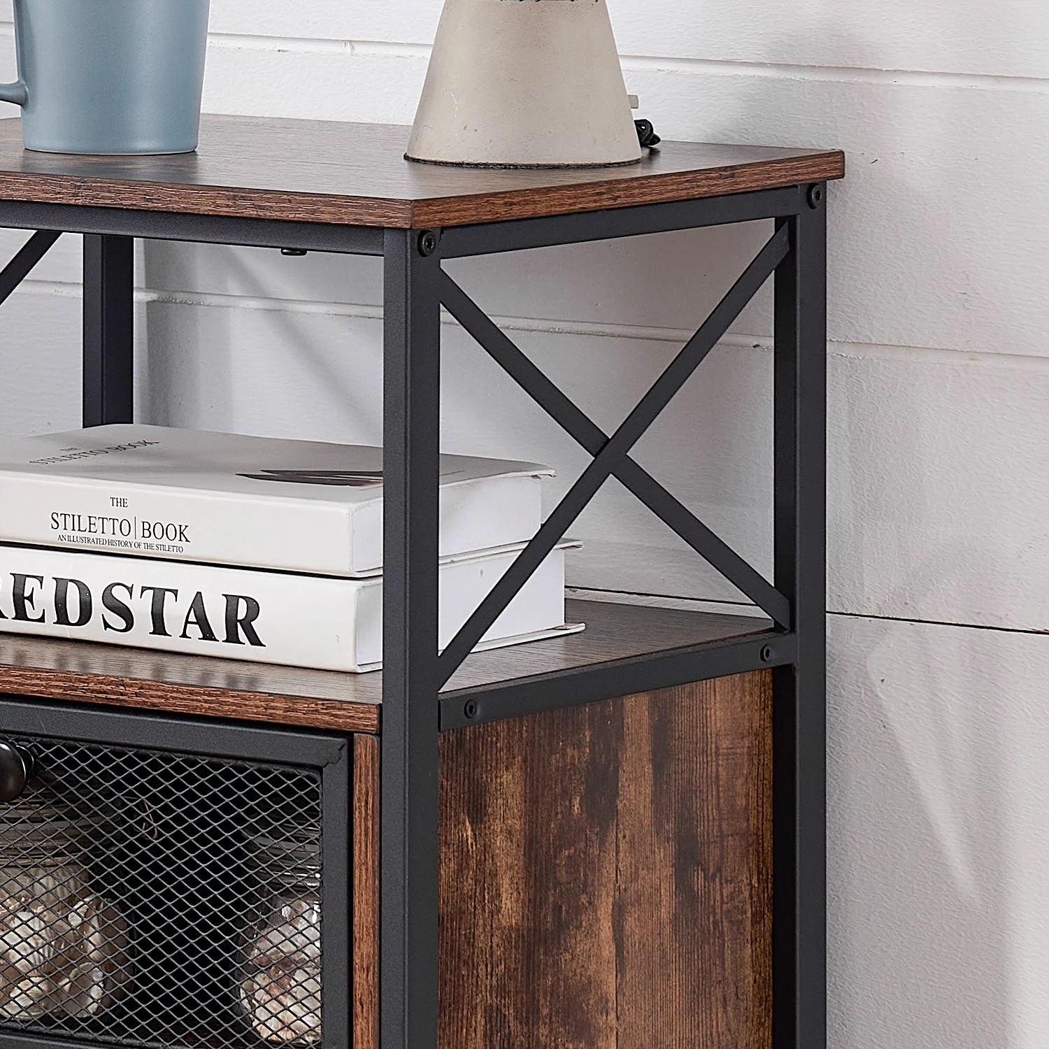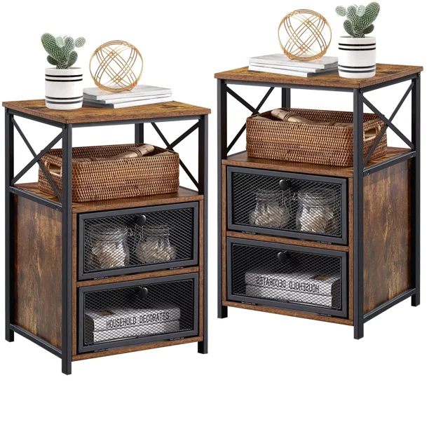 VECELO 3-piece Bedroom Set, Full Size Metal and Wood Platform Bed Frame with Set of 2 Stackable Nightstands End Table