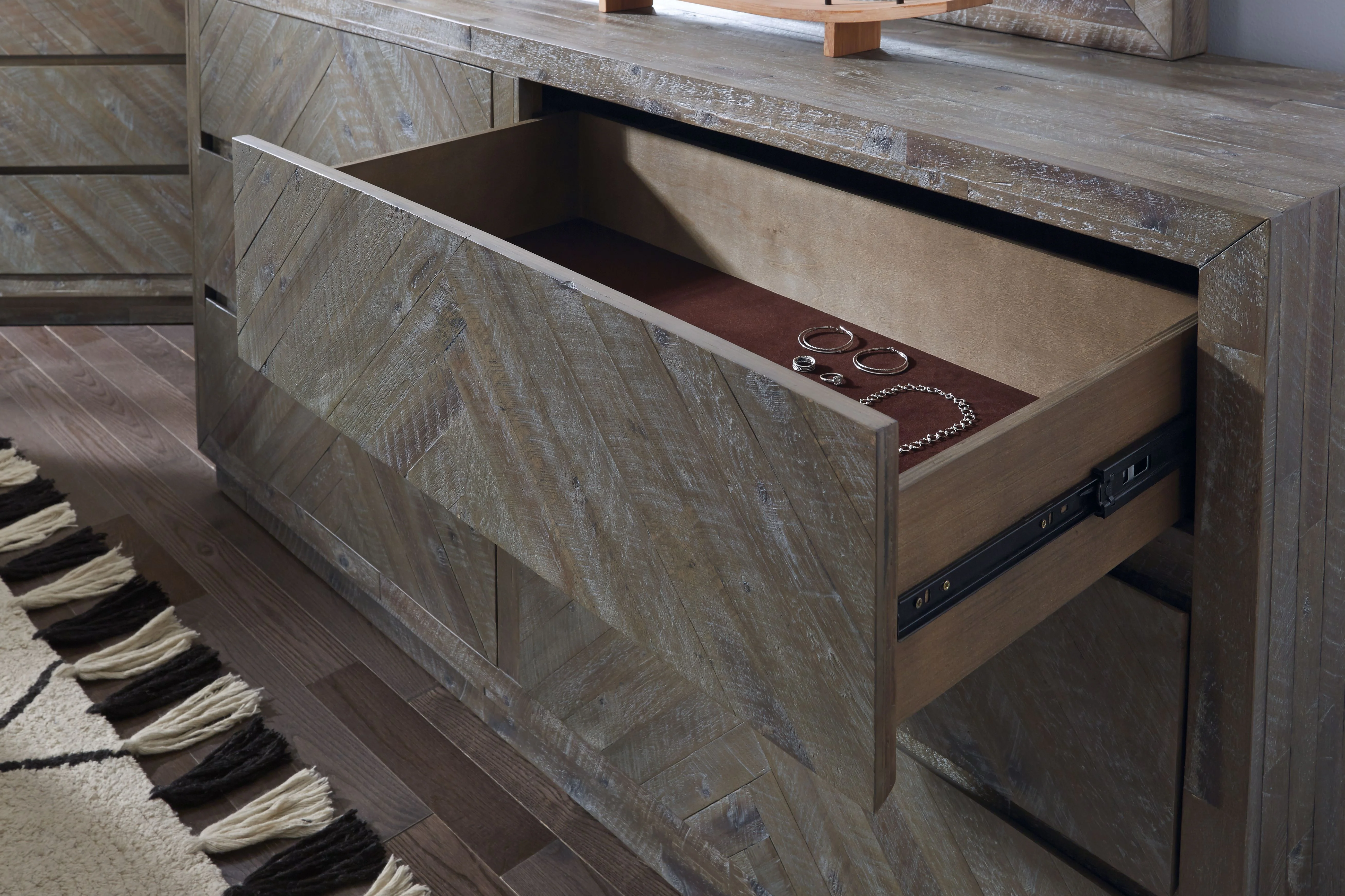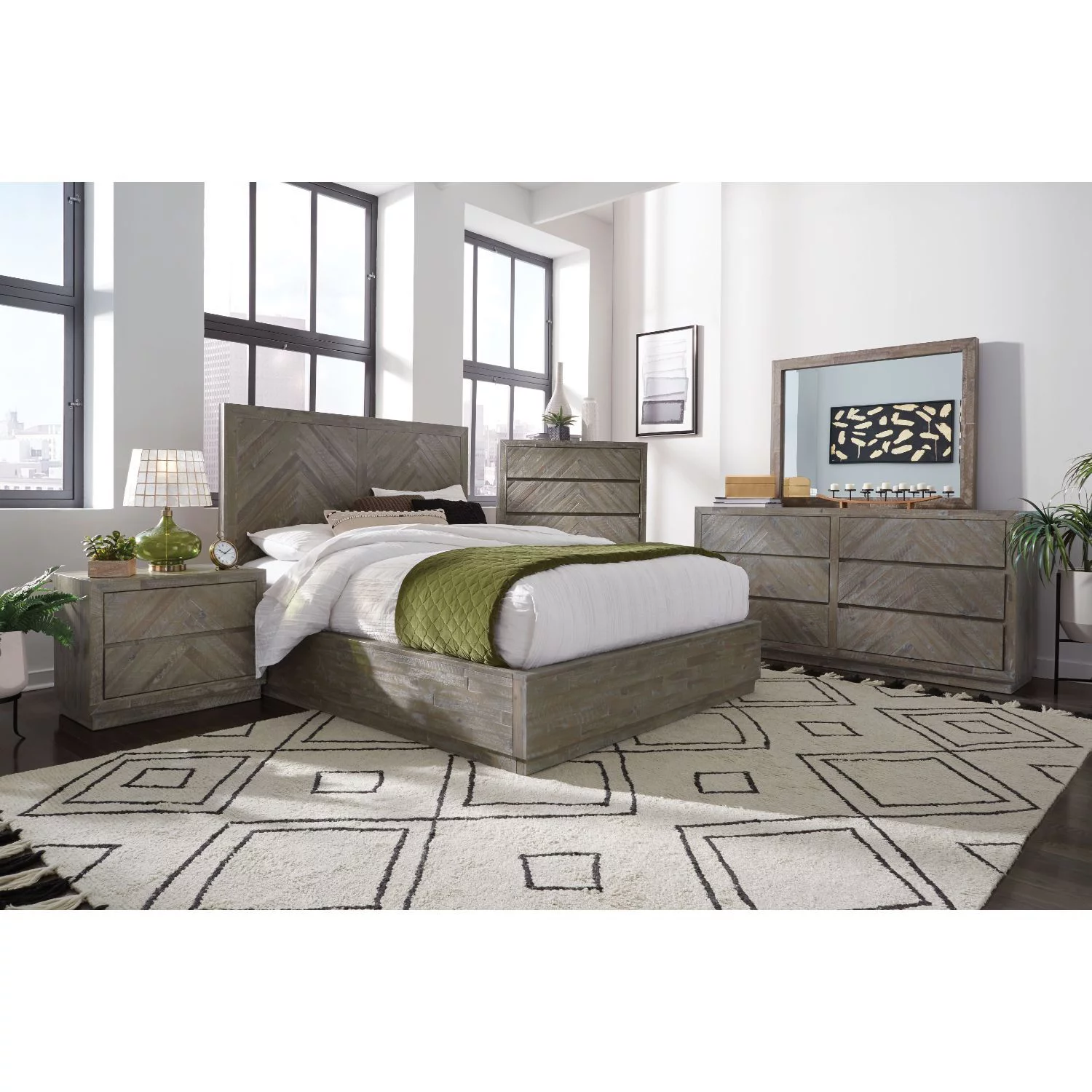 Modus Herringbone 5 PC Full Platform Bedroom Set w 2 Nightstand in Rustic Latte