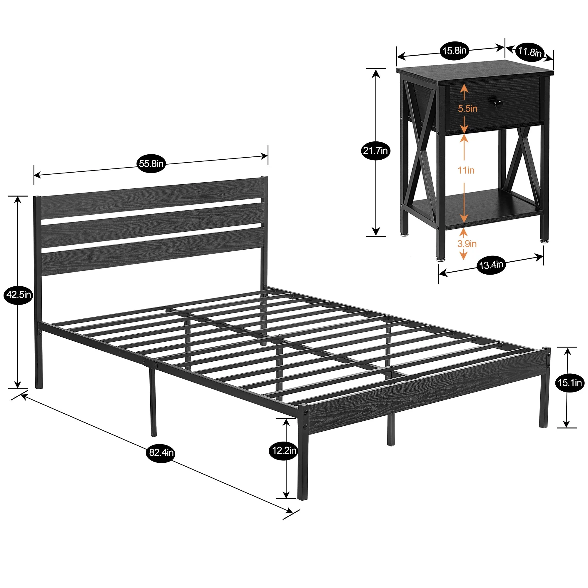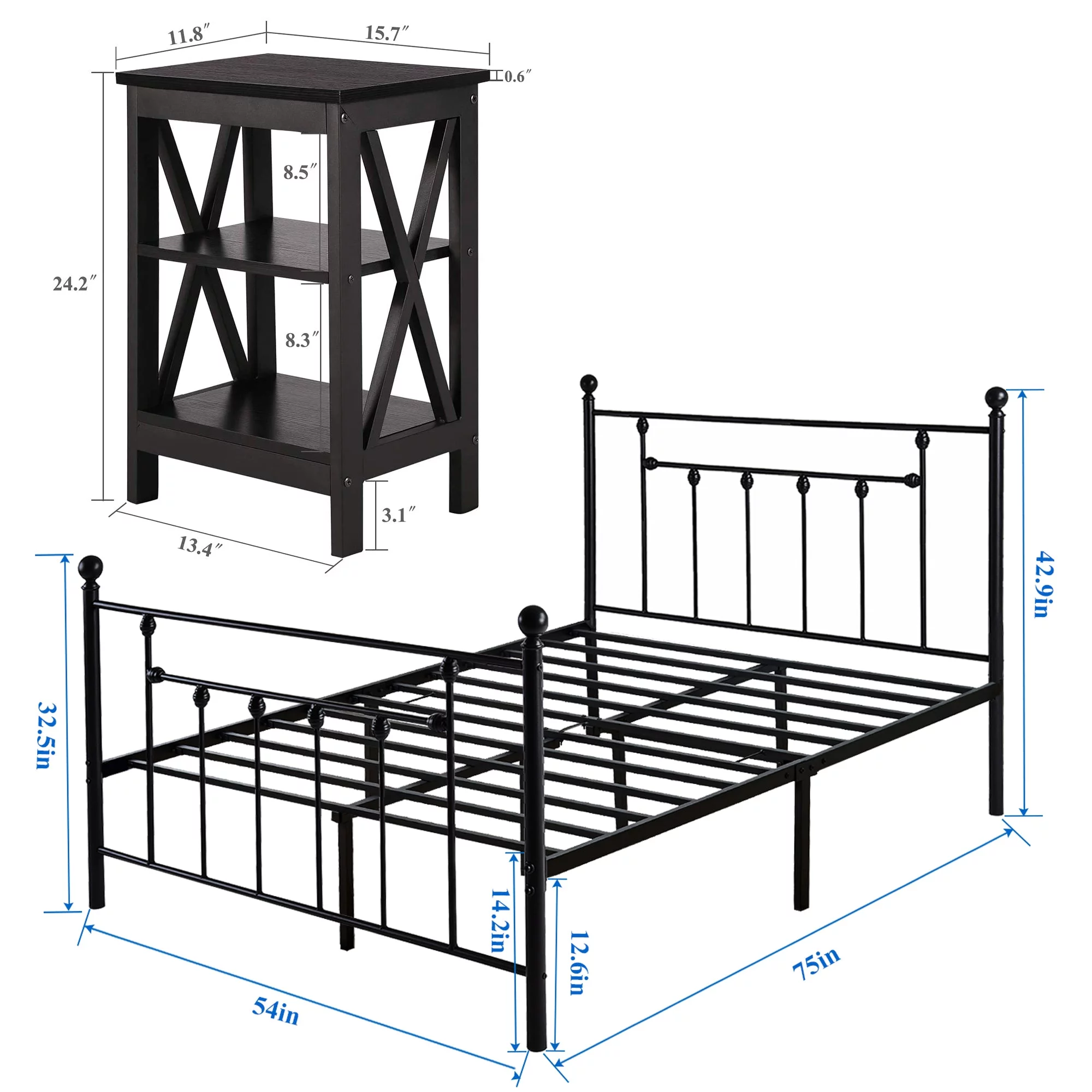 3 Piece Full Size Bedroom Sets Black Metal Bed Frame and 2 Black Nightstands