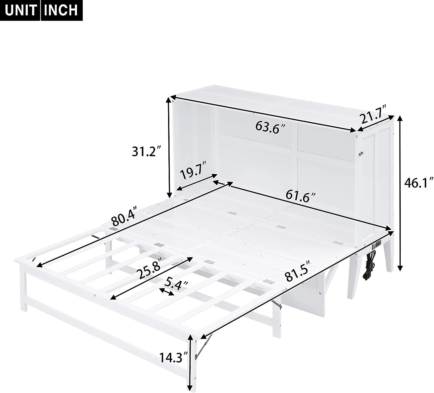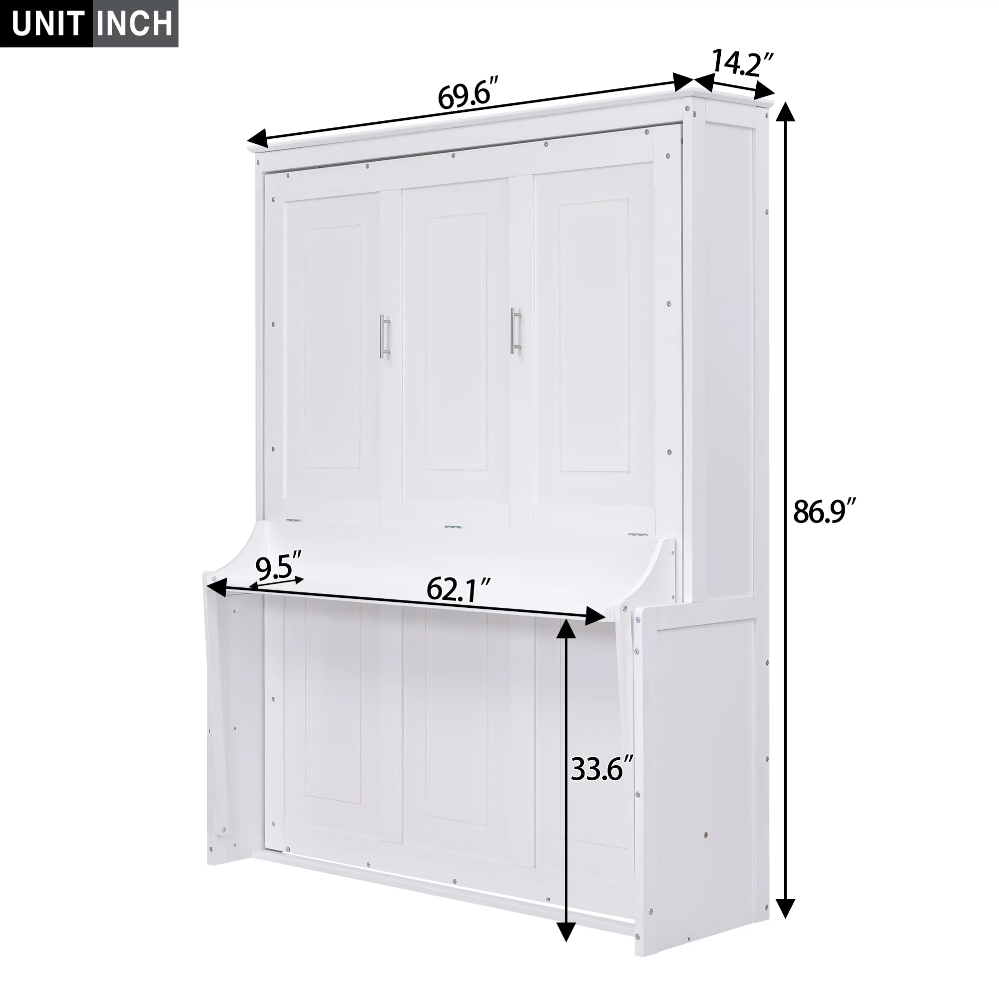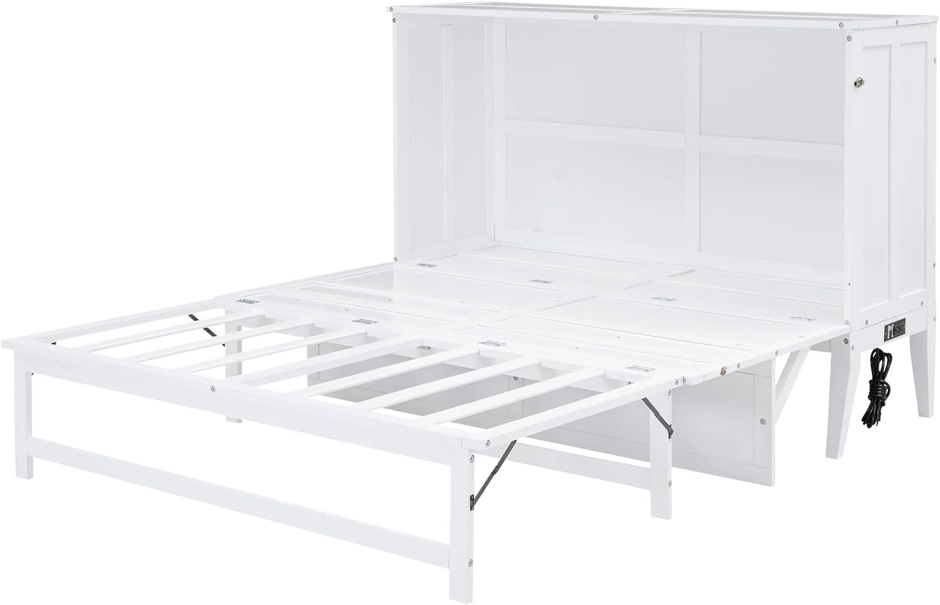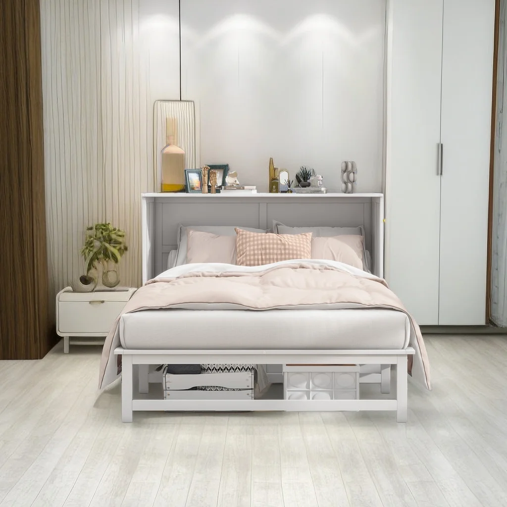 Modern Style White Pine Wood Queen Size Murphy Bed with Drawer, Shelves, Easy Assembly
