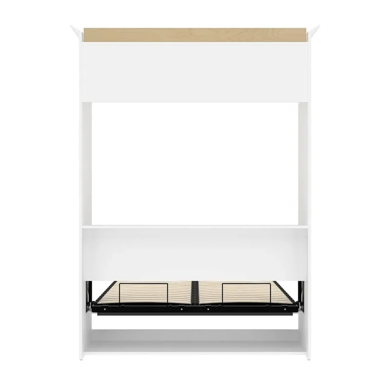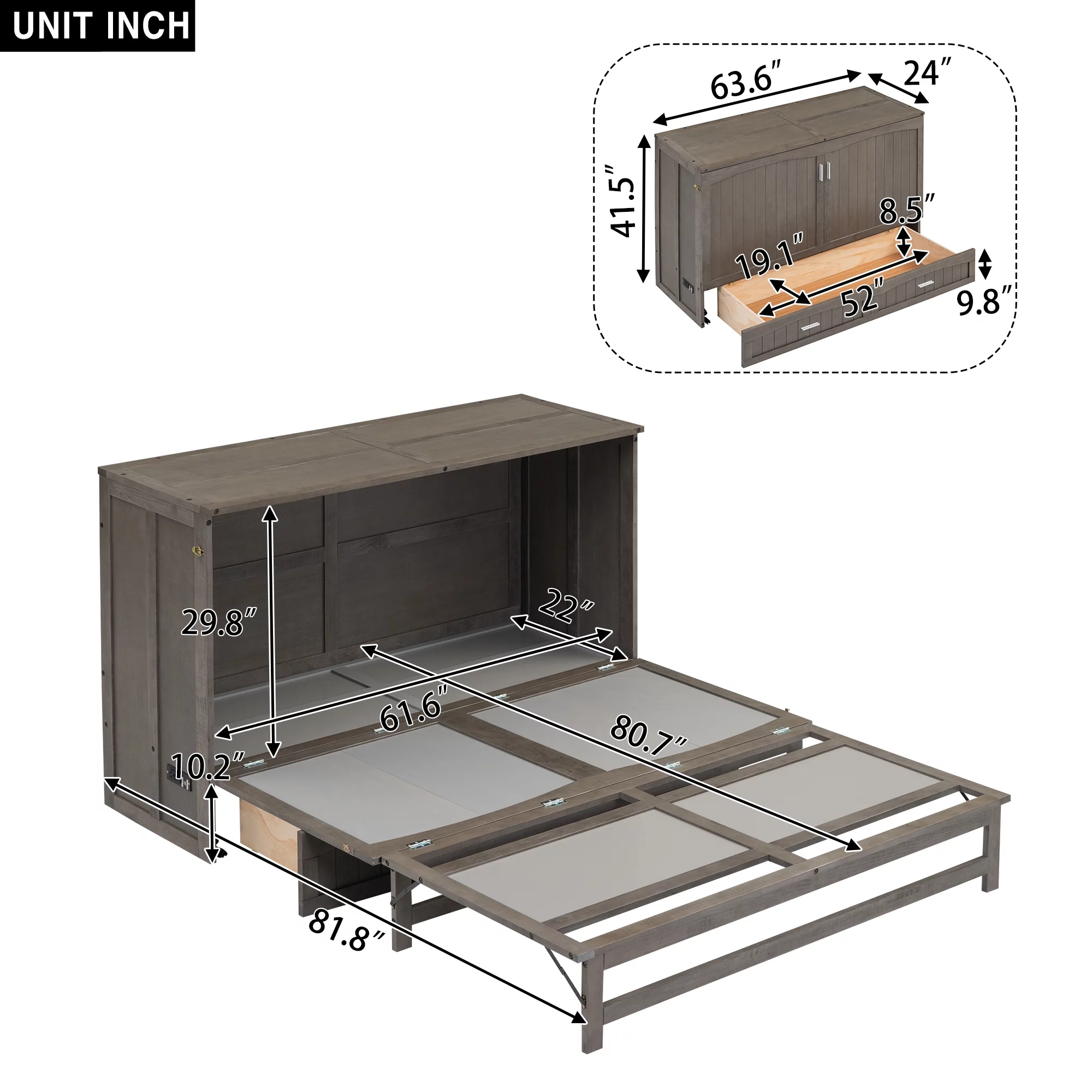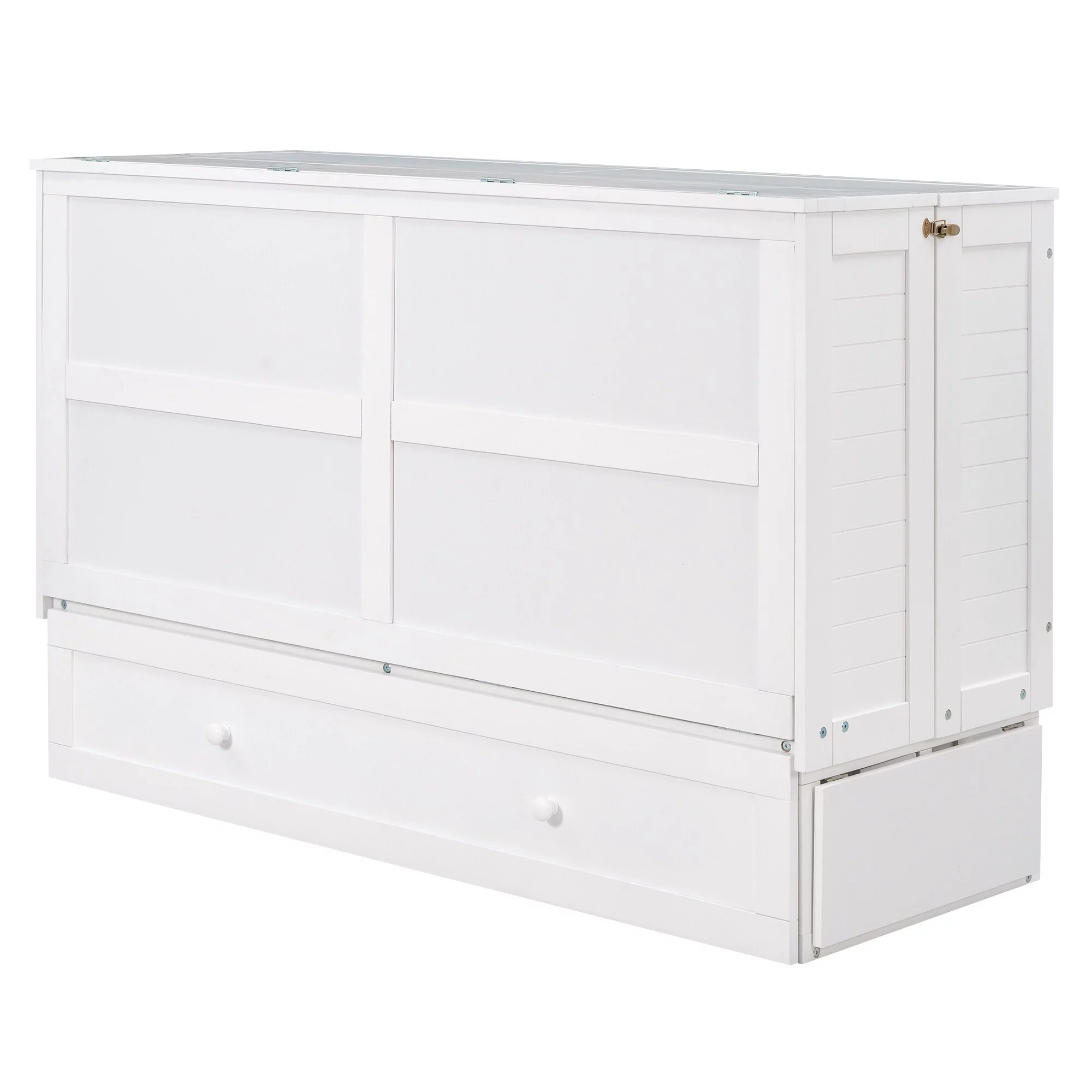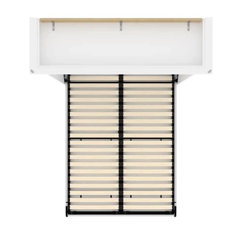 Modern Style White Pine Wood Queen Size Murphy Bed with Drawer, Shelves, Easy Assembly