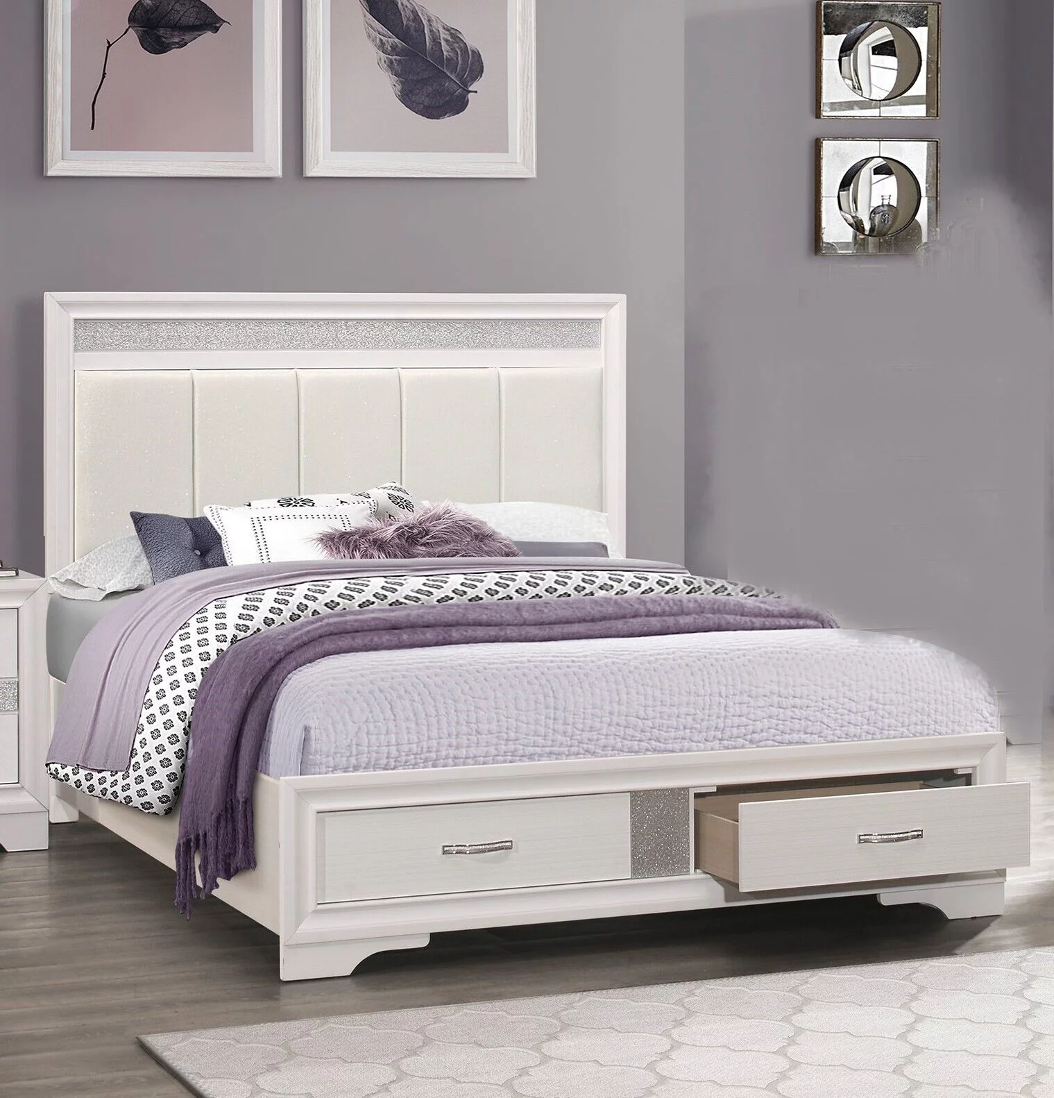 Glamorous White and Silver Glitter 1pc California King Platform Bed Storage Drawers Upholstered Headboard