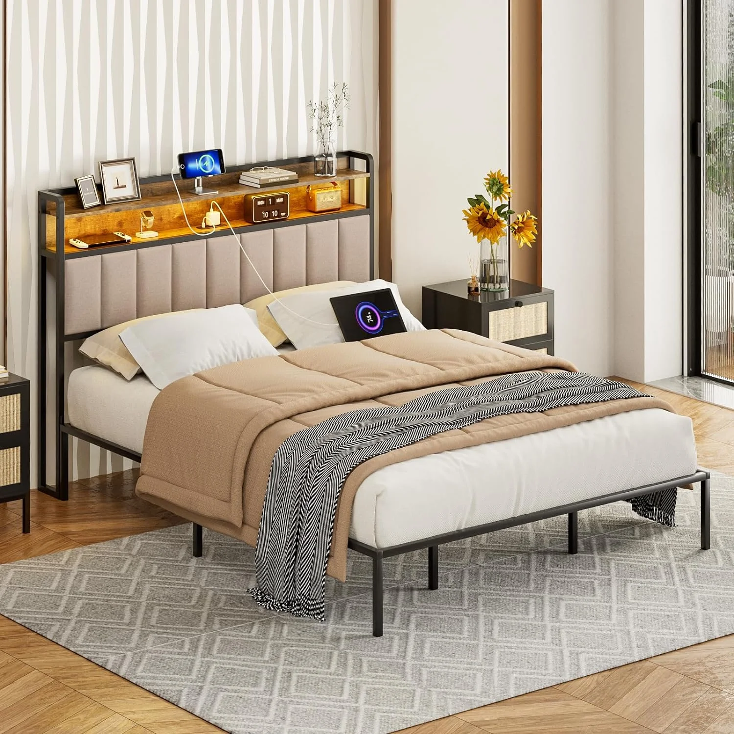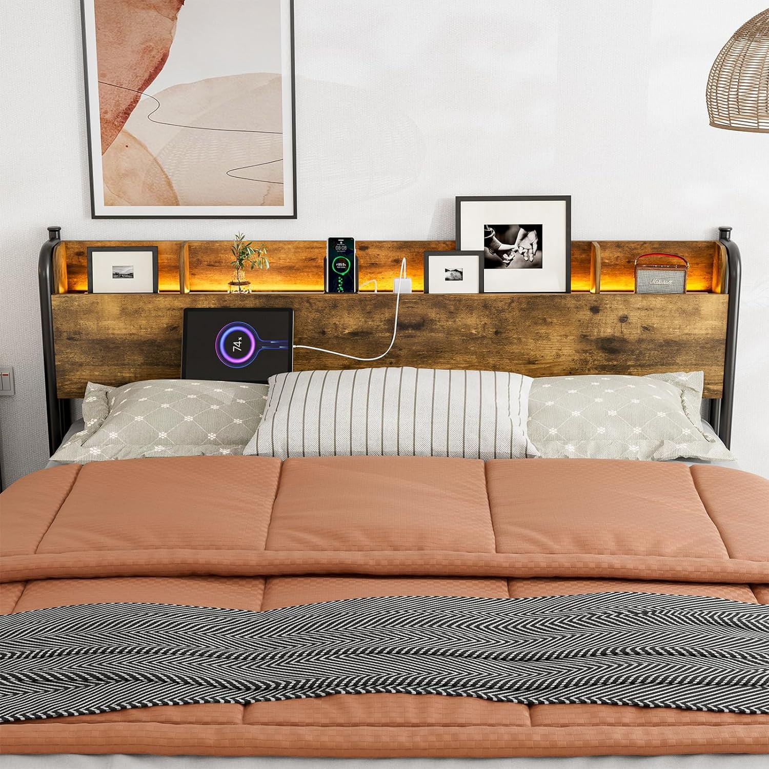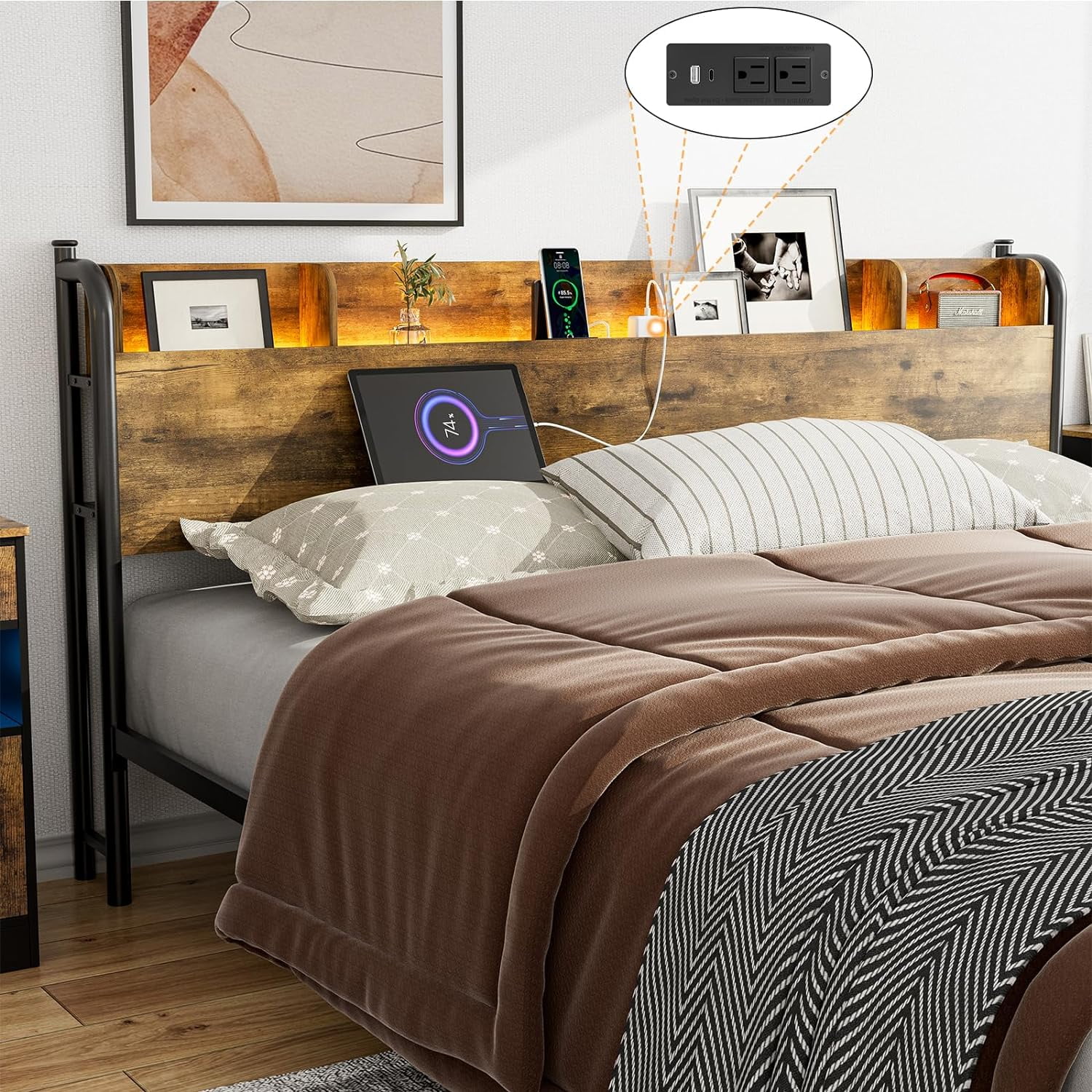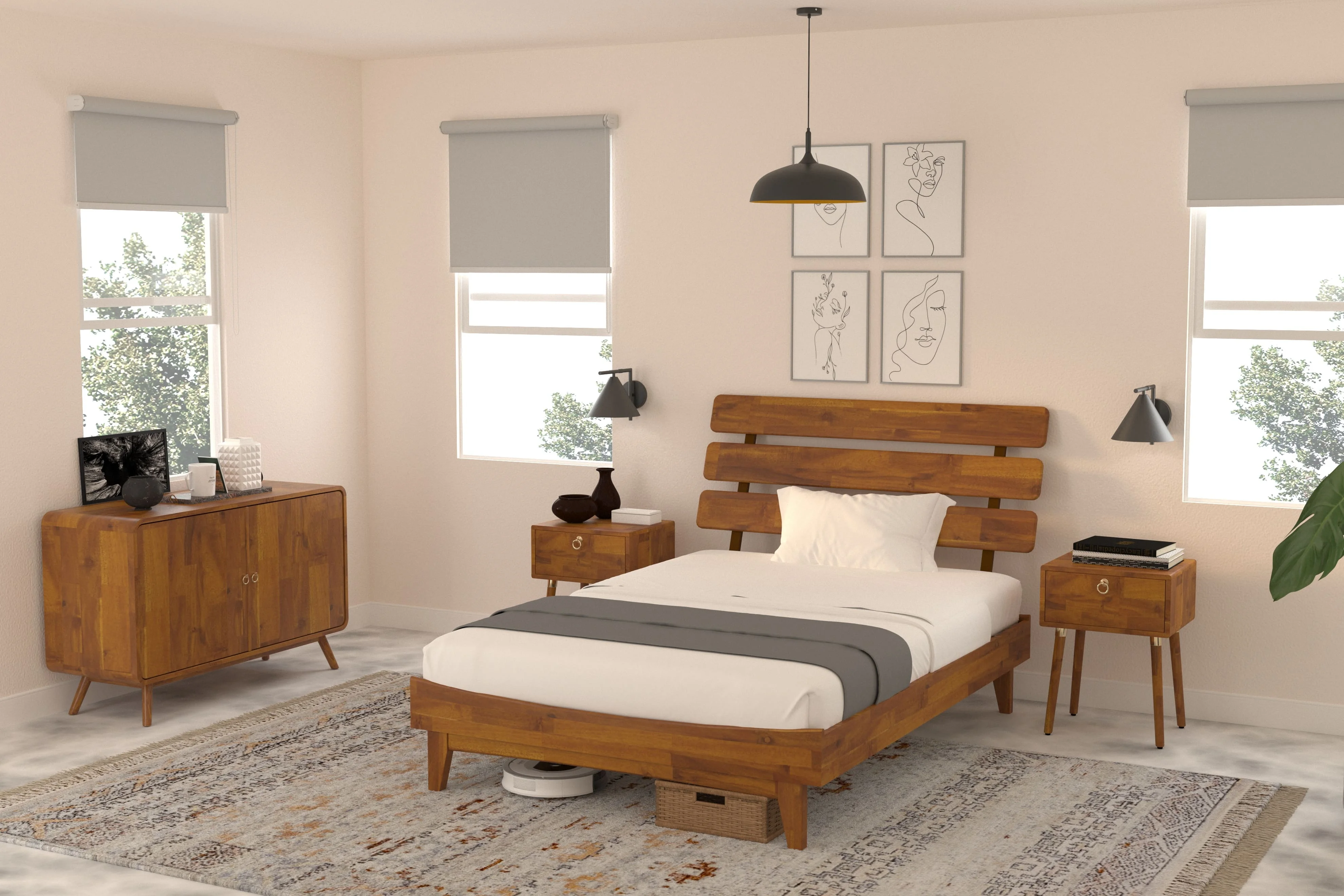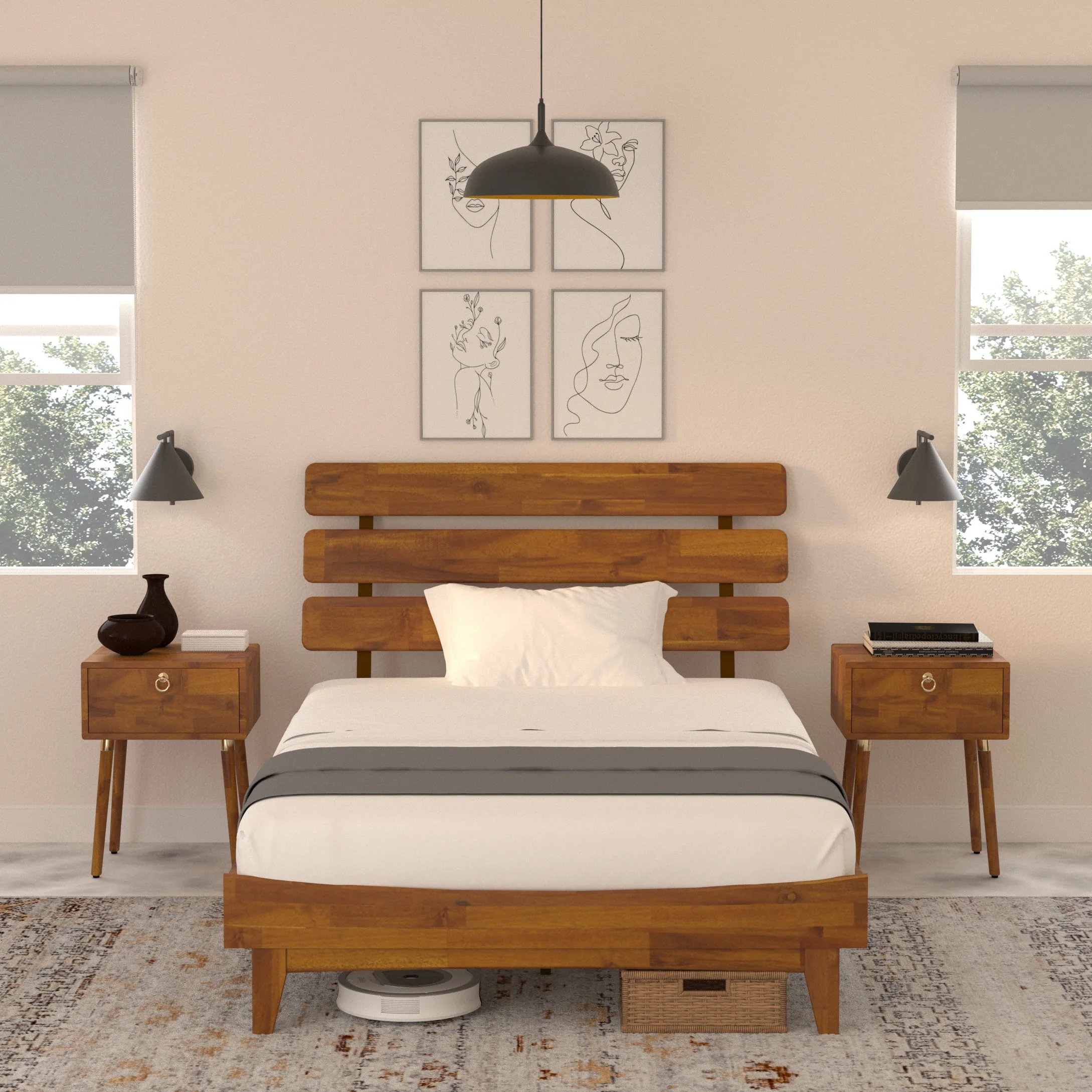 BME Dalen 45" Full Bed Frame, Adjustable Headboard, Mid-Century, Solid Wood, Caramel