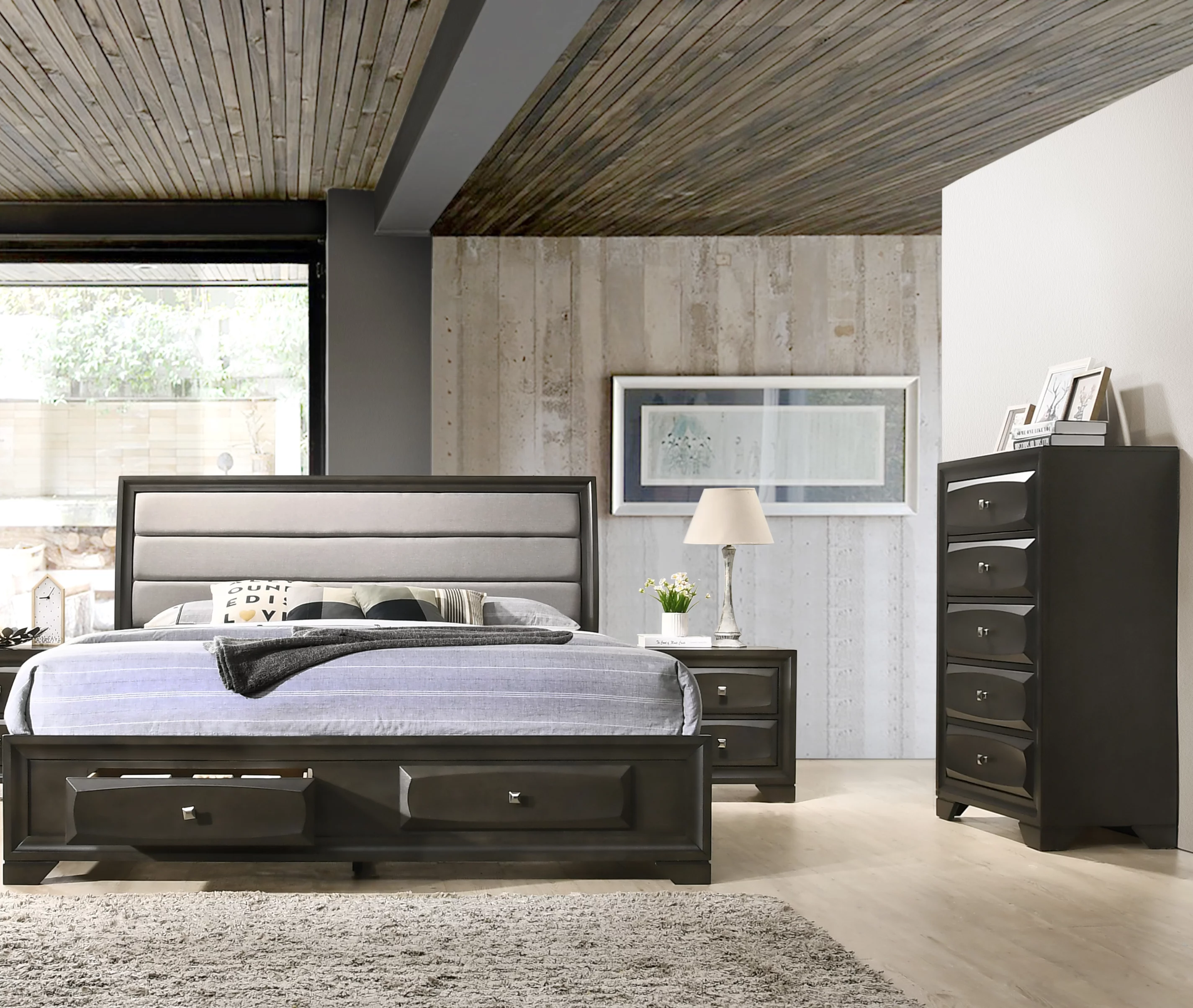 Asger Wood Bedroom Set with Upholstered Storage Bed, Dresser, Mirror, Nightstand, Chest, Queen Size, Antique Gray Finish