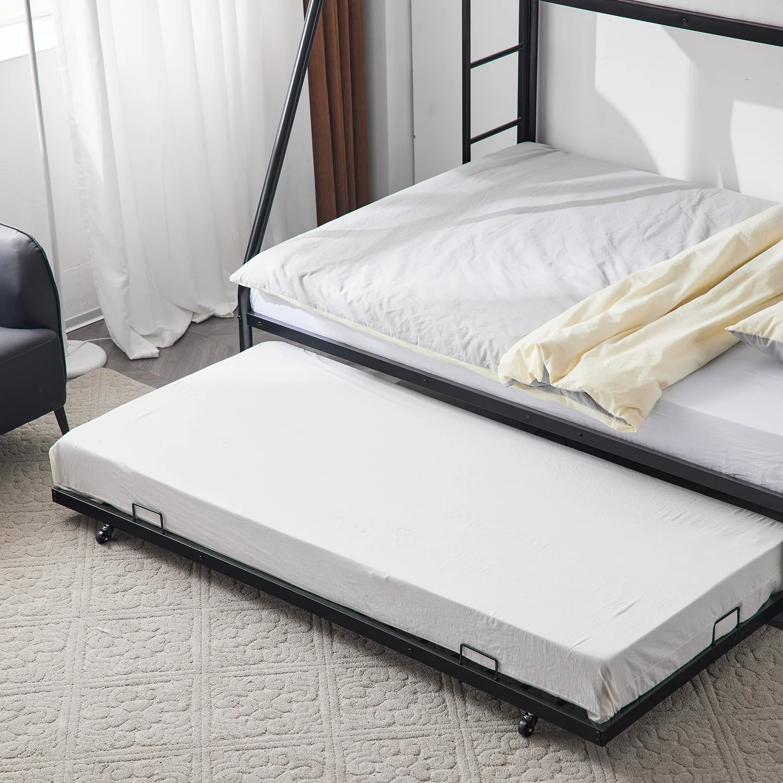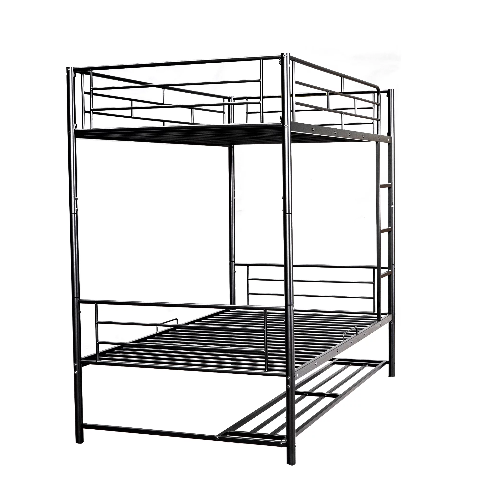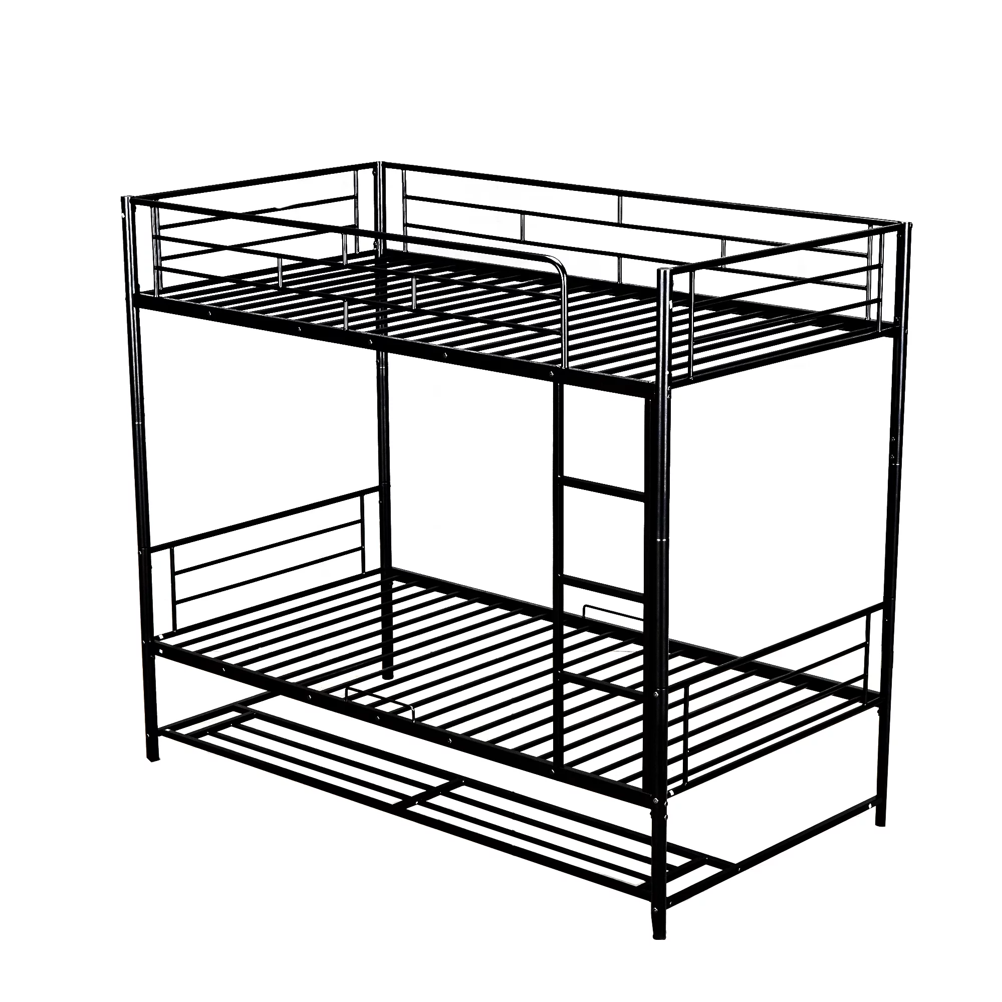 Kids Metal Twin over Twin Bunk Bed with Trundle, Ladder and Guardrails, Black