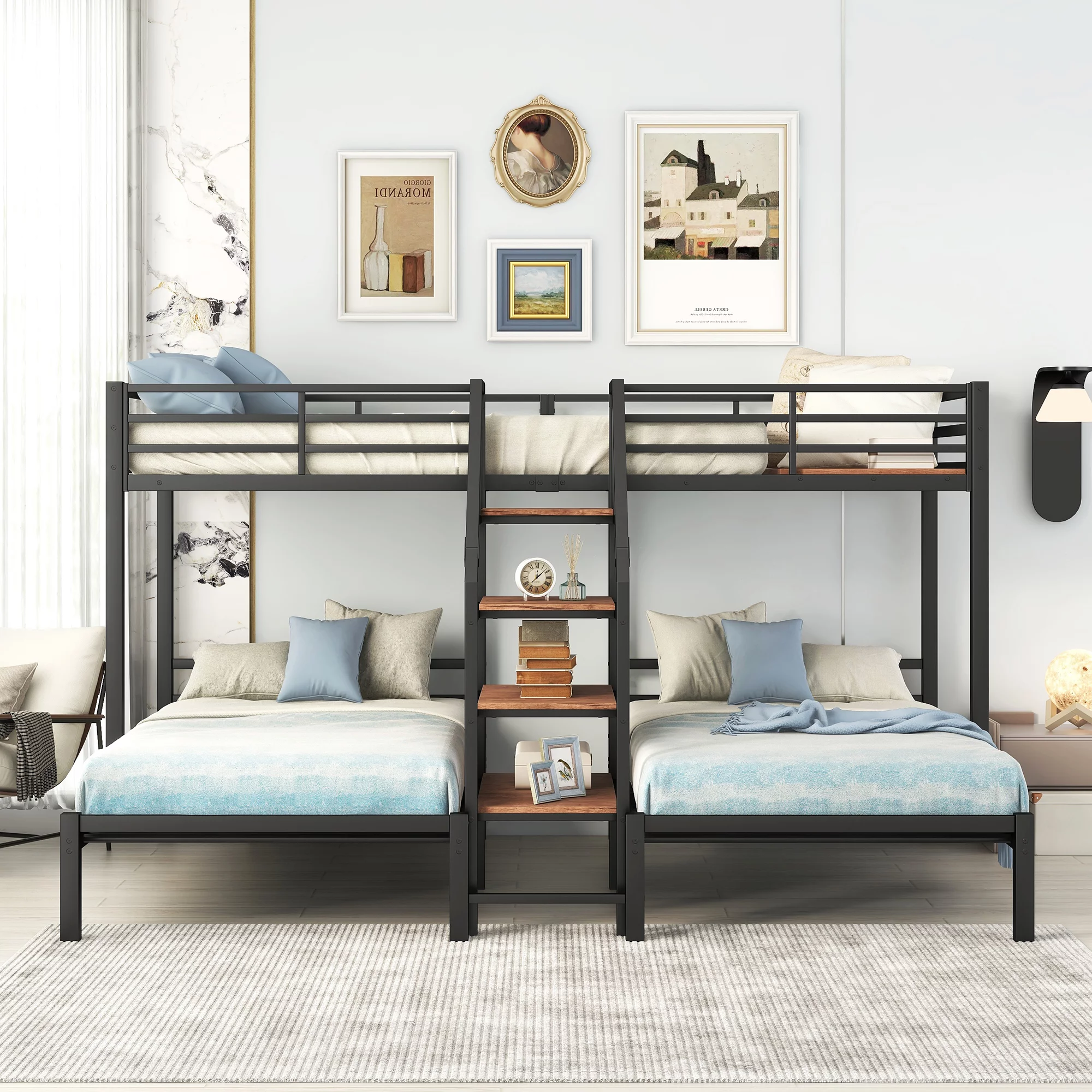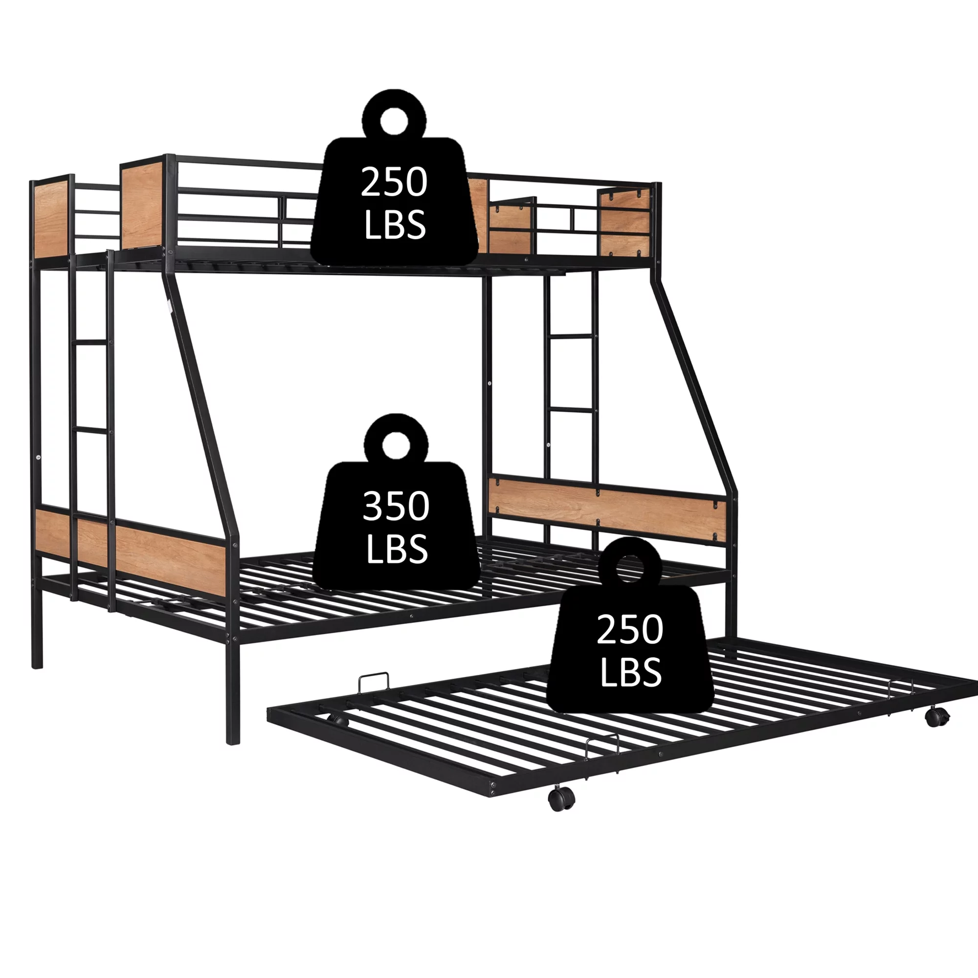 Gewnee Twin Over Full Metal Bunk Bed with Trundle and Two Ladders for Kids Room, Black