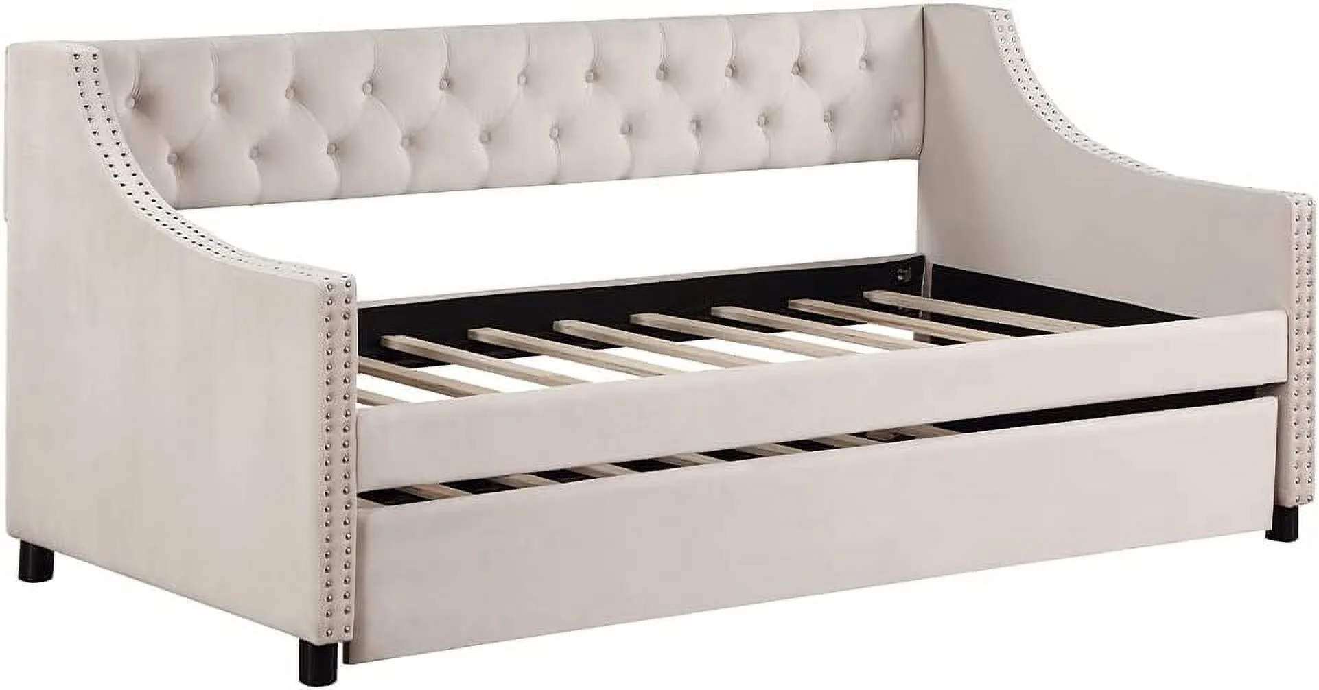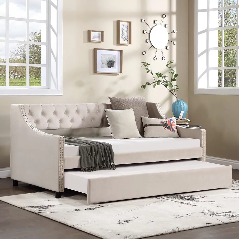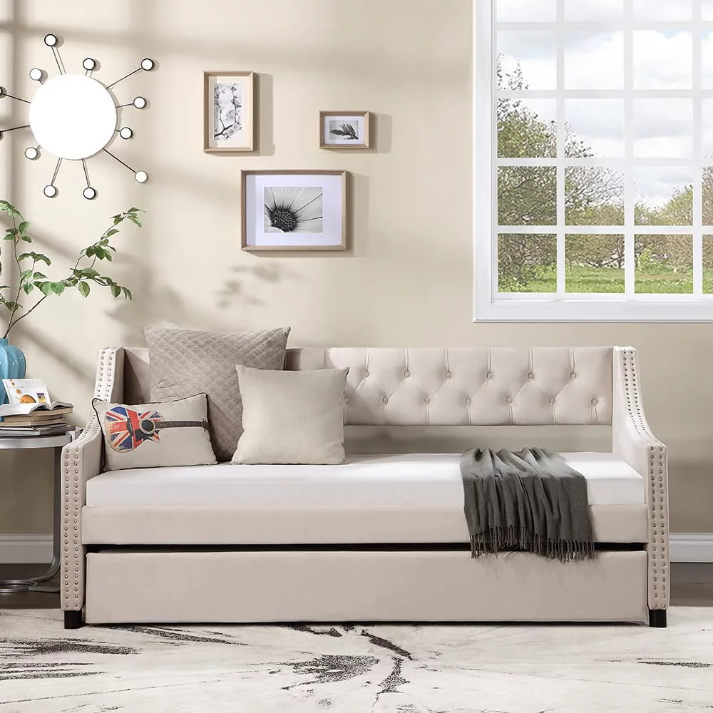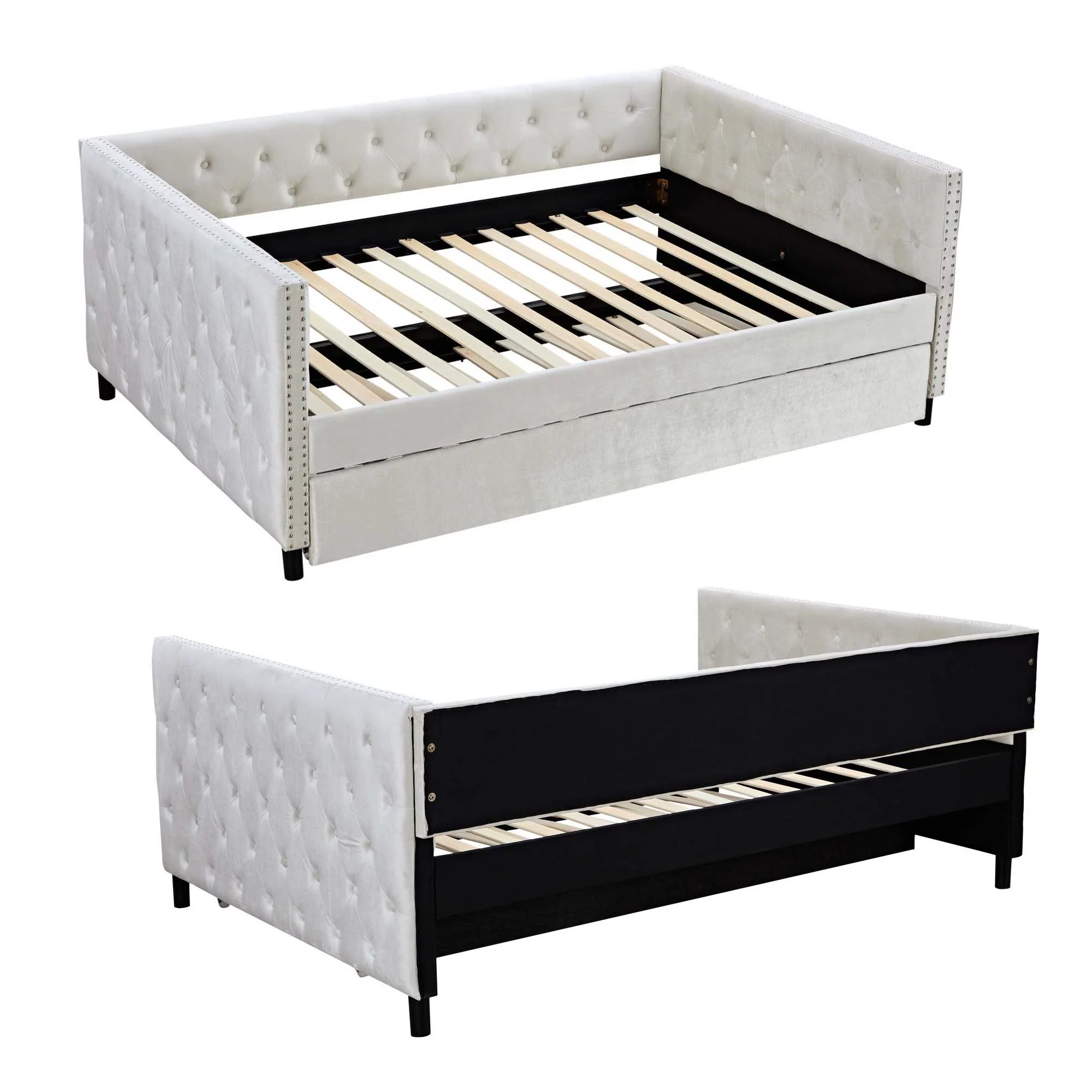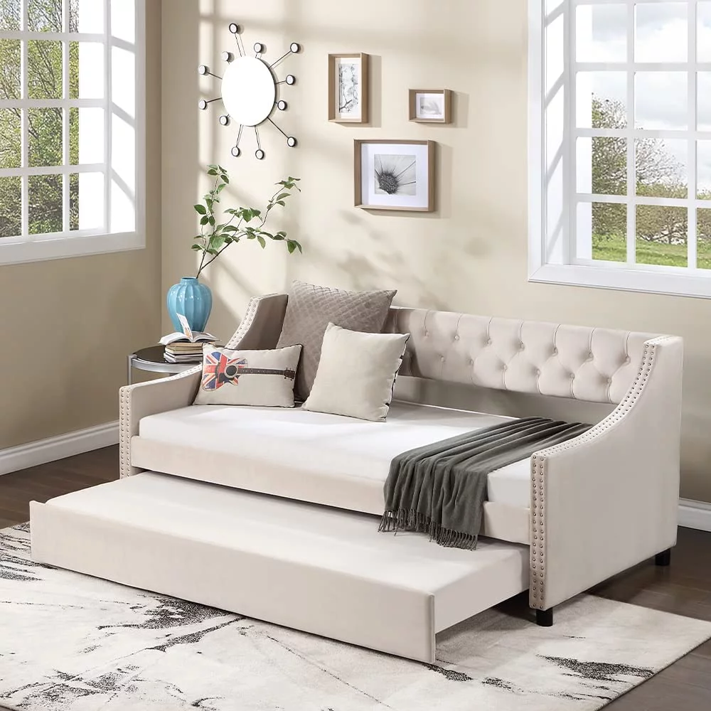 Aukfa Upholstered Daybed with Trundle, Full Size Daybed for Livingroom, Bedroom, Button Tufted - Beige