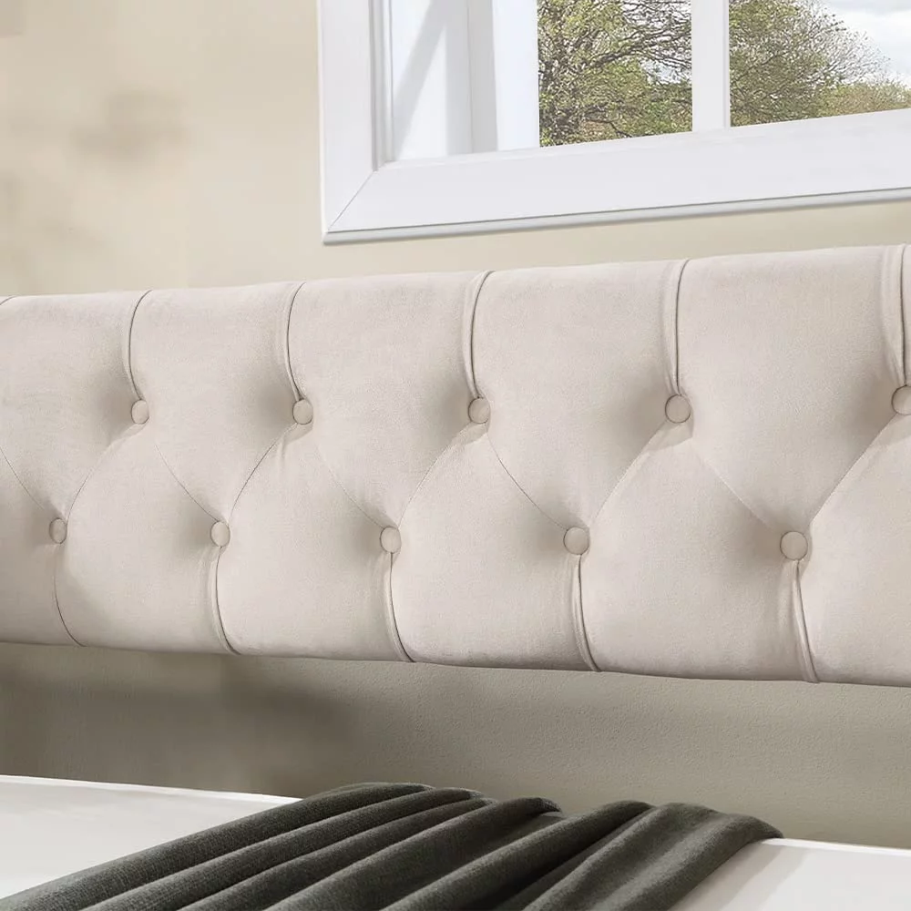 Upholstery Scalloped Bem California King Size Bed with Arched Headboard, Cream & Light Gray