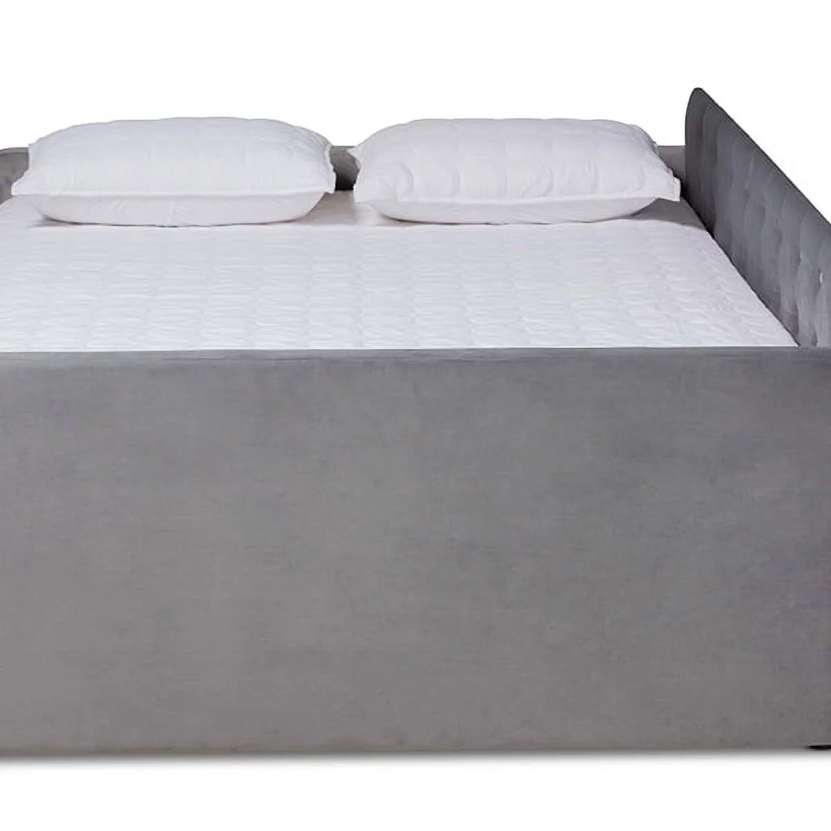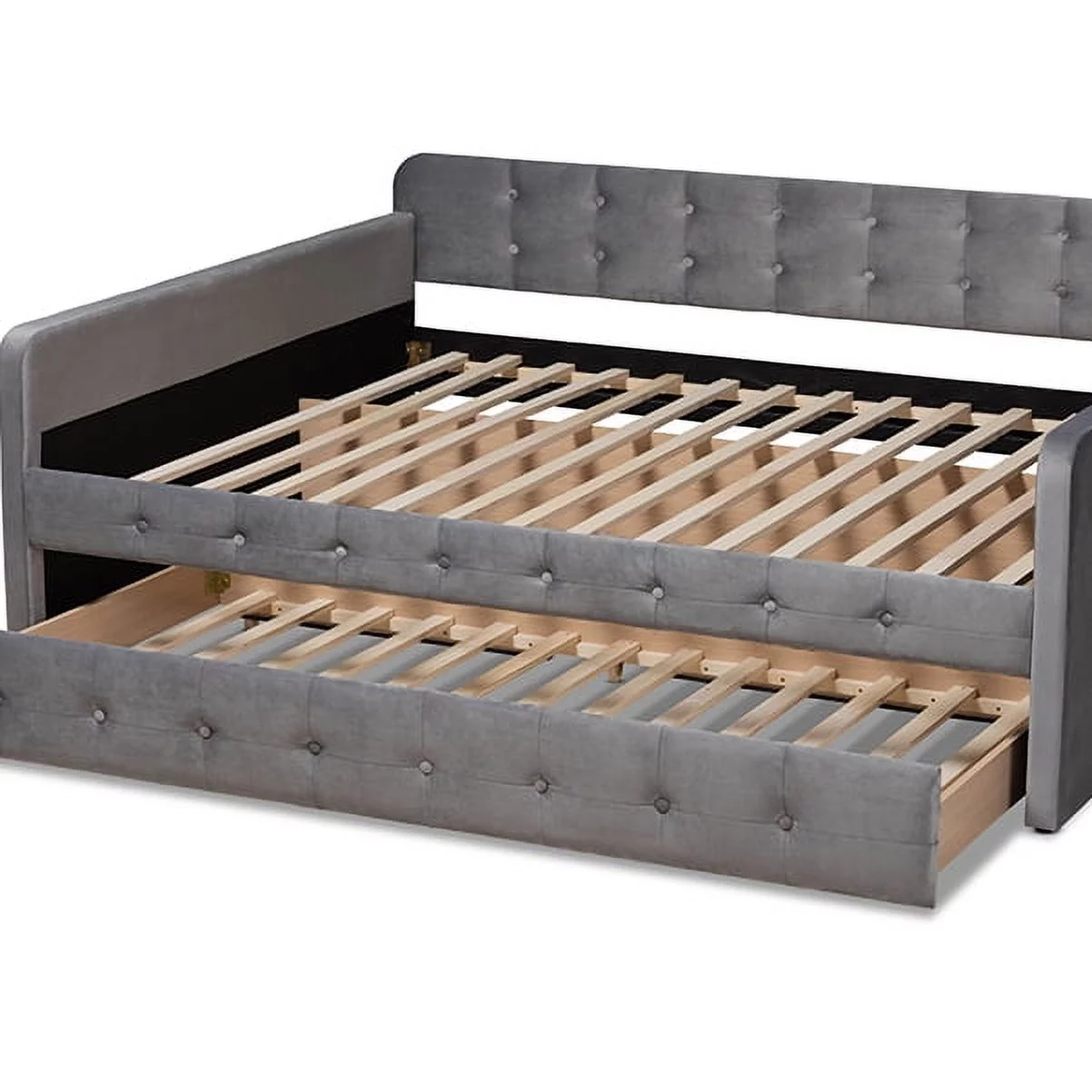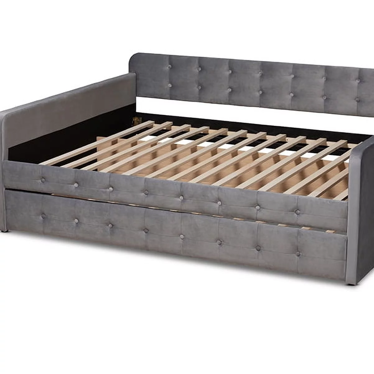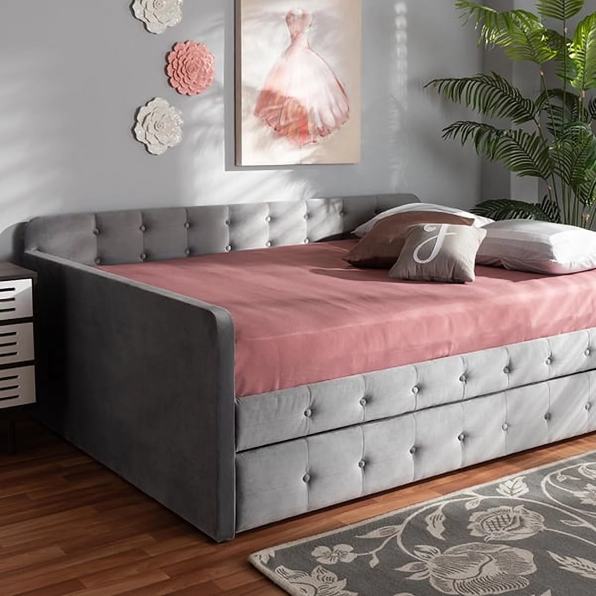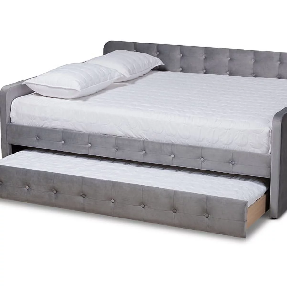 Jona Modern and Contemporary Transitional Grey Velvet Fabric Upholstered and Button Tufted Full Size Daybed with Trundle