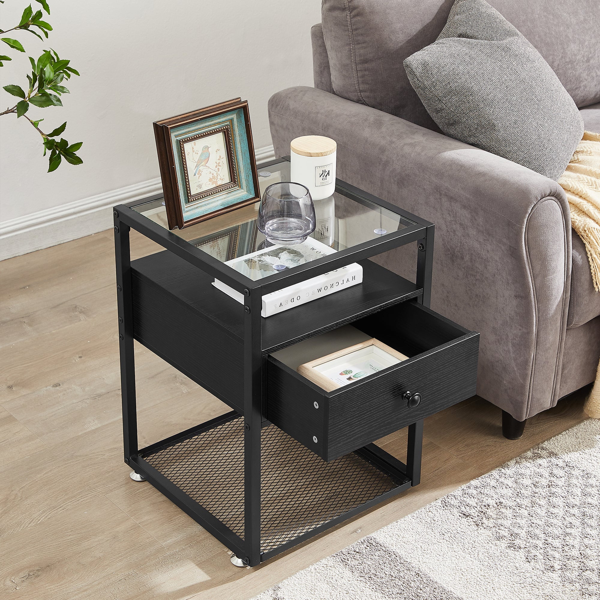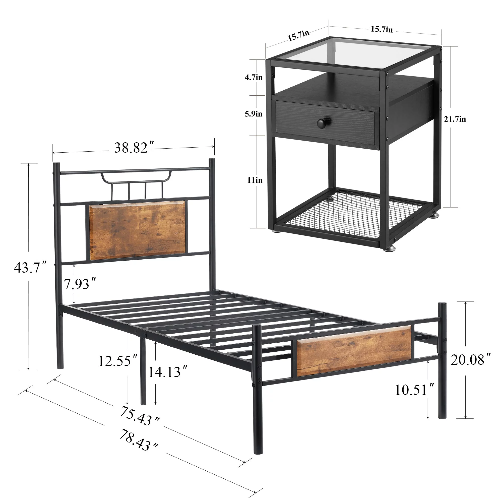 VECELO 3-Piece Twin Bedroom Set, Metal Platform Bed Frame and 2 Glass Top Nightstands