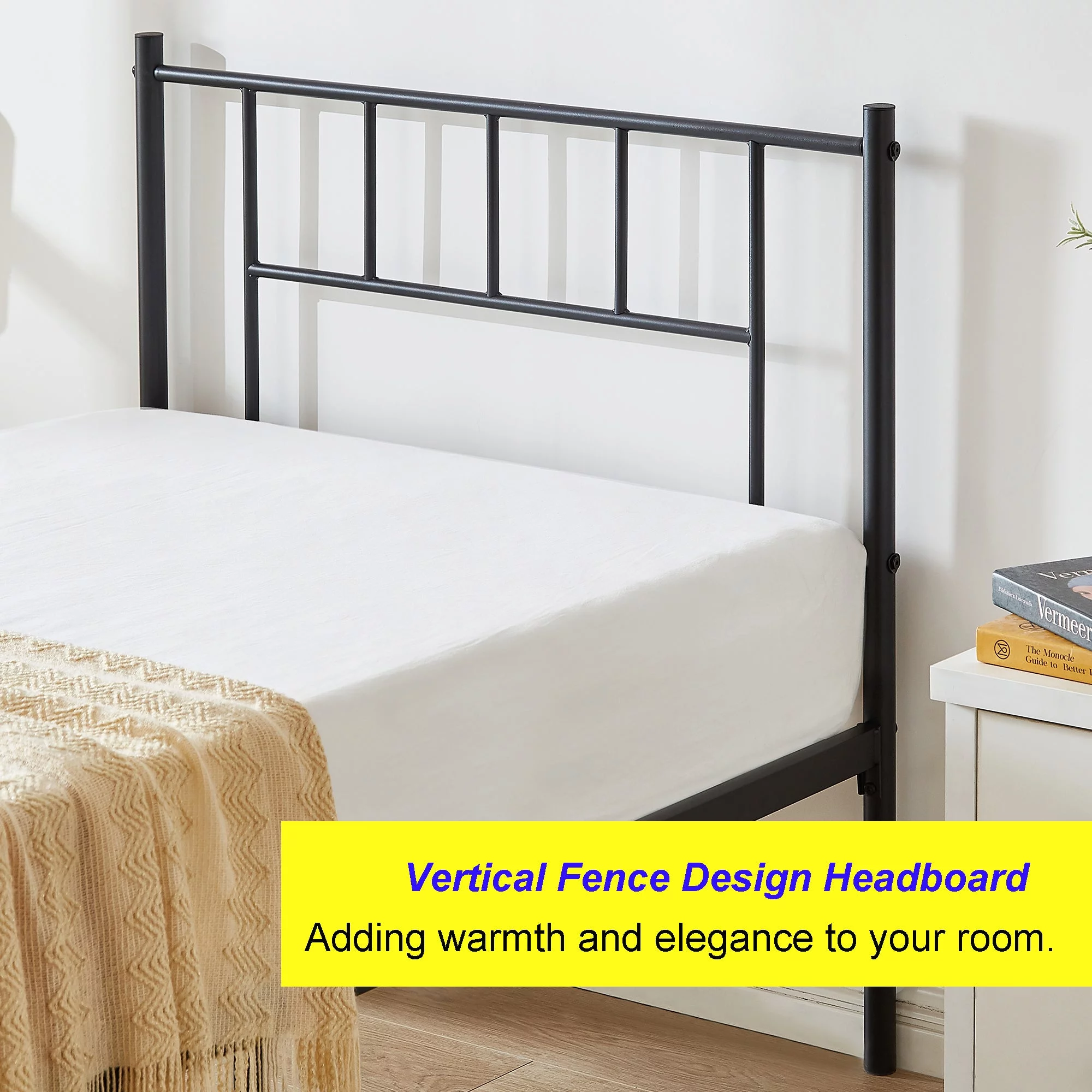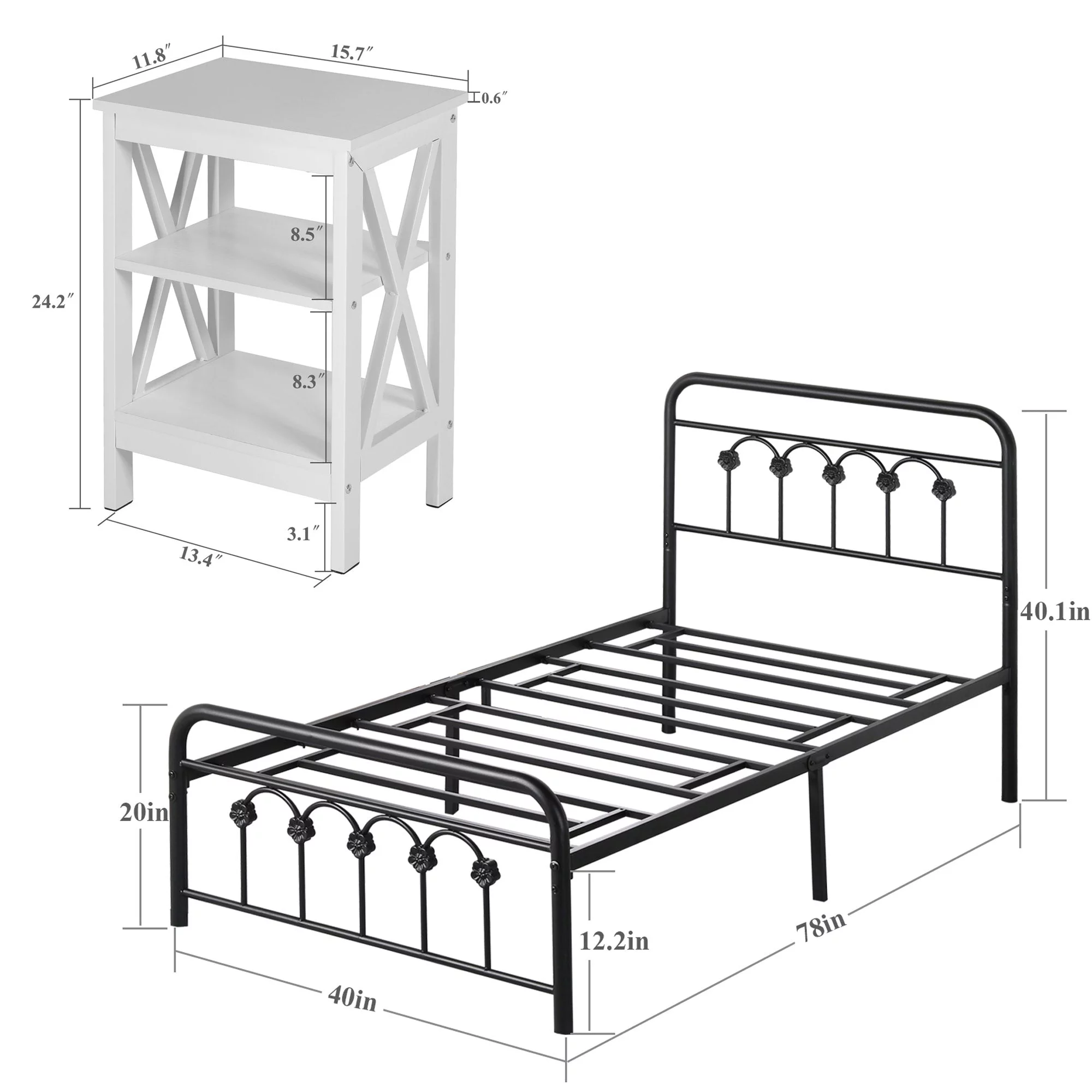 VECELO 3 Piece Bedroom Set with Twin Metal Bed Frame and 2 White Nightstands