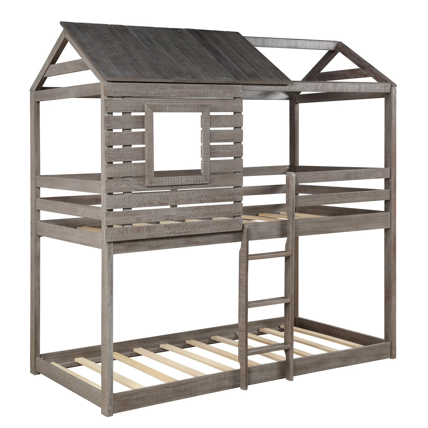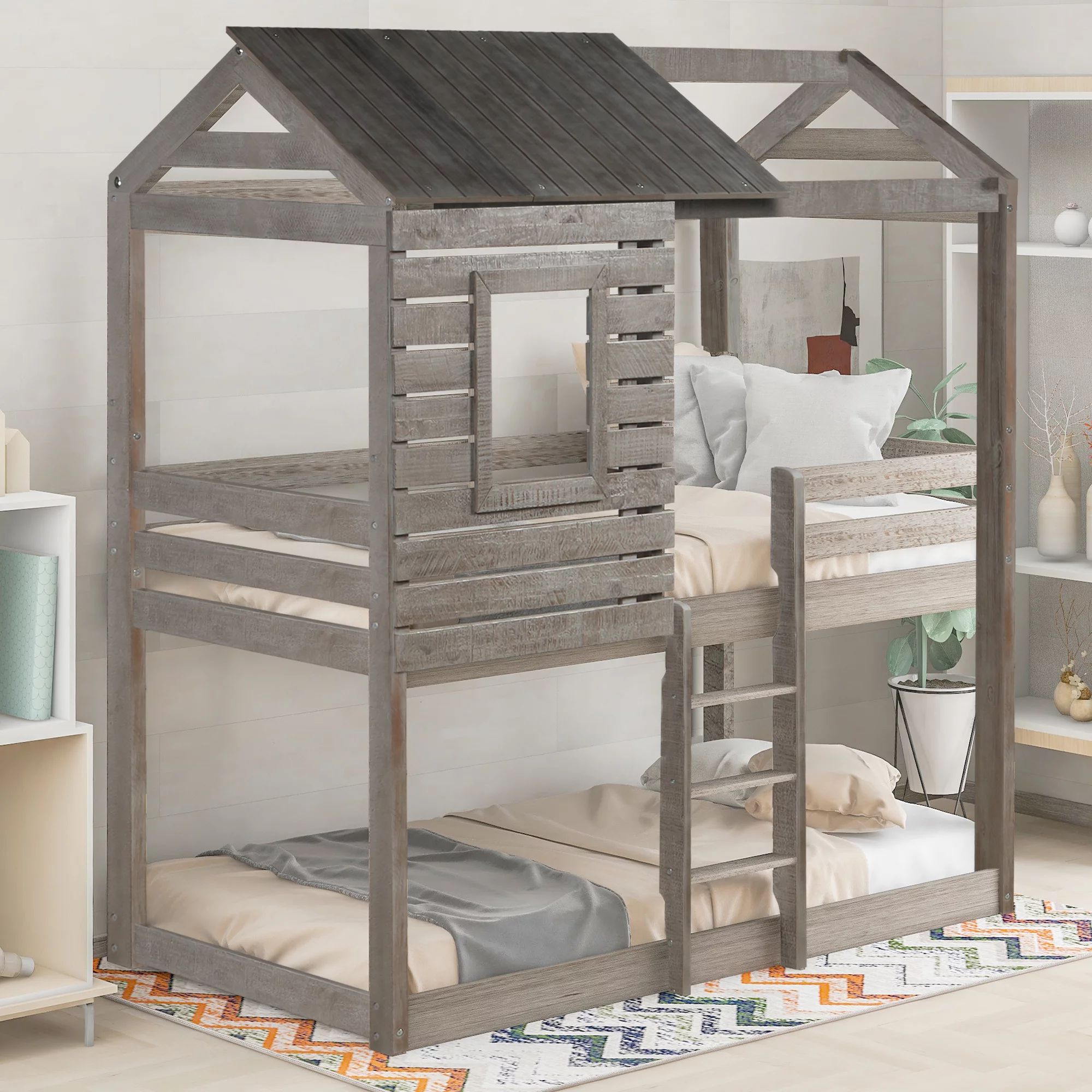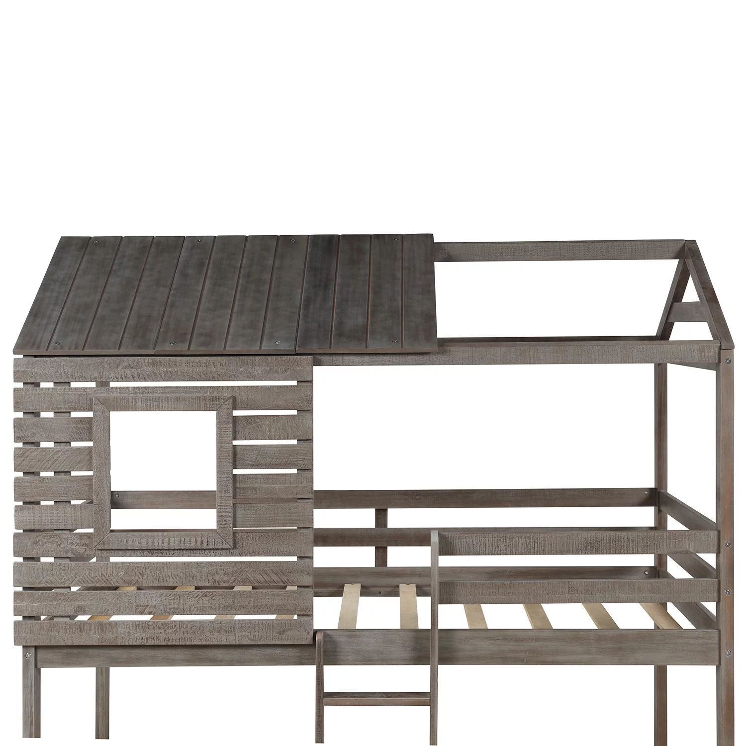 Antique Gray Twin over Twin Bunk Bed Wood Loft Bed with Roof, Window, Guardrail, Ladder