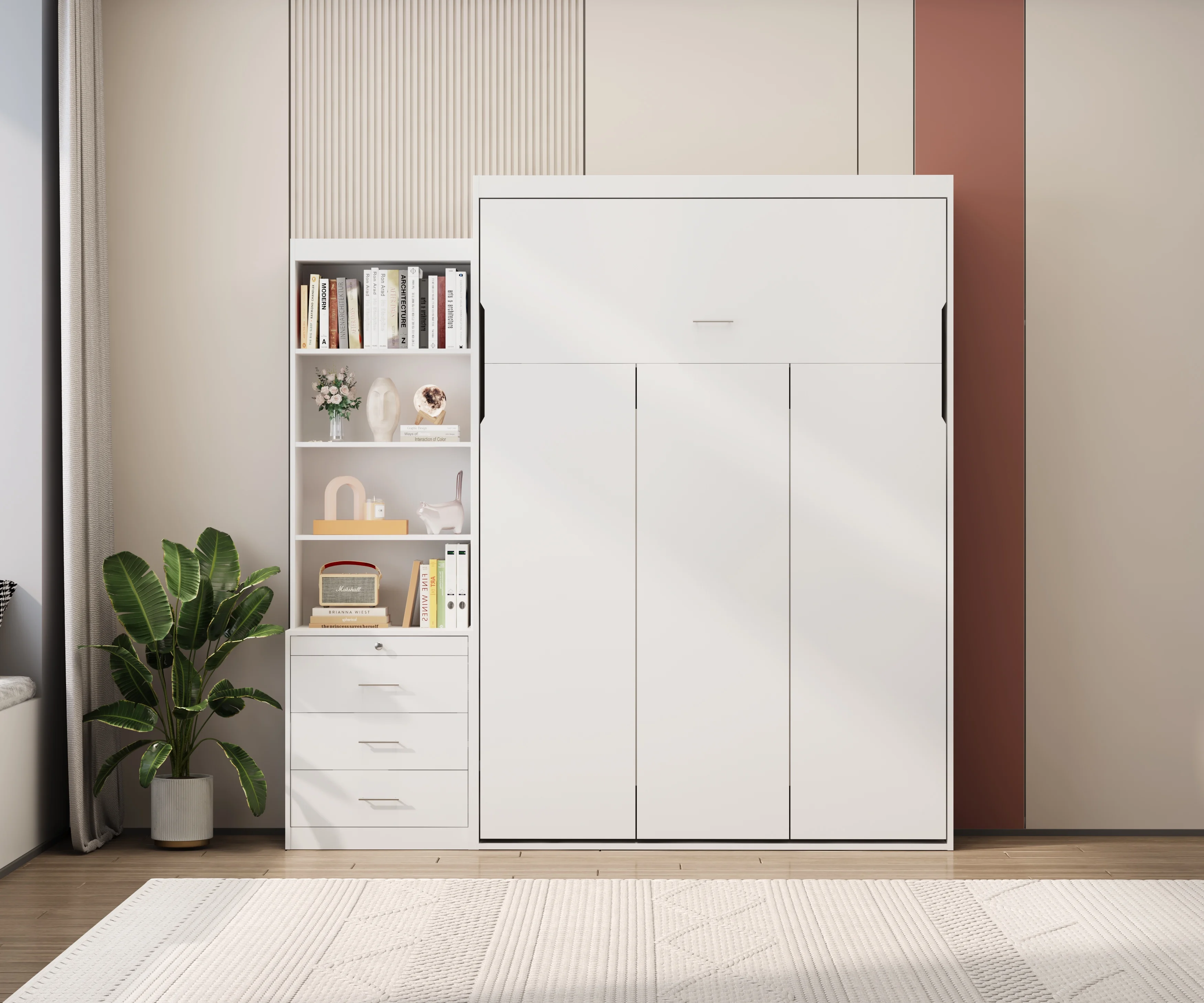 Full Size Vertical Murphy Bed with Shelf and Drawers for Bedroom or Guest room White Wall Bed Space Saving Hidden Bed Gas Struts (White)