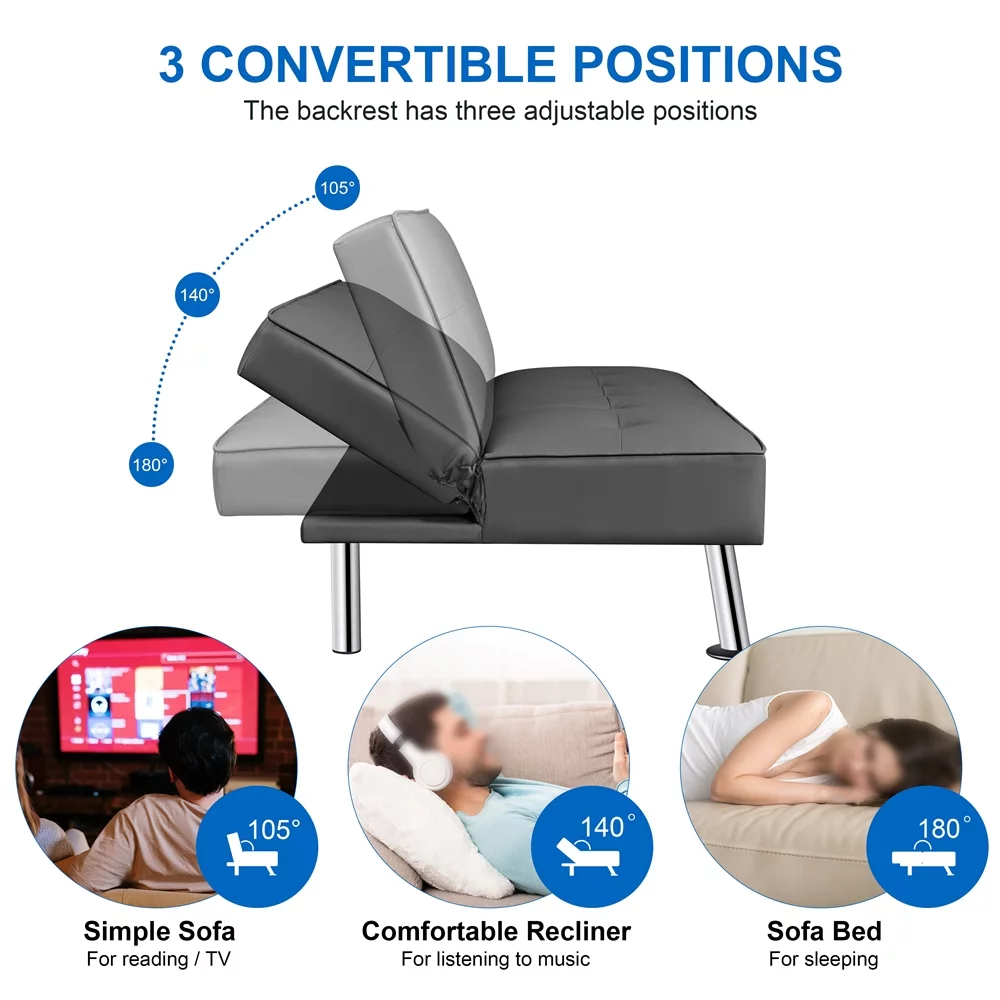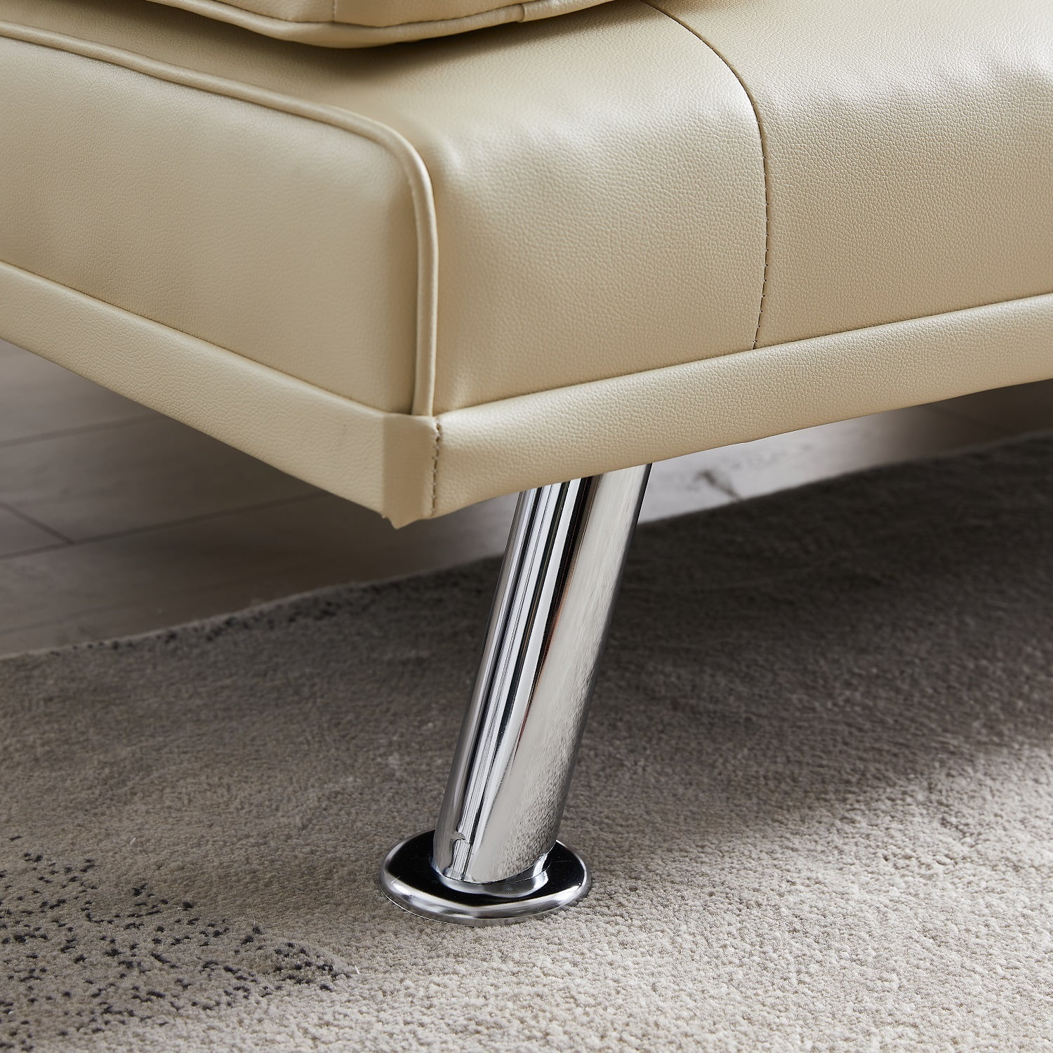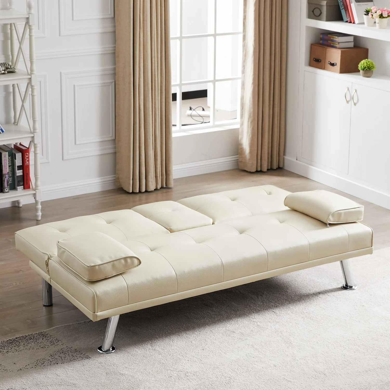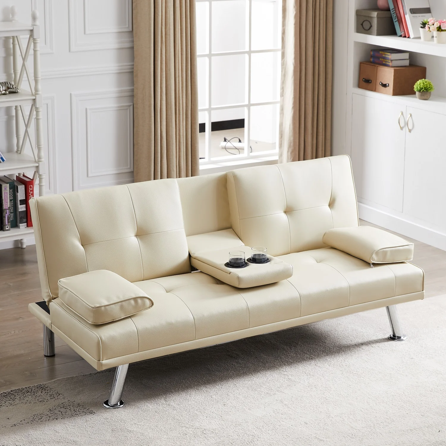 Dubbin Faux Leather Convertible Futon Sofa Bed with Removable Armrests,Metal Legs,and Cupholders - Beige