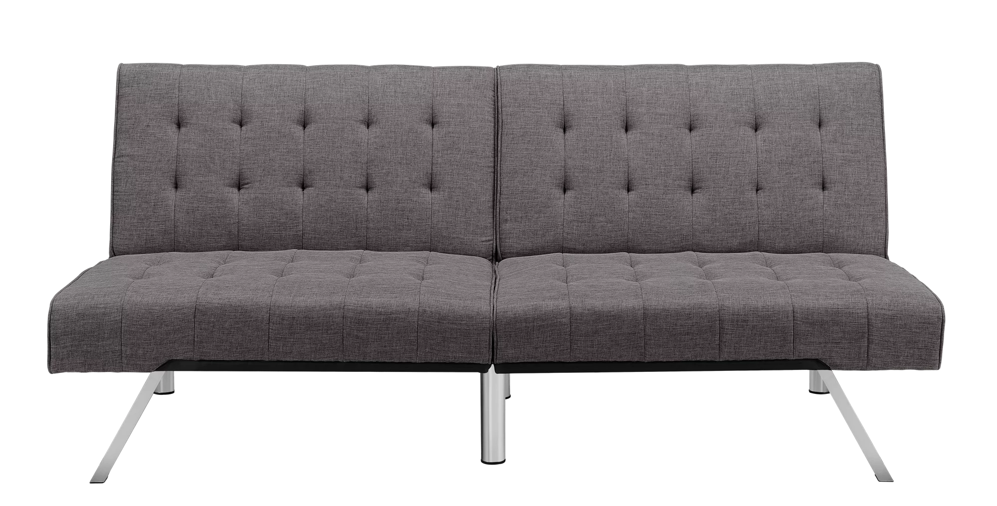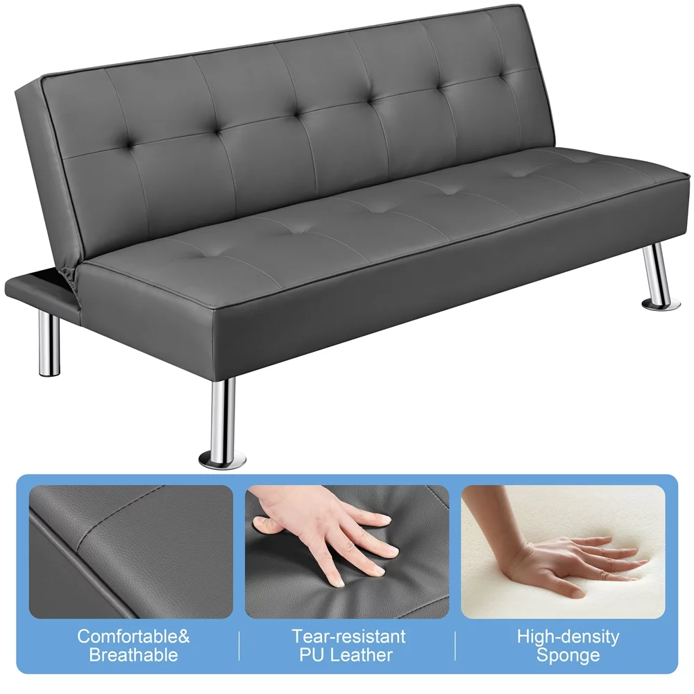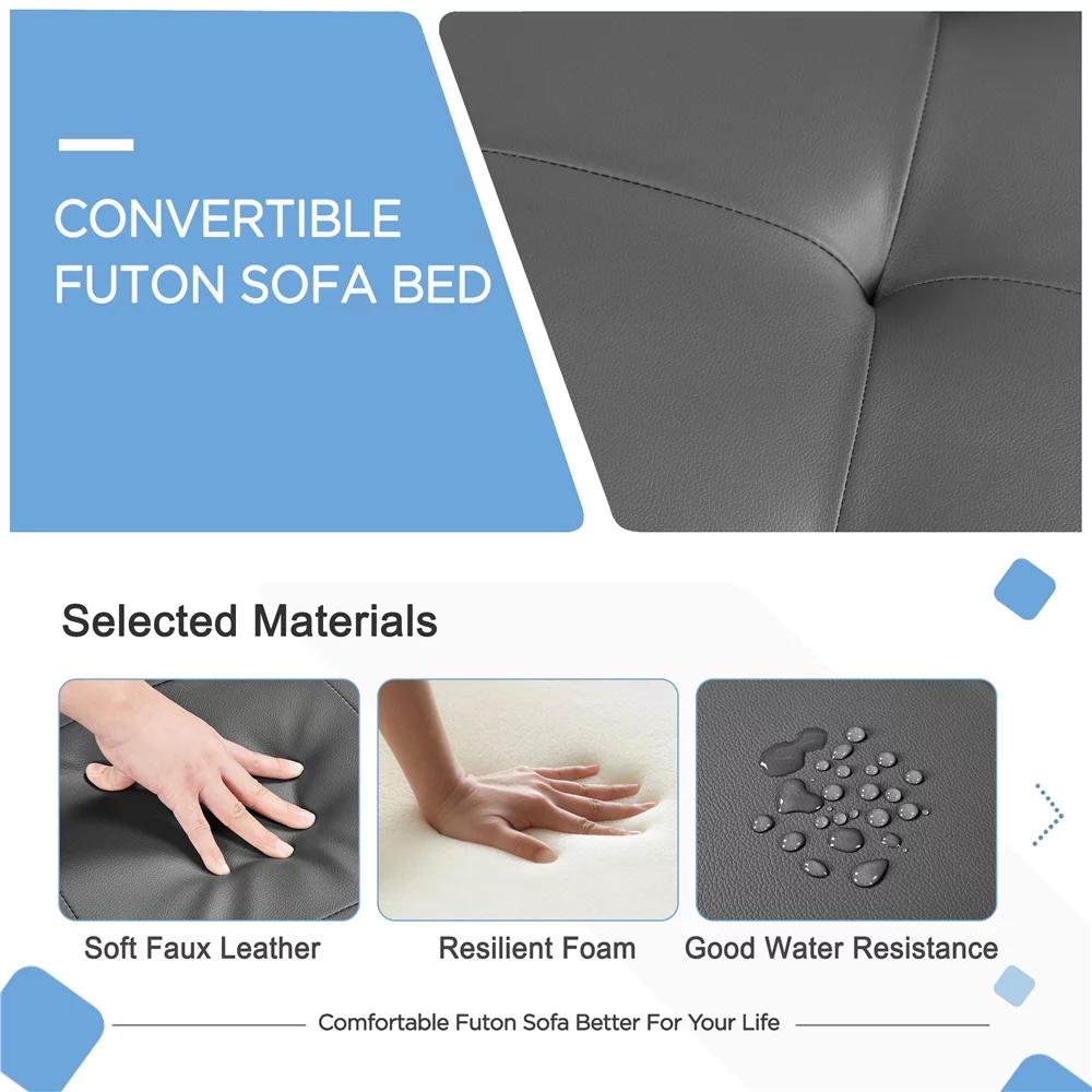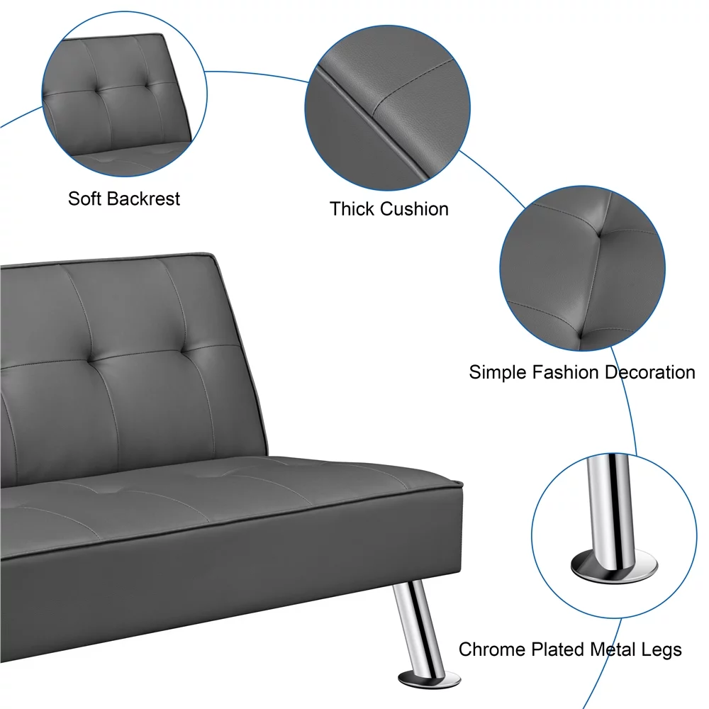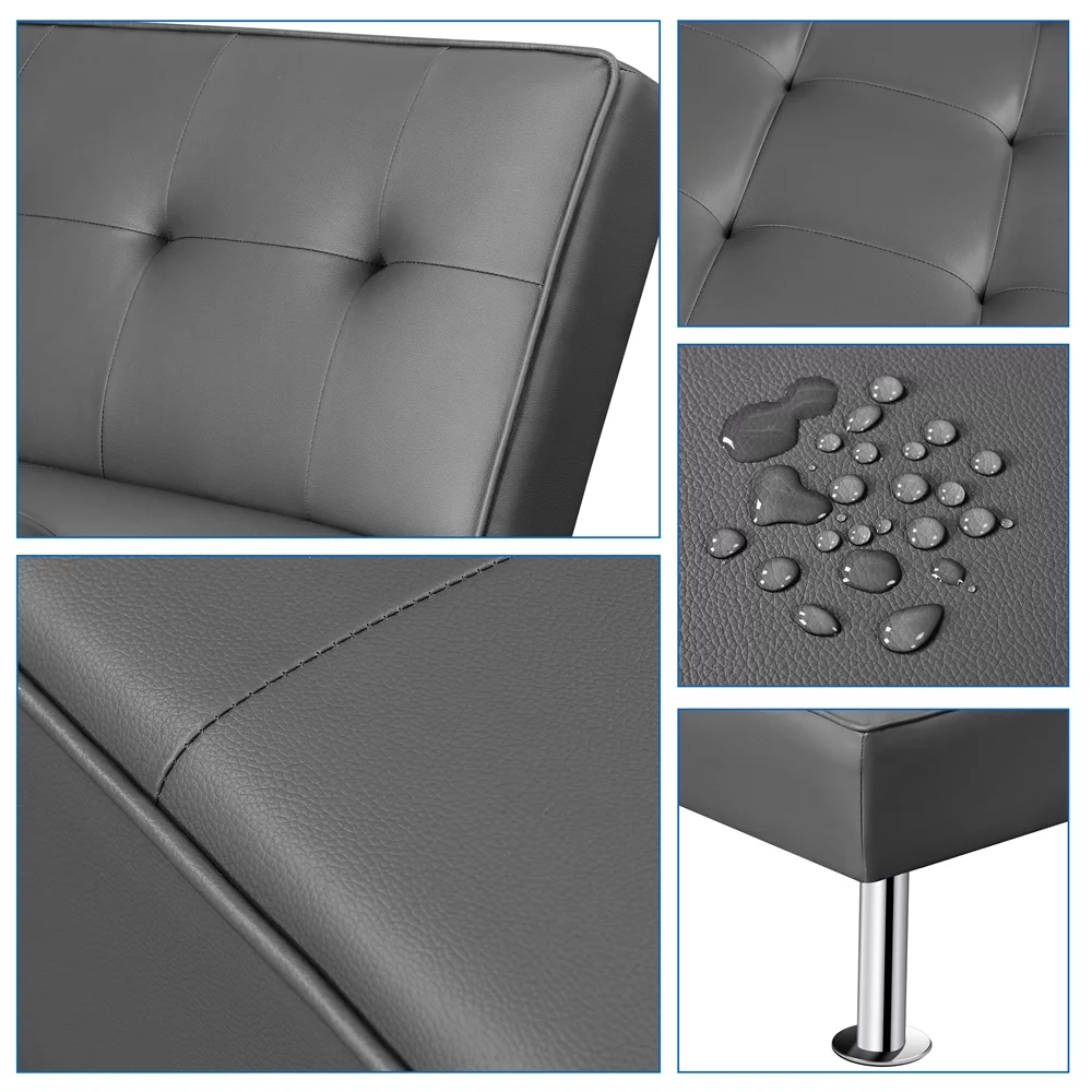 SmileMart Convertible Tufted Faux Leather Futon Sofa Bed with Chrome Metal Legs, Gray