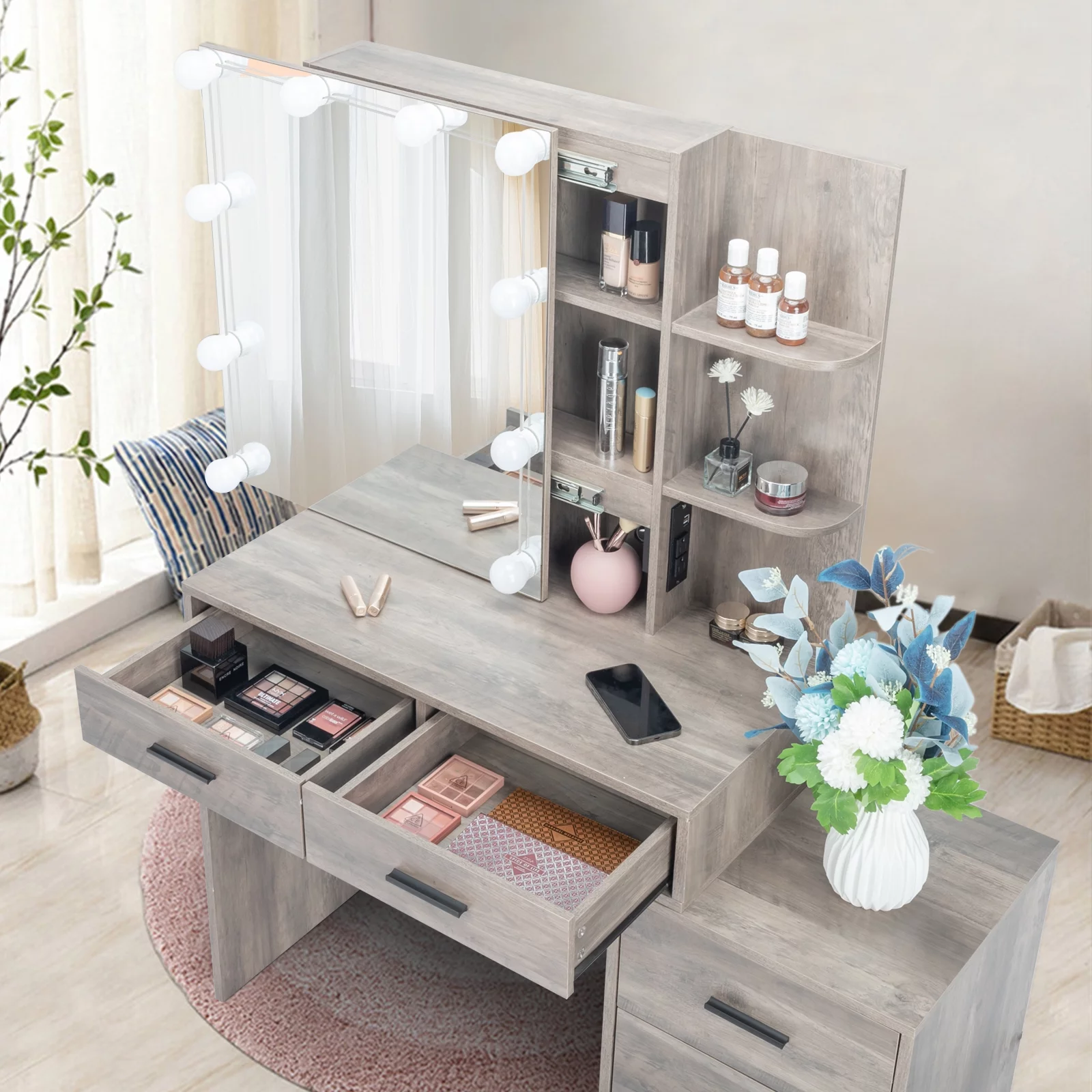 Ktaxon Lighted Vanity Makeup Table Set with Charging Station, Sliding Mirror with Cushioned Stool
