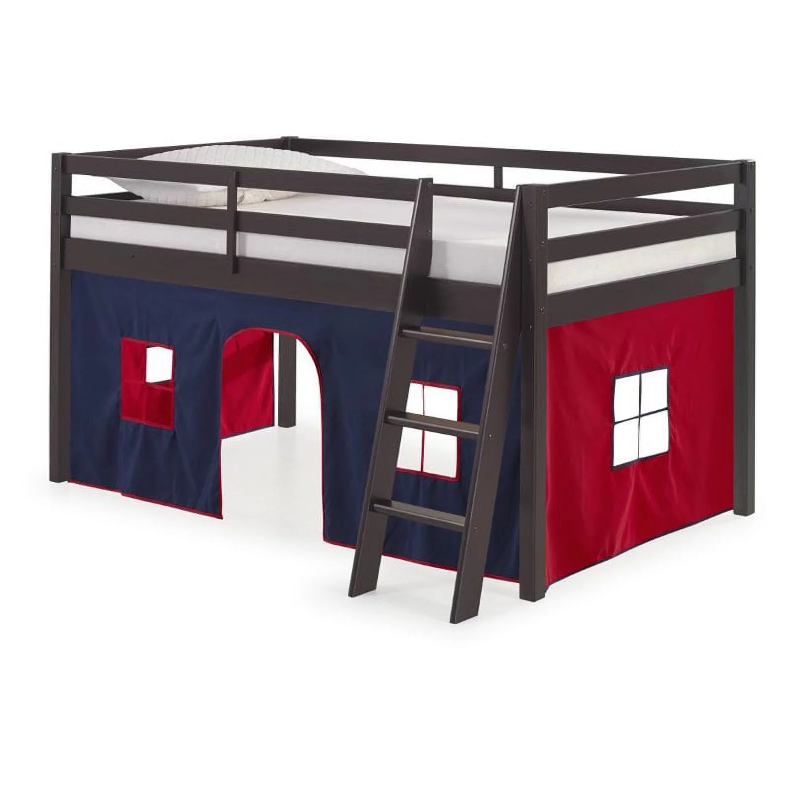 Roxy Twin Wood Junior Loft Bed with Espresso with Blue & Red Bottom Tent