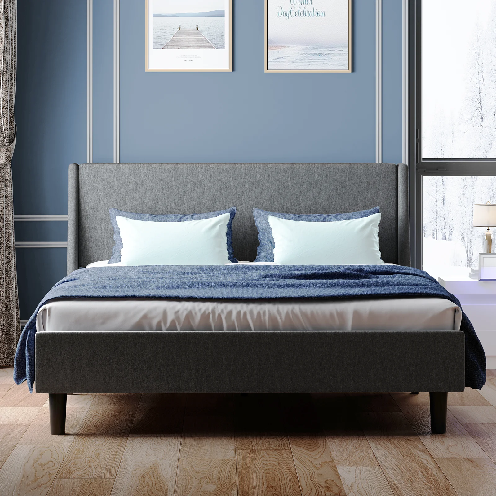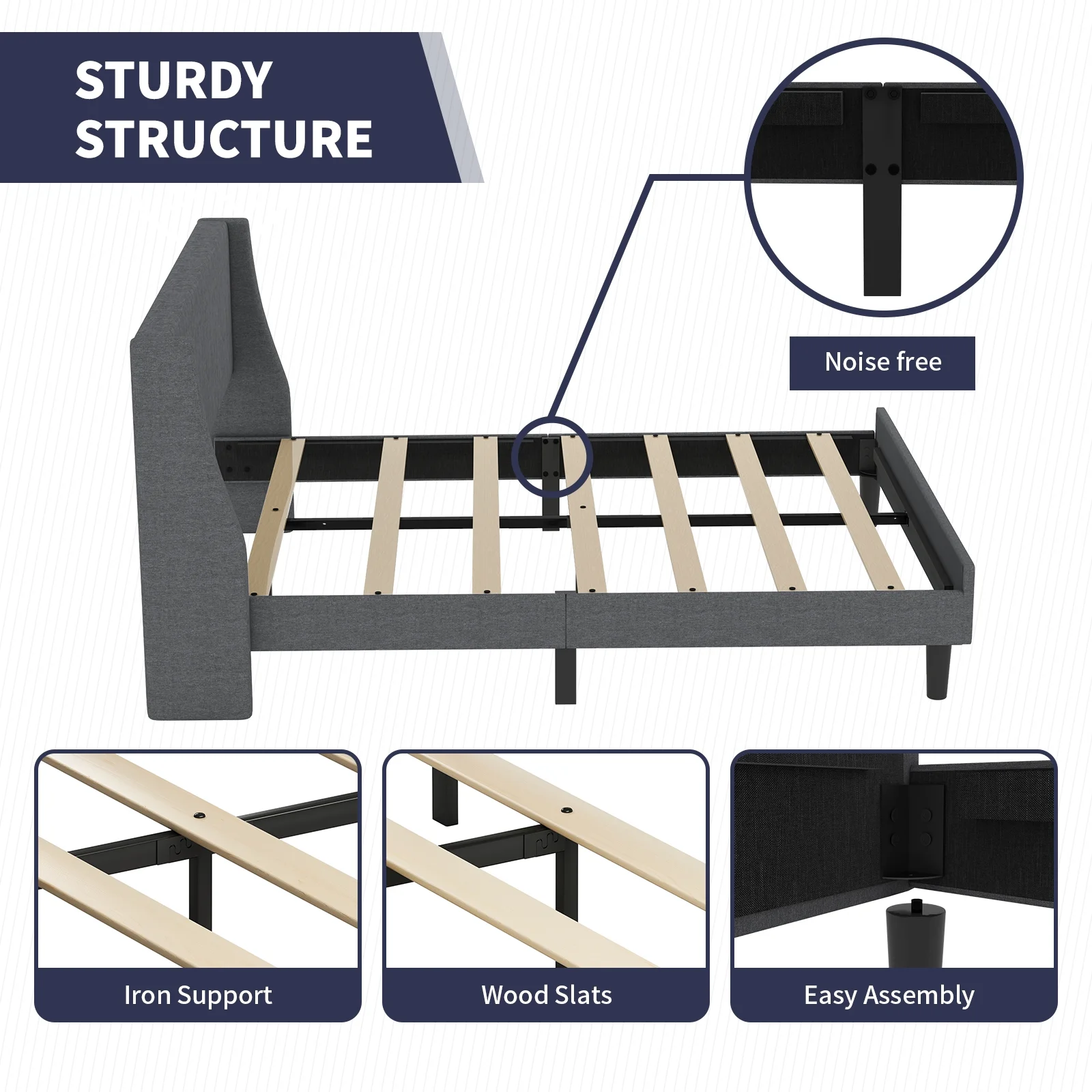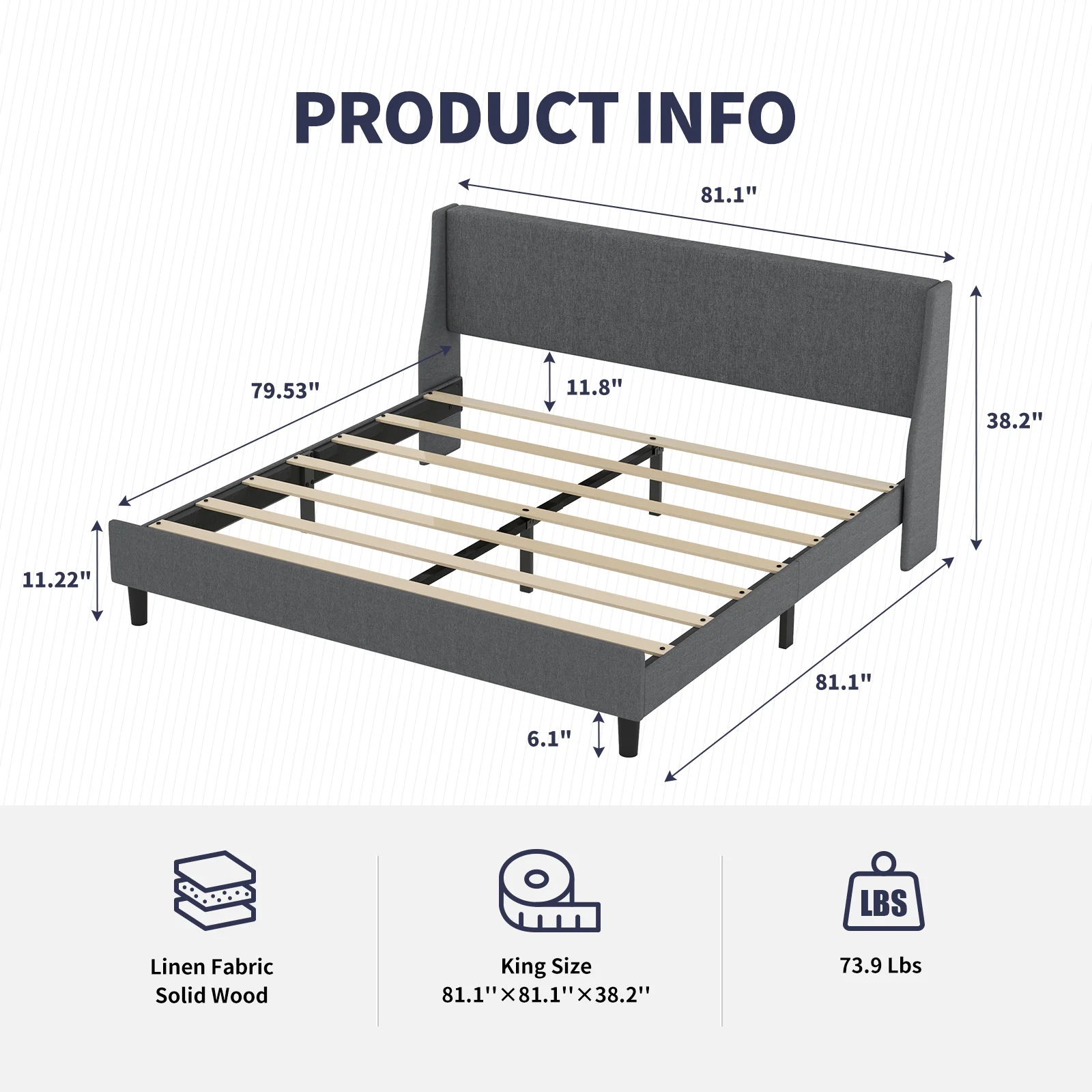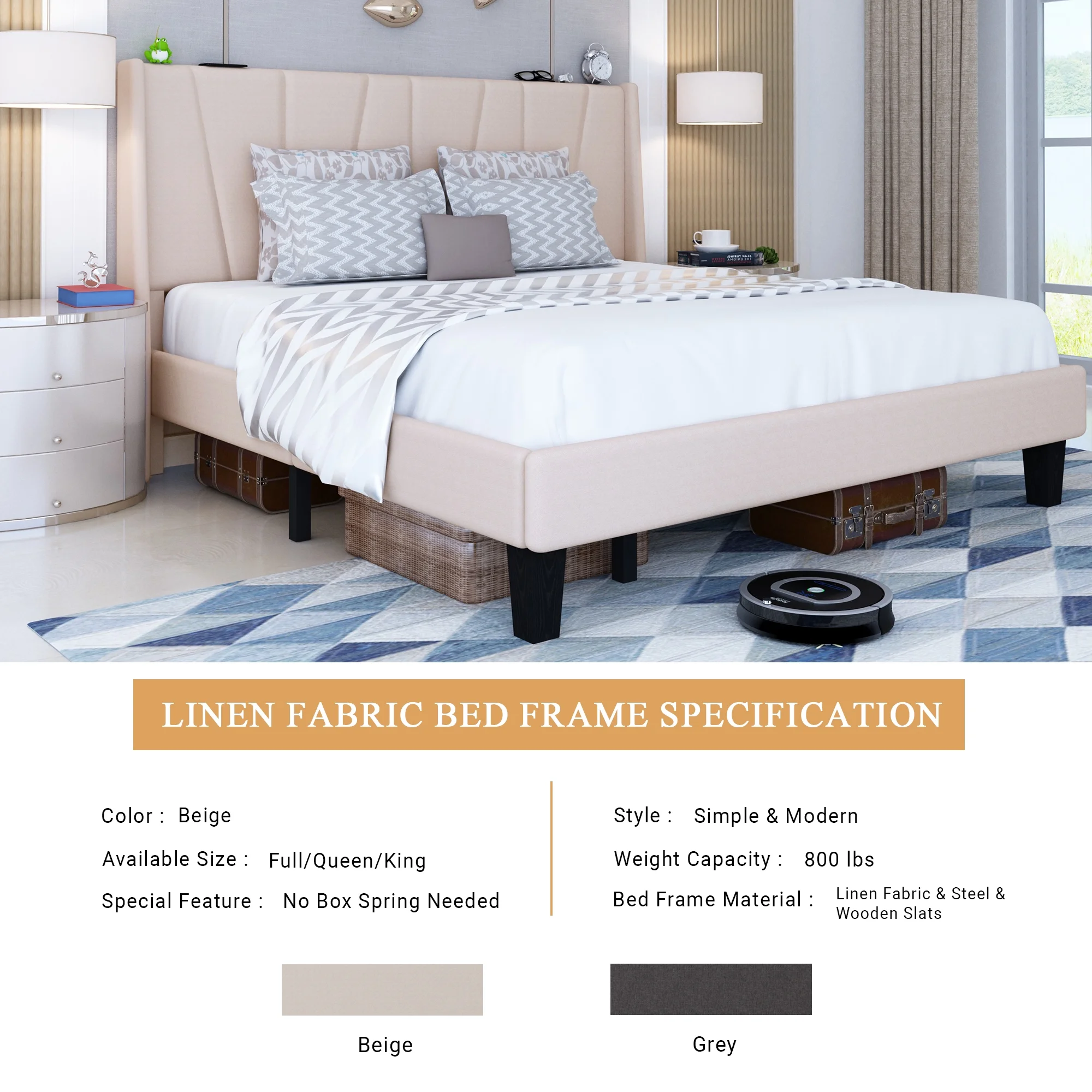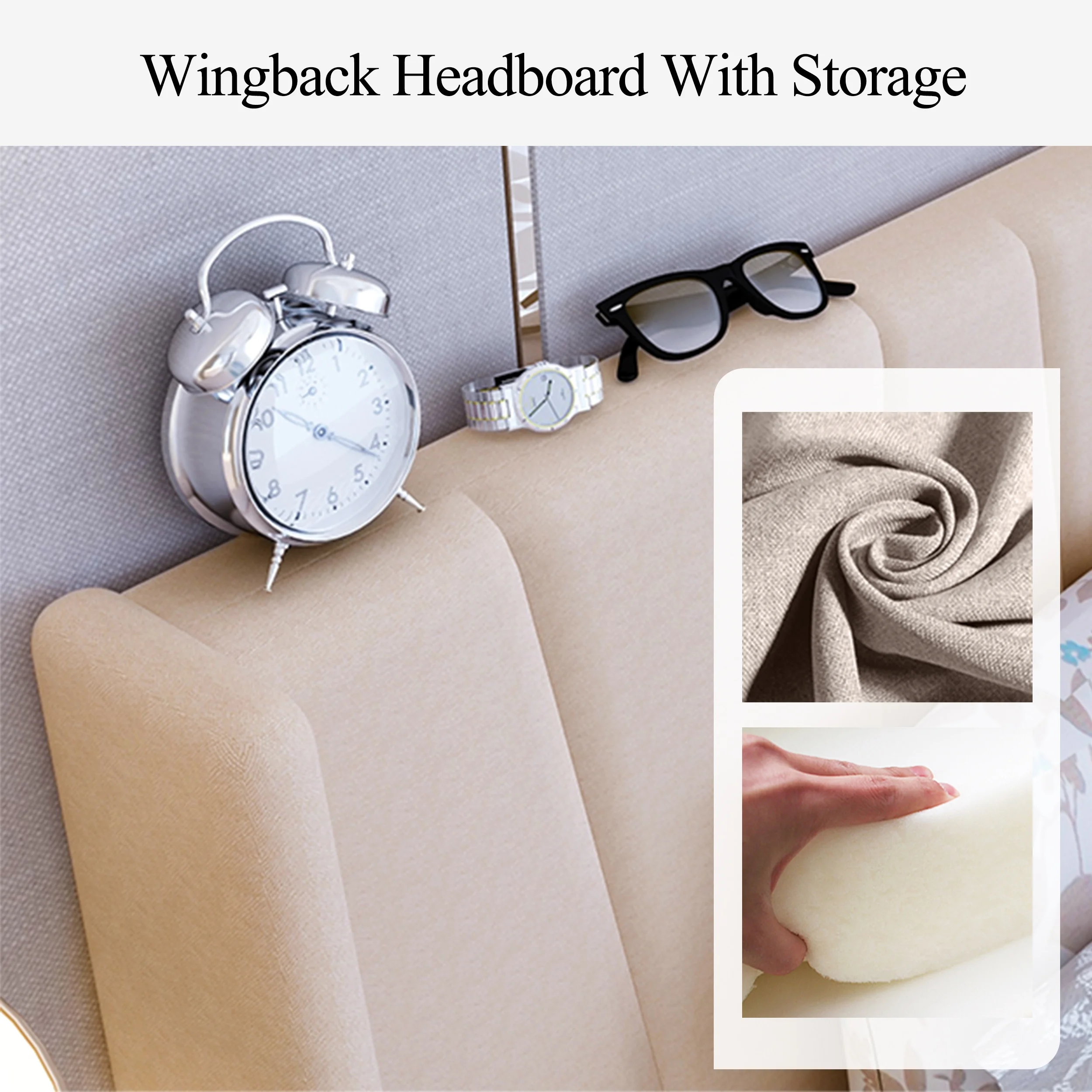 Kallabe King Upholstered Modern Wingback Platform Bed Frame with Headboard, Beige
