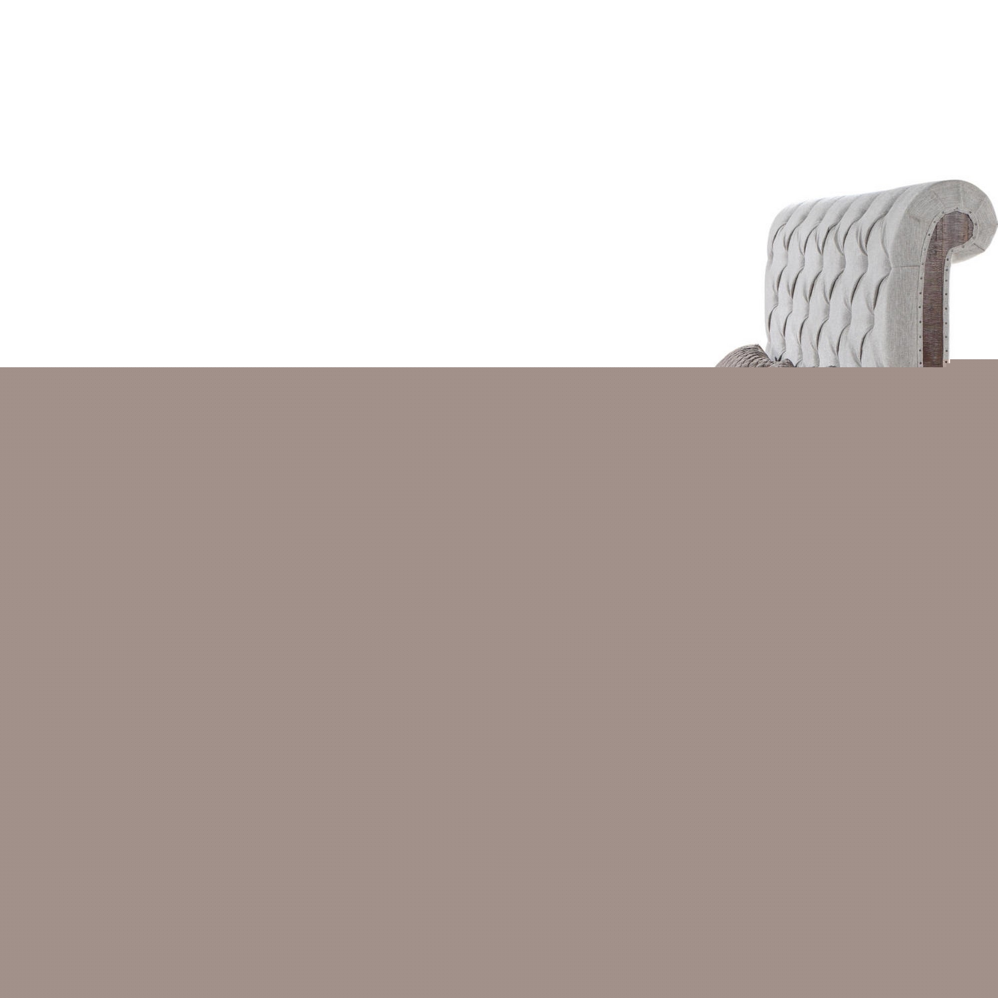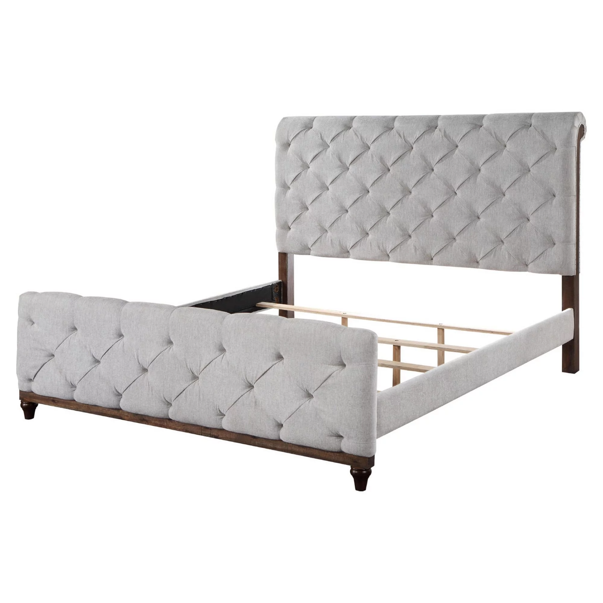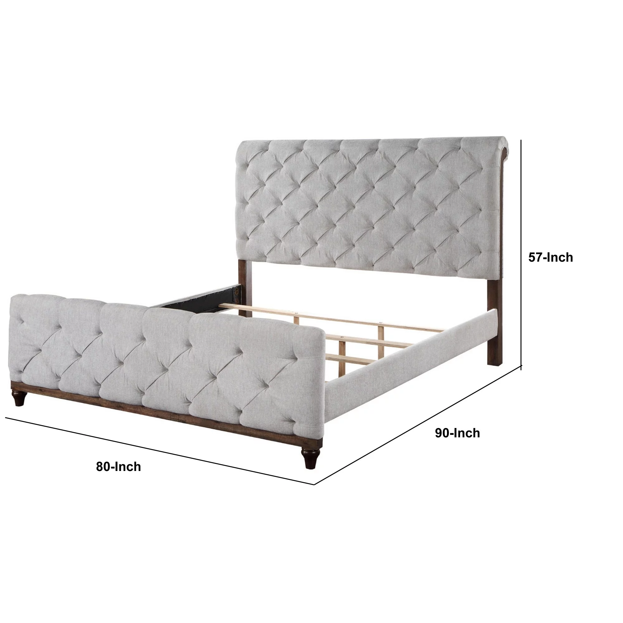 Liza Wood Modern King Size Bed, Button Tufted, Brown Frame, Beige Fabric
