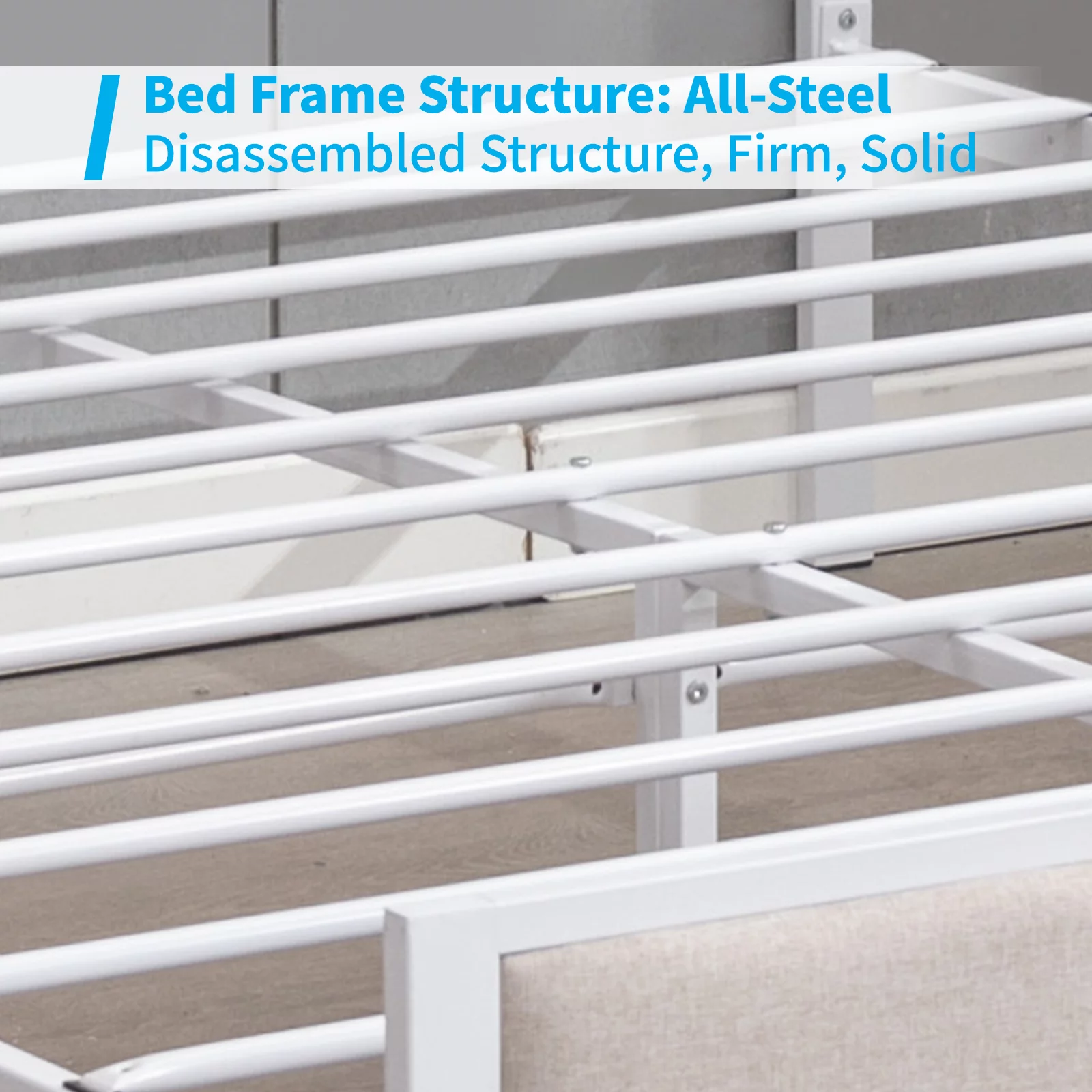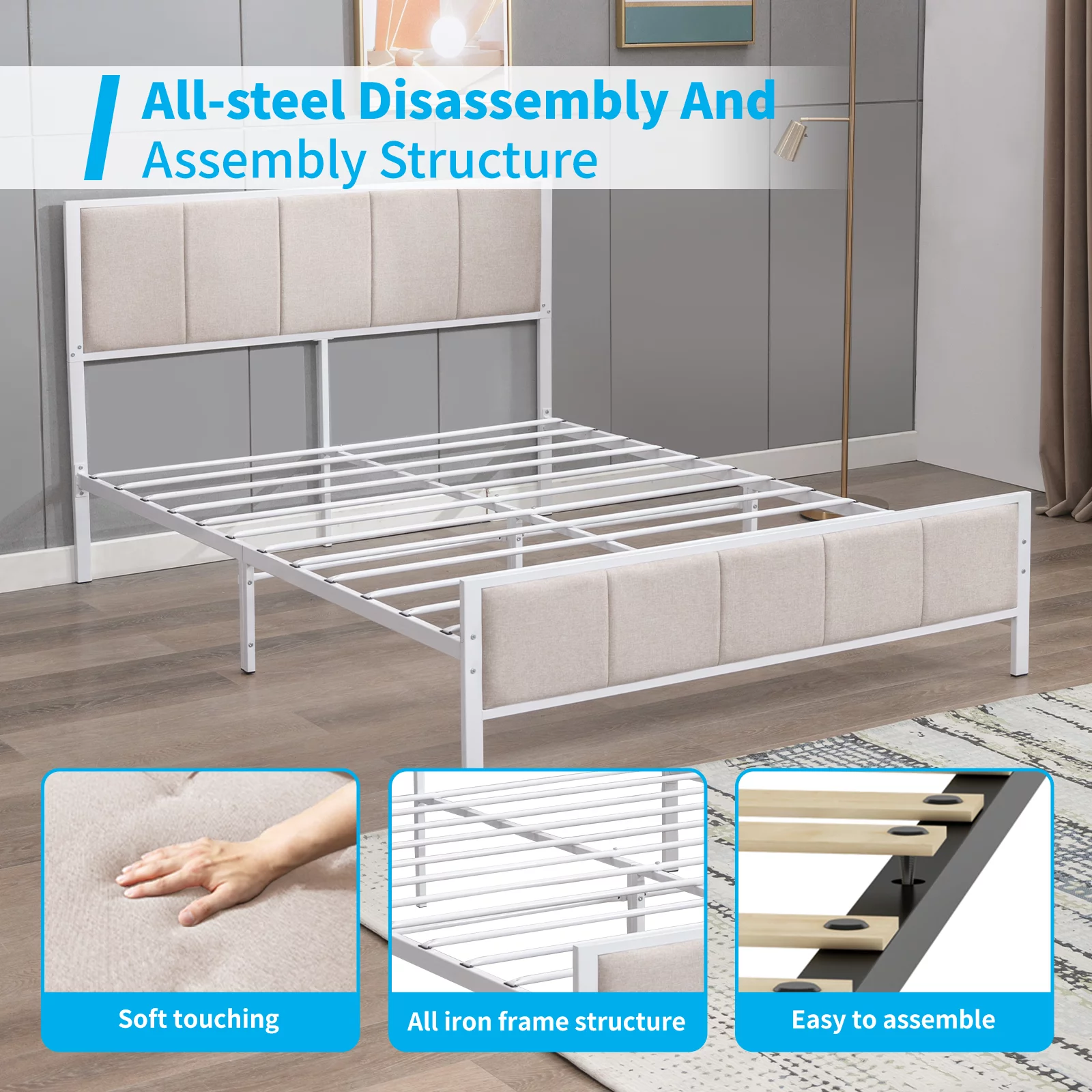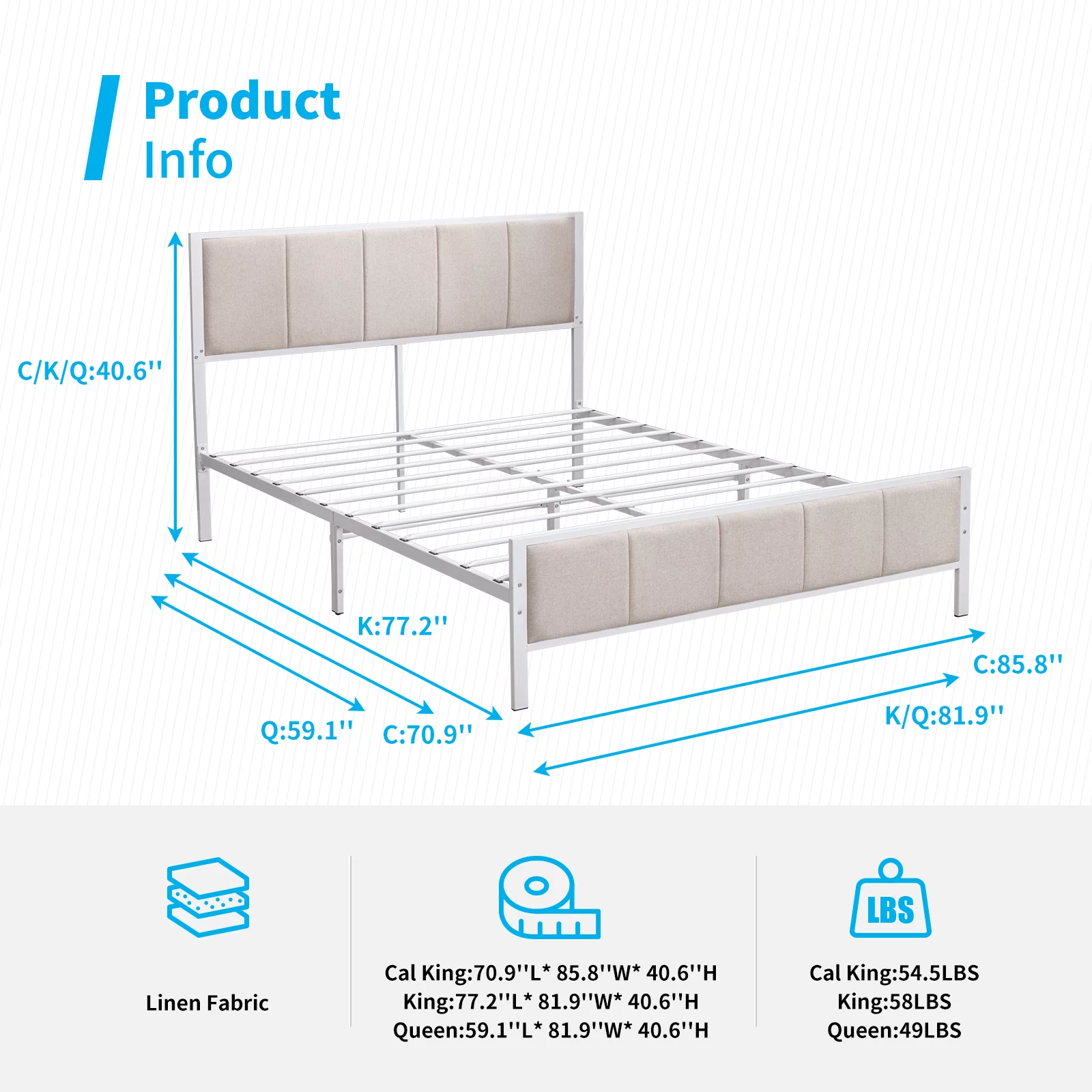 BALUS King Bed Frame with Tufted Headboard, Modern Vertical Strpes, Linen Fabrics and White Finish Metal, Beige
