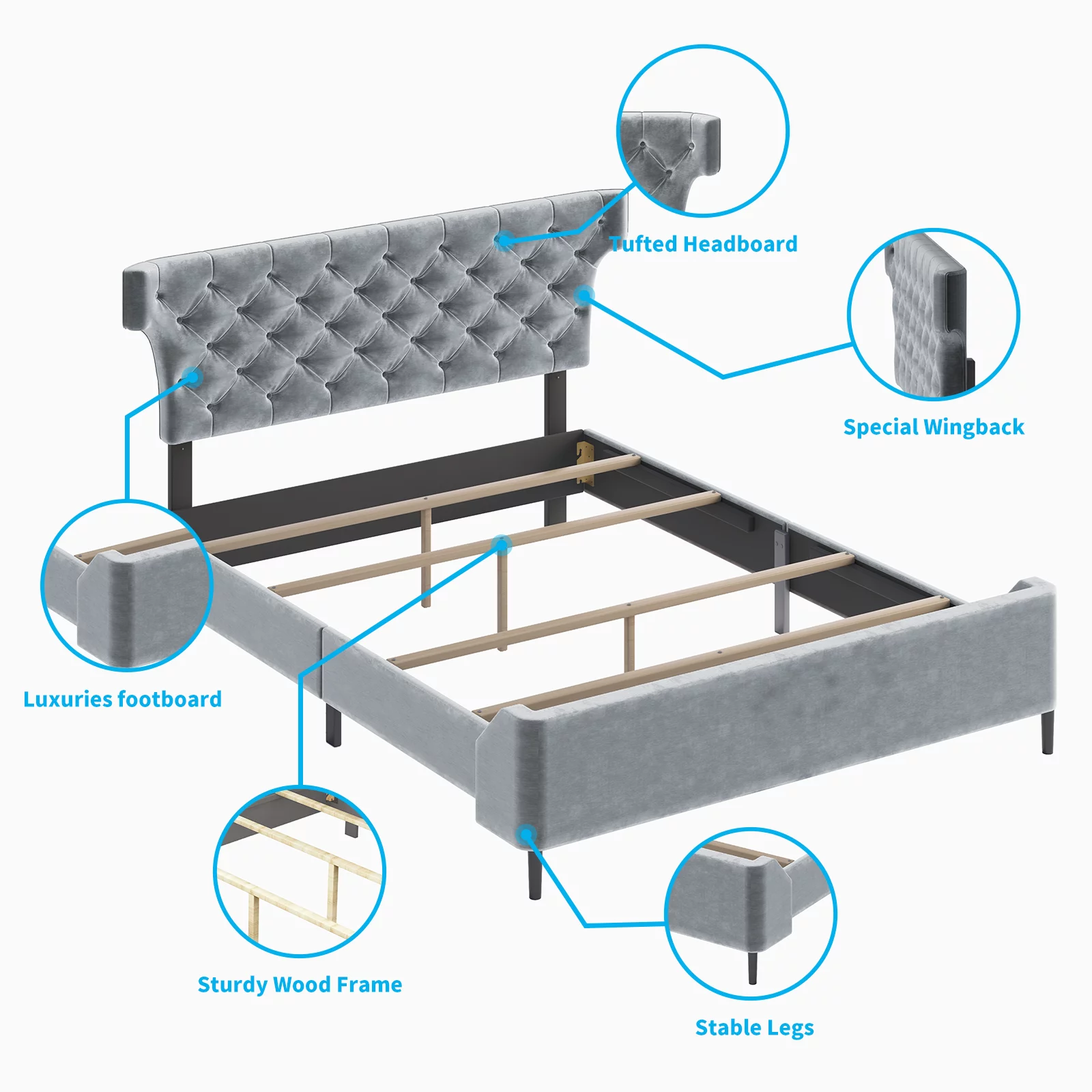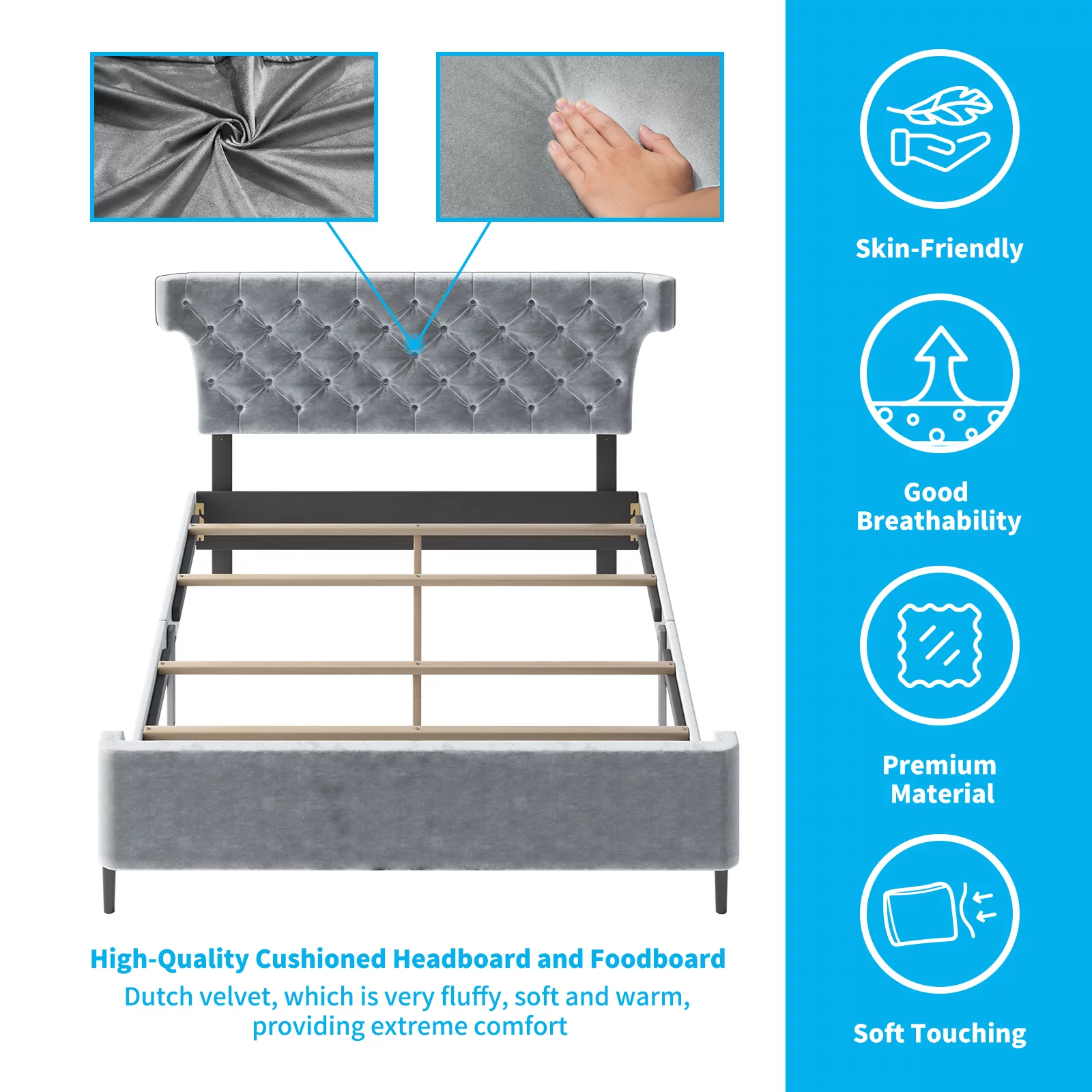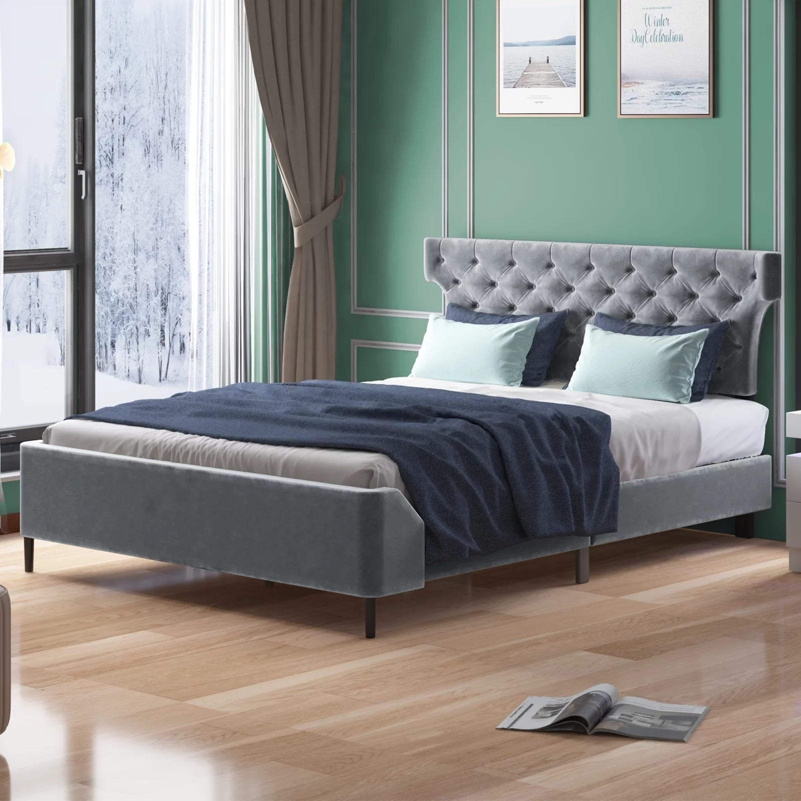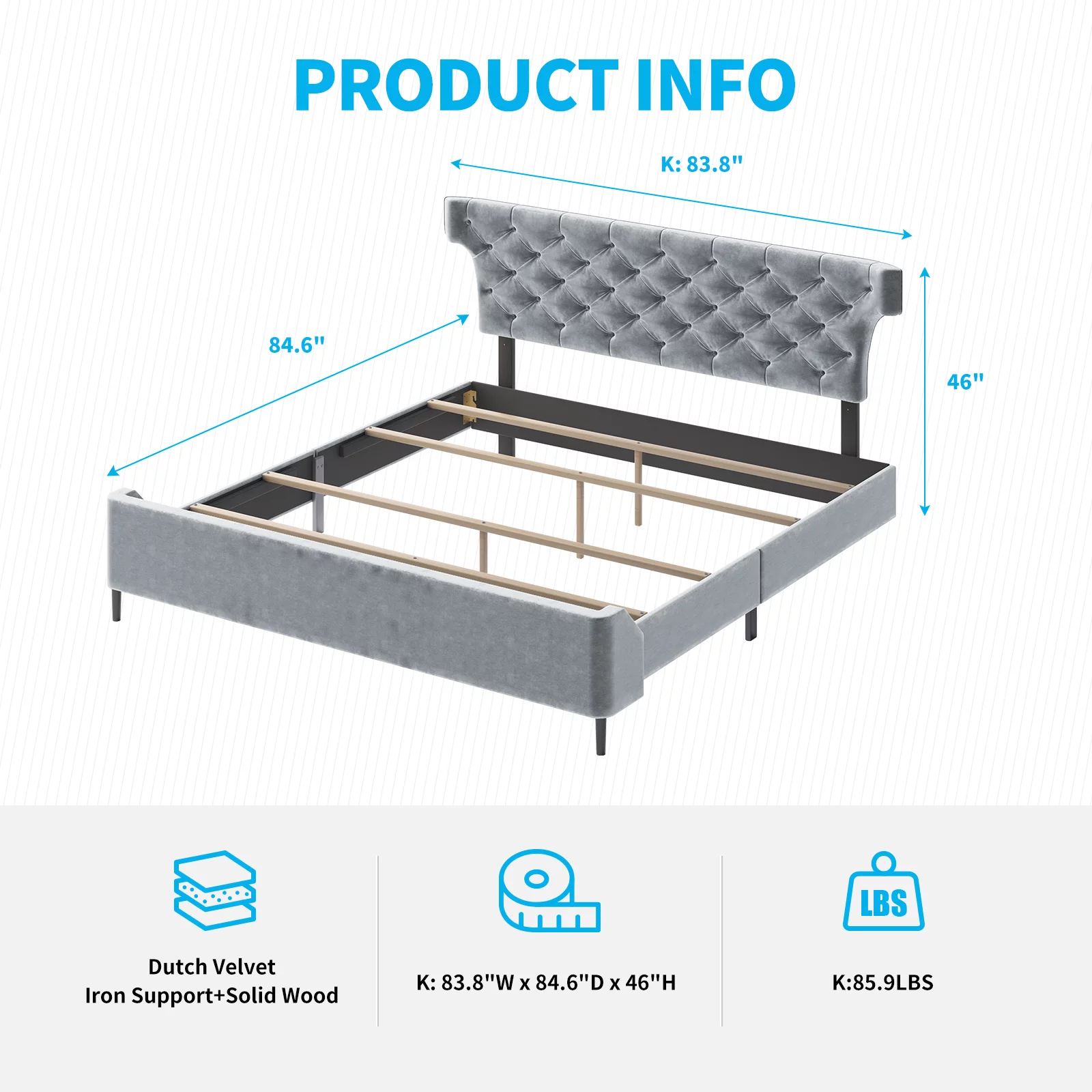 Tufted Platform Bed Frame, King Size, Velvet, Grey Gray, Modern Contemporary Urban Design, Bedroom Master Guest Suite
