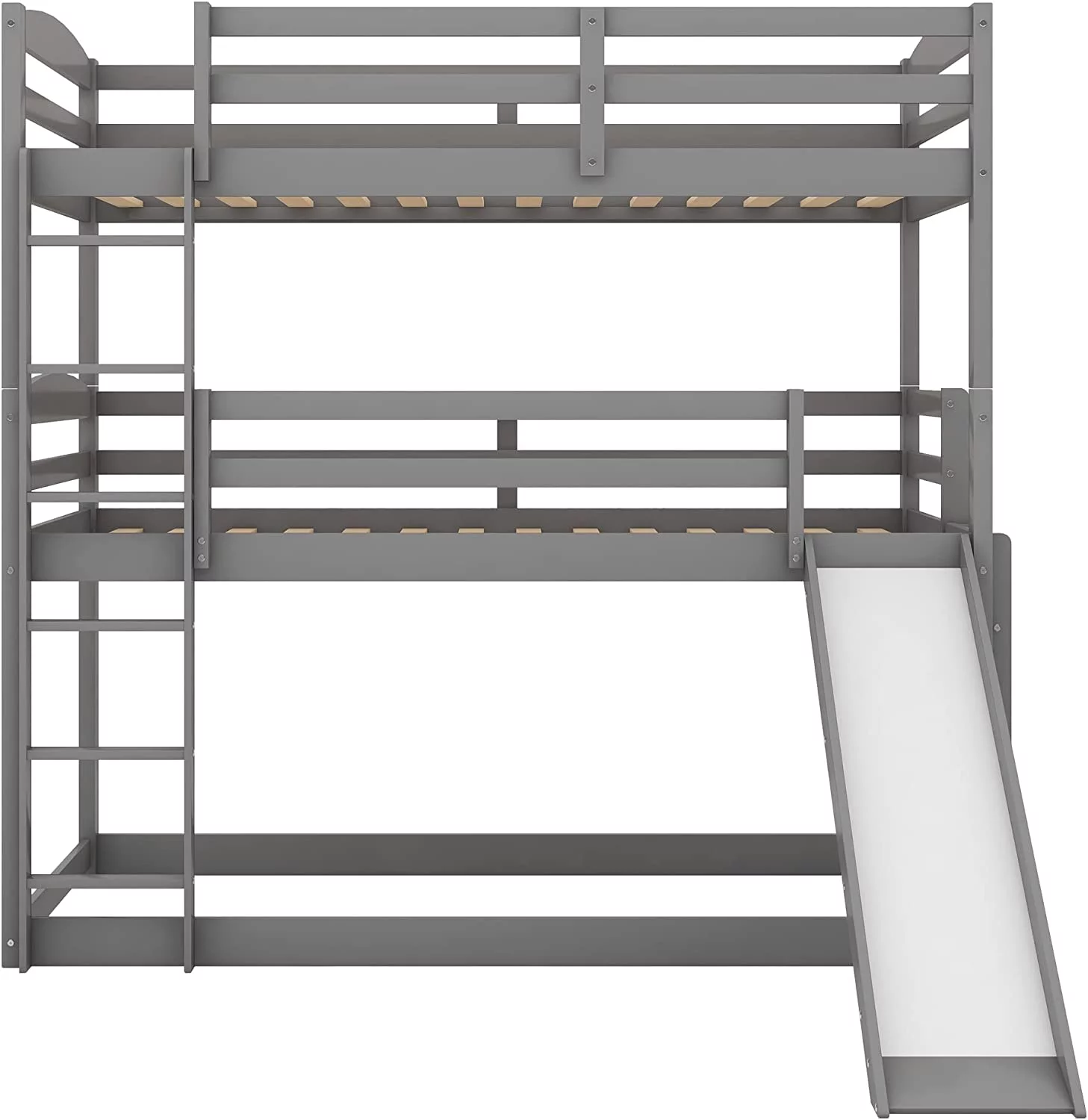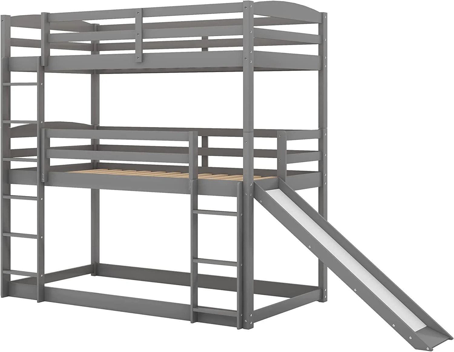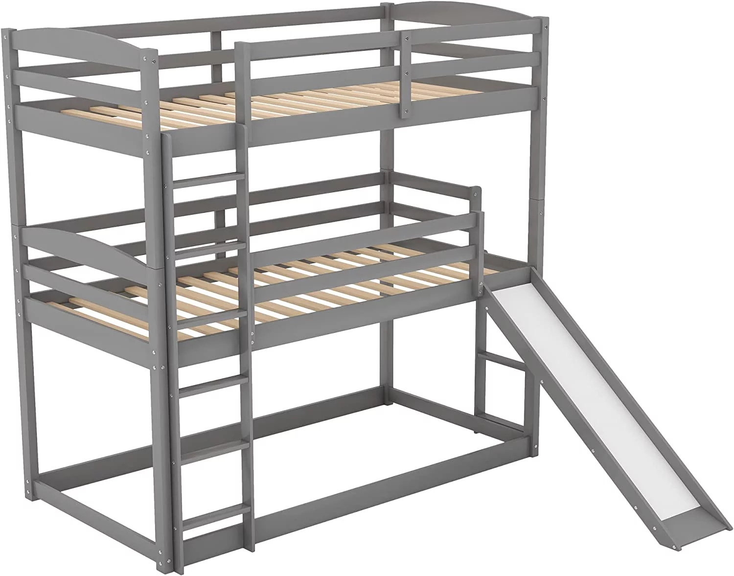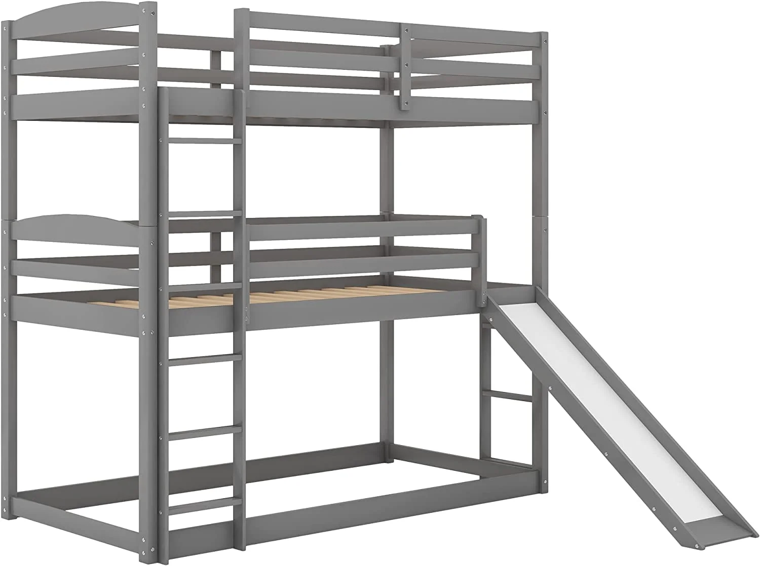 Triple Bunk Bed With Slide, -Over--Over- Triple Bed Frame With Built-In Ladder And Guardrails For Kids (Gray)