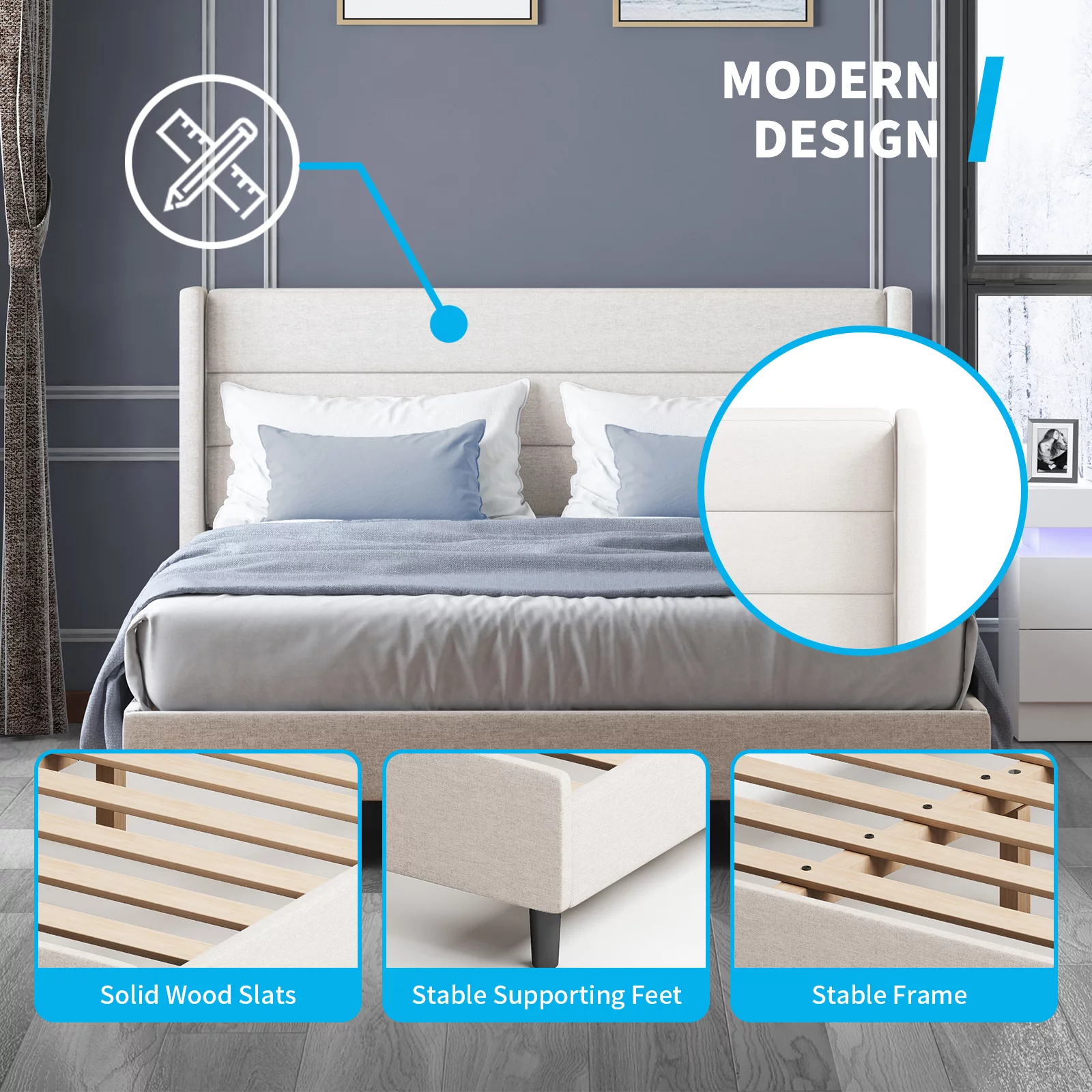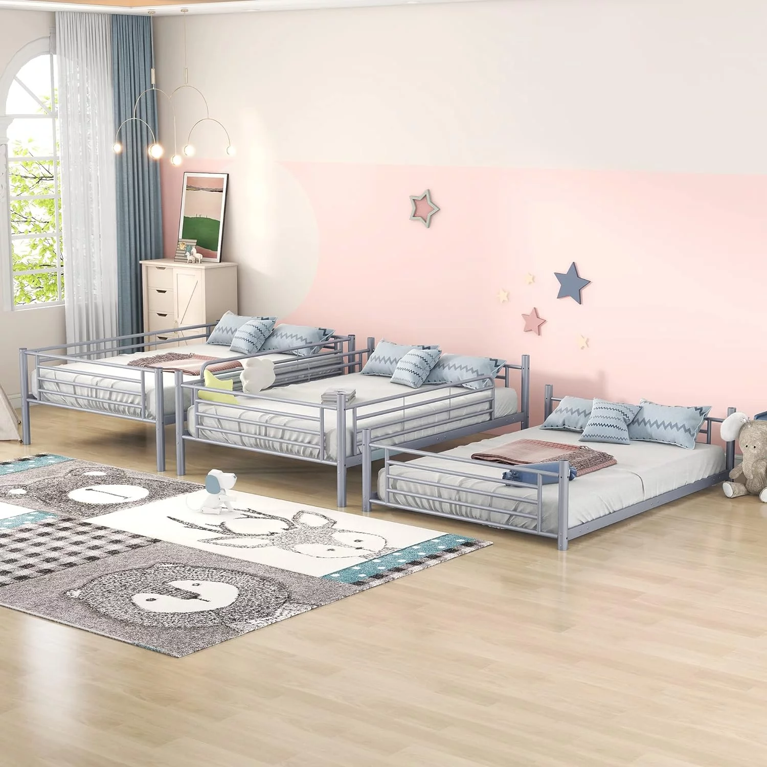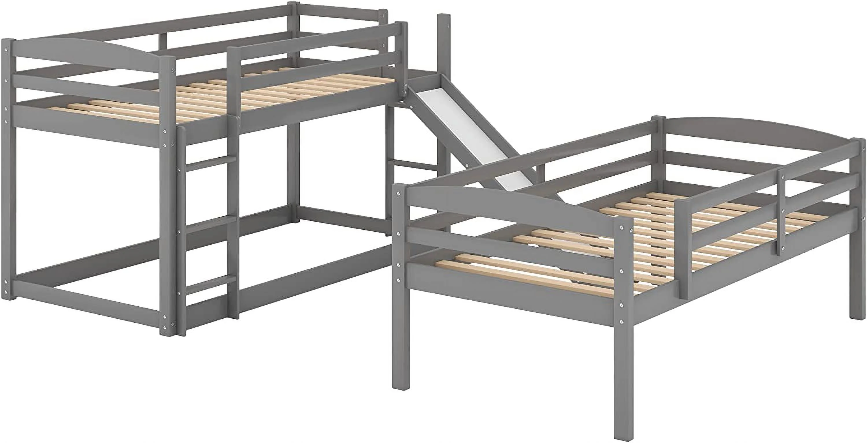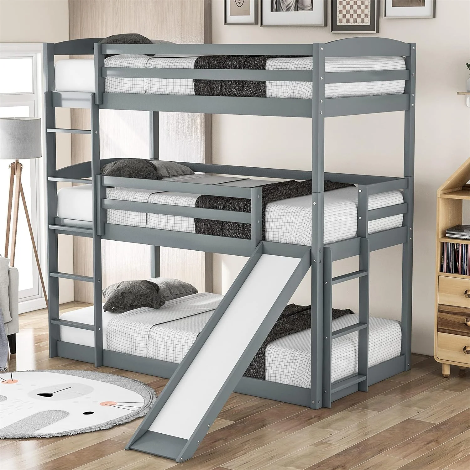 Triple Bunk Bed With Slide, -Over--Over- Triple Bed Frame With Built-In Ladder And Guardrails For Kids (Gray)