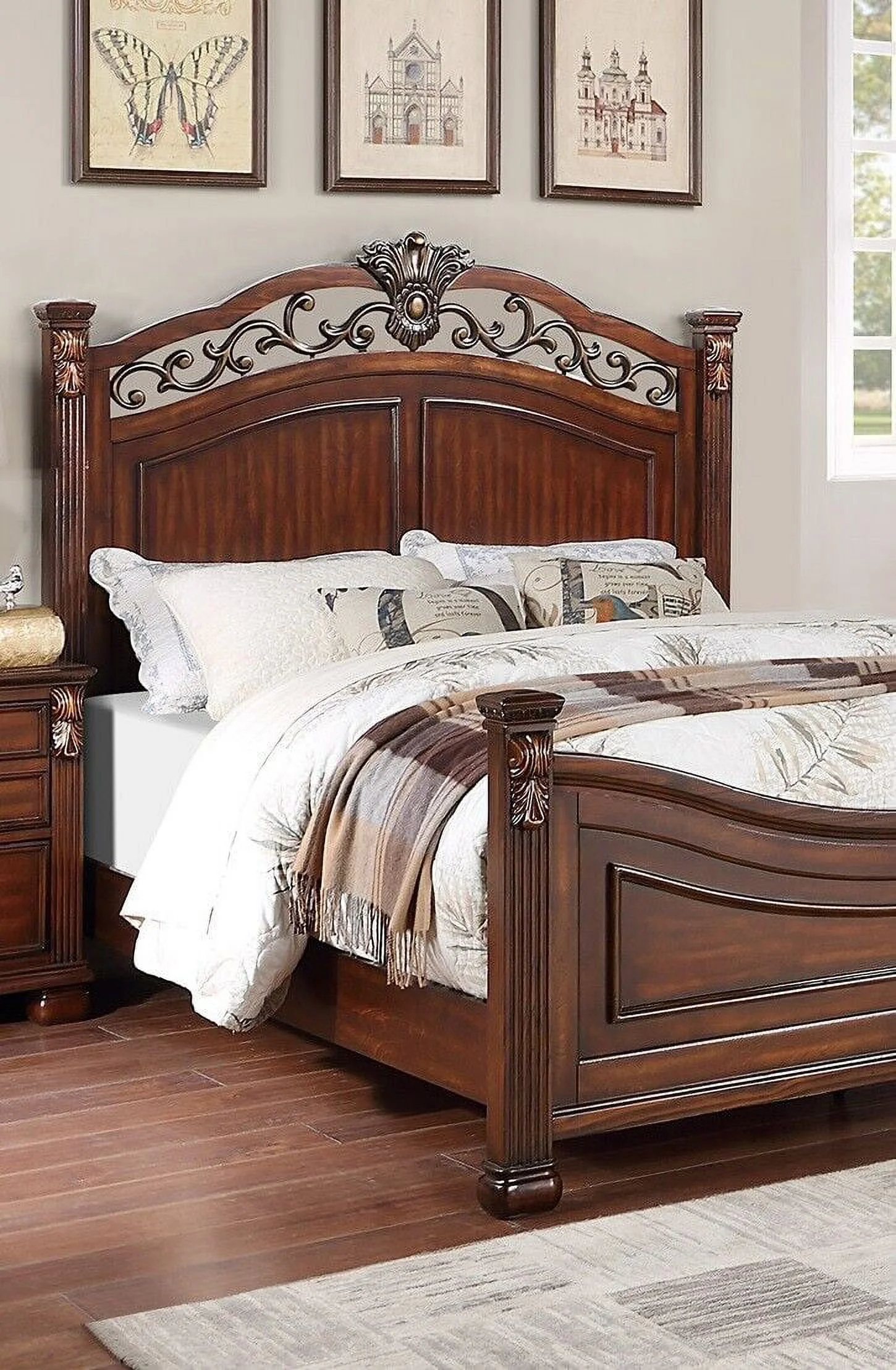 Traditional 1pc Bed Gorgeous Classic Brown Finish Cal King Size Bed Posts Floral Design Headboard Bedroom Furniture Footboard