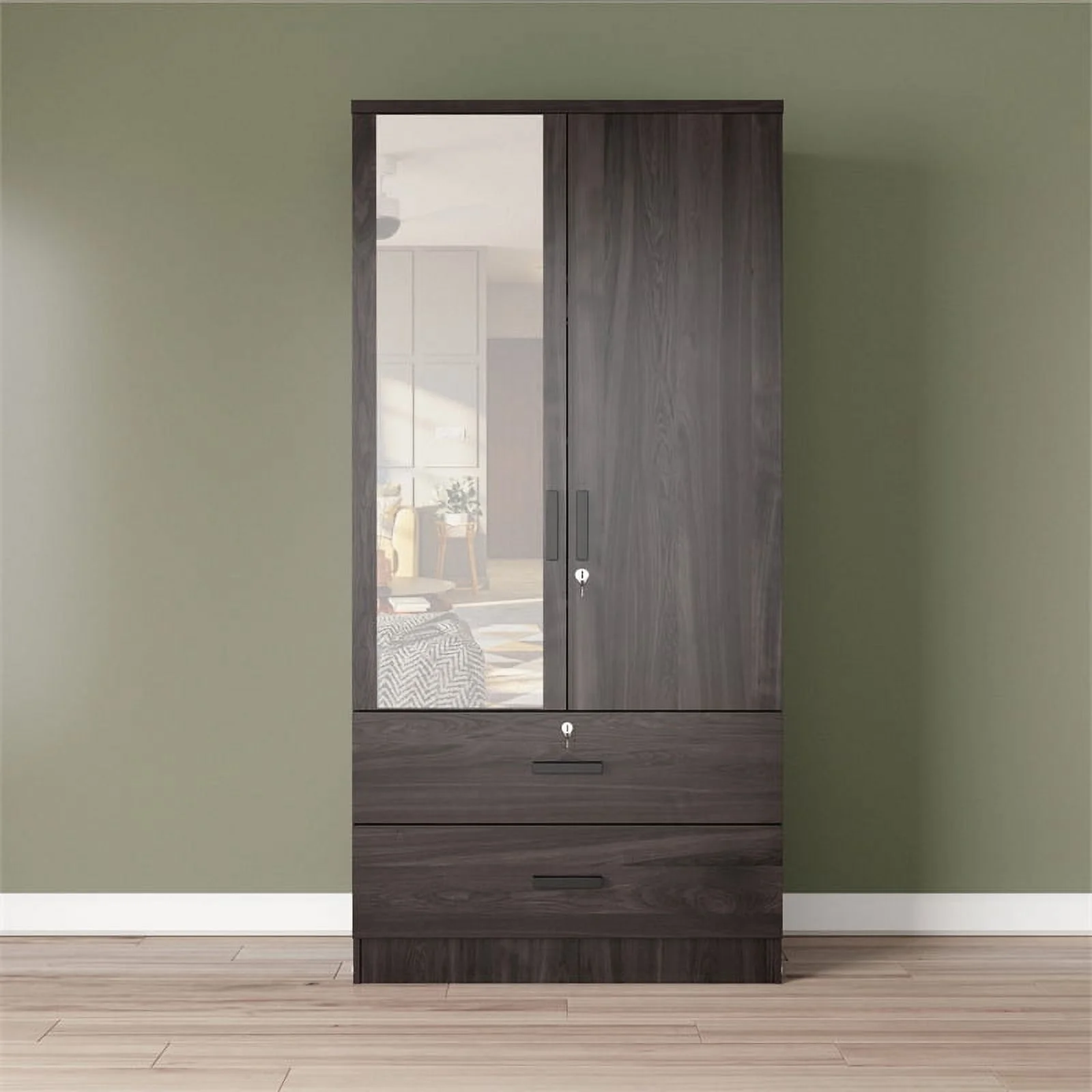 FUFU&GAGA 4 Door Wardrobe Large Storage Cabinet Armoire with Mirror and 2 Drawer Dark Brown