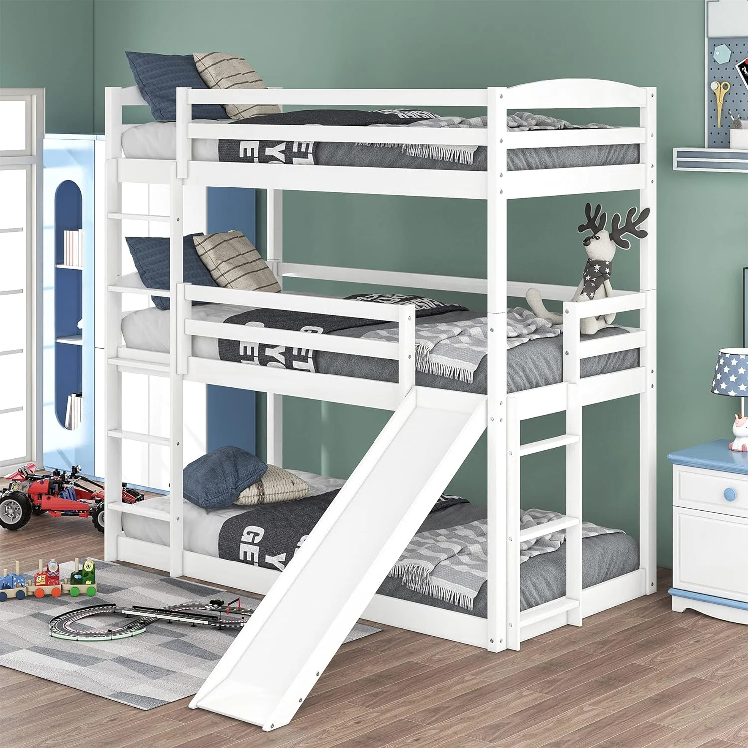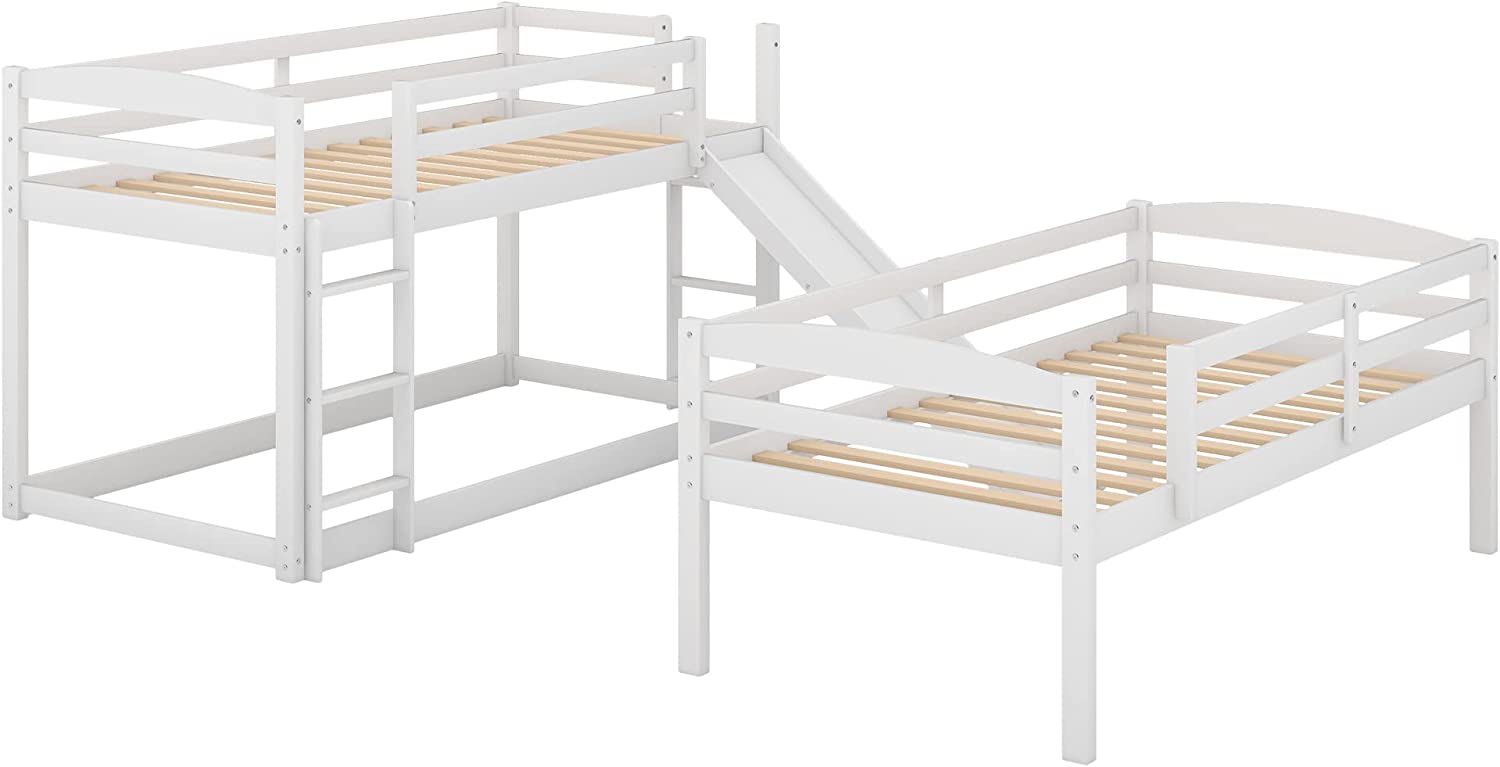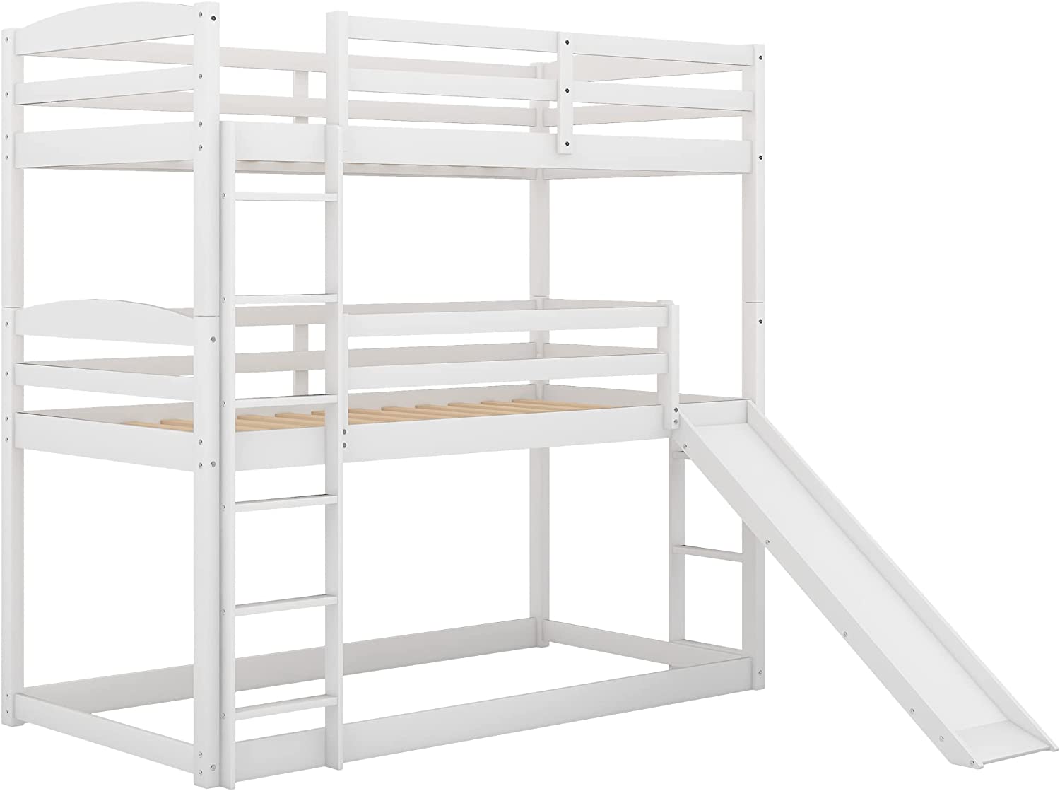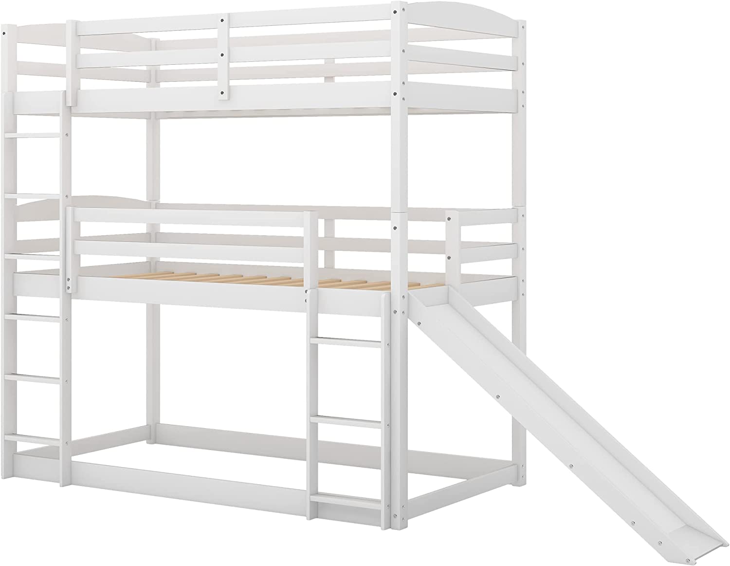 Triple Bunk Bed With Slide, -Over--Over- Triple Bed Frame With Built-In Ladder And Guardrails For Kids (White)