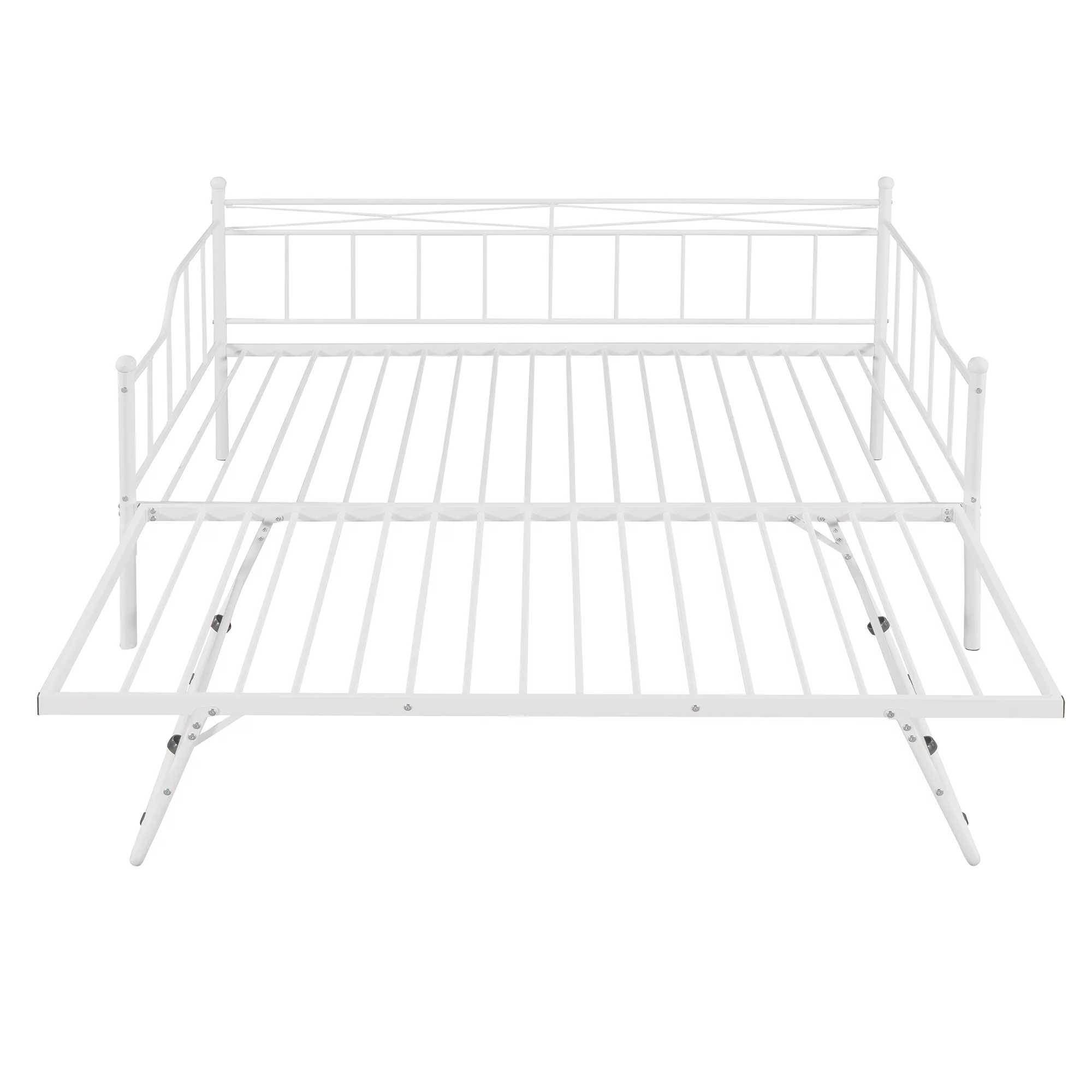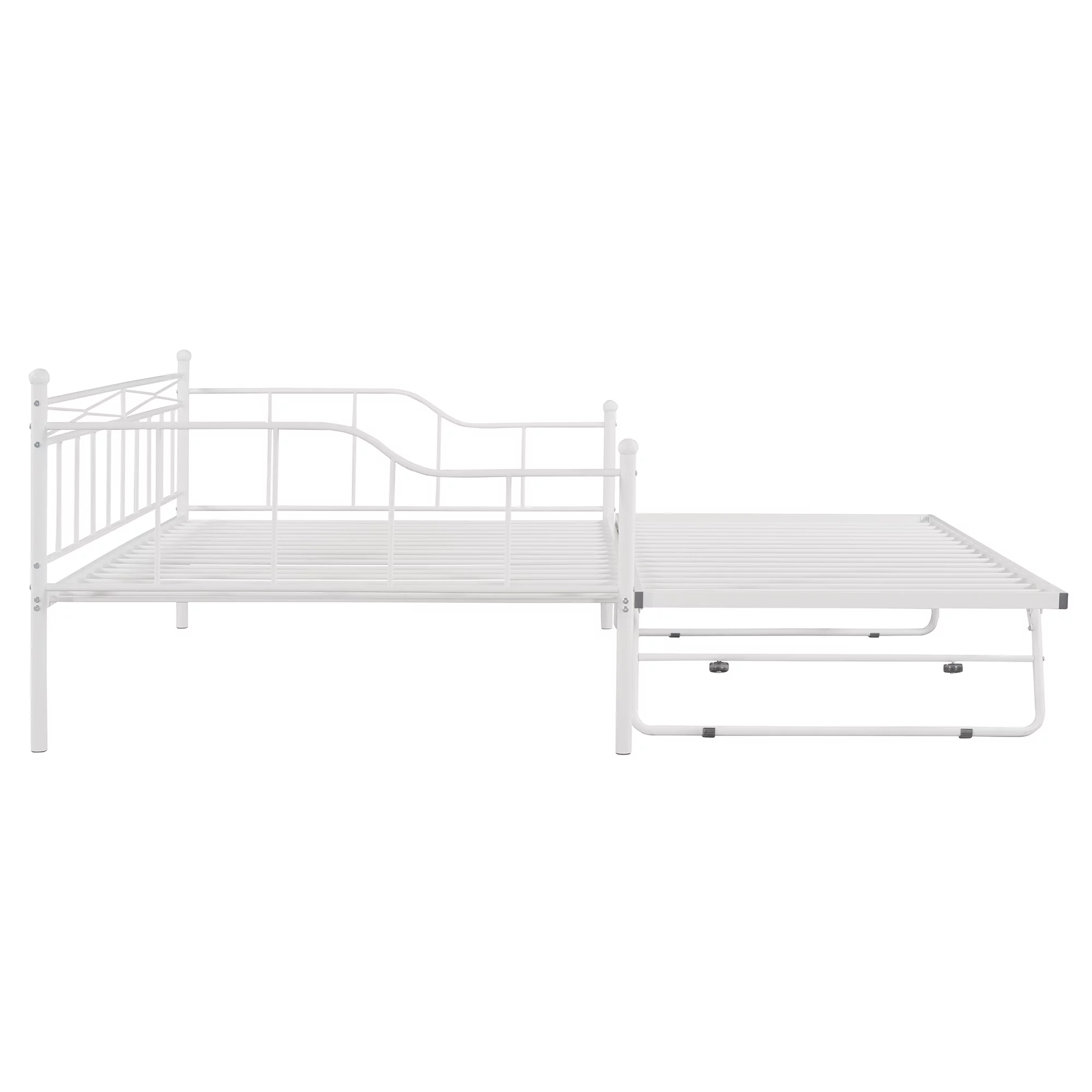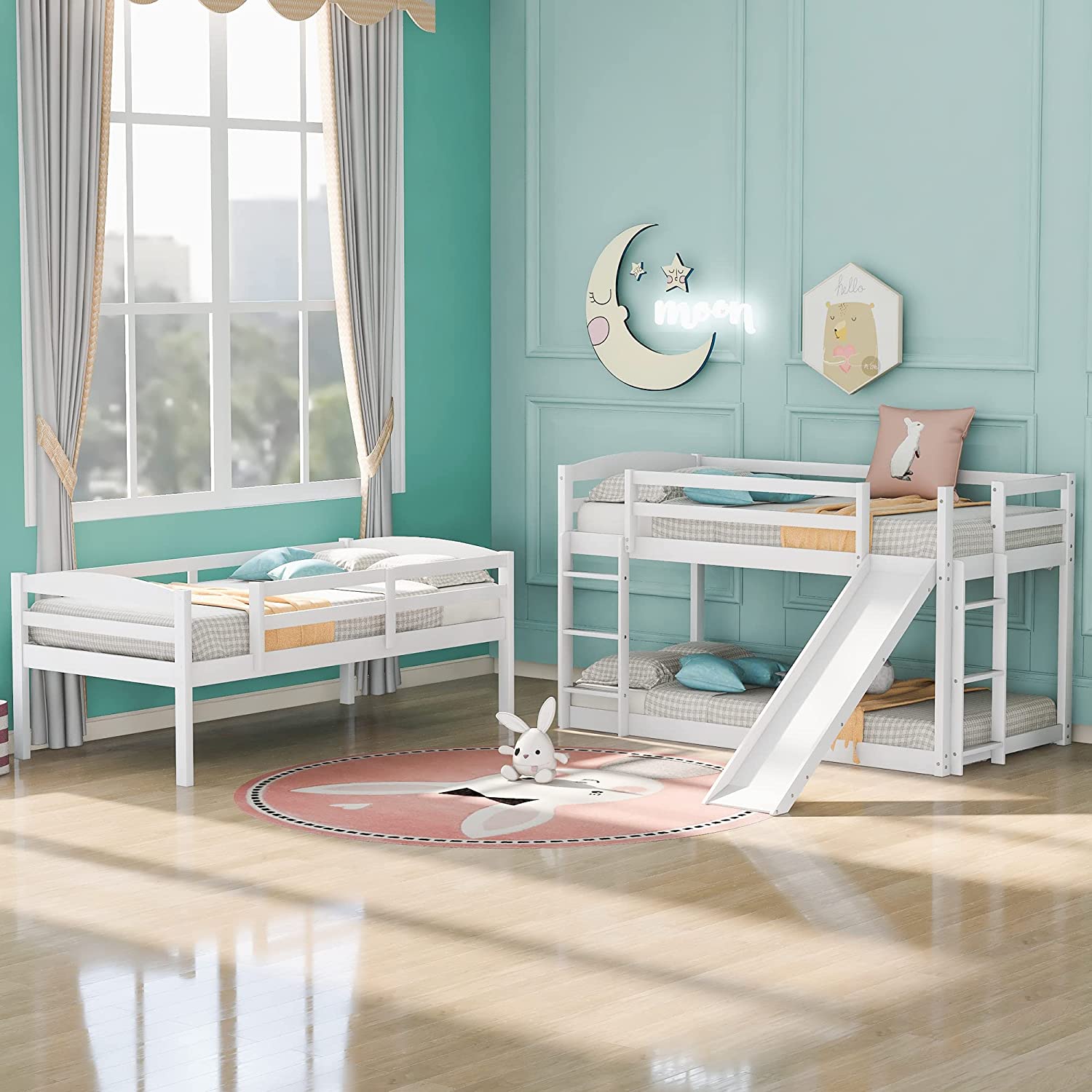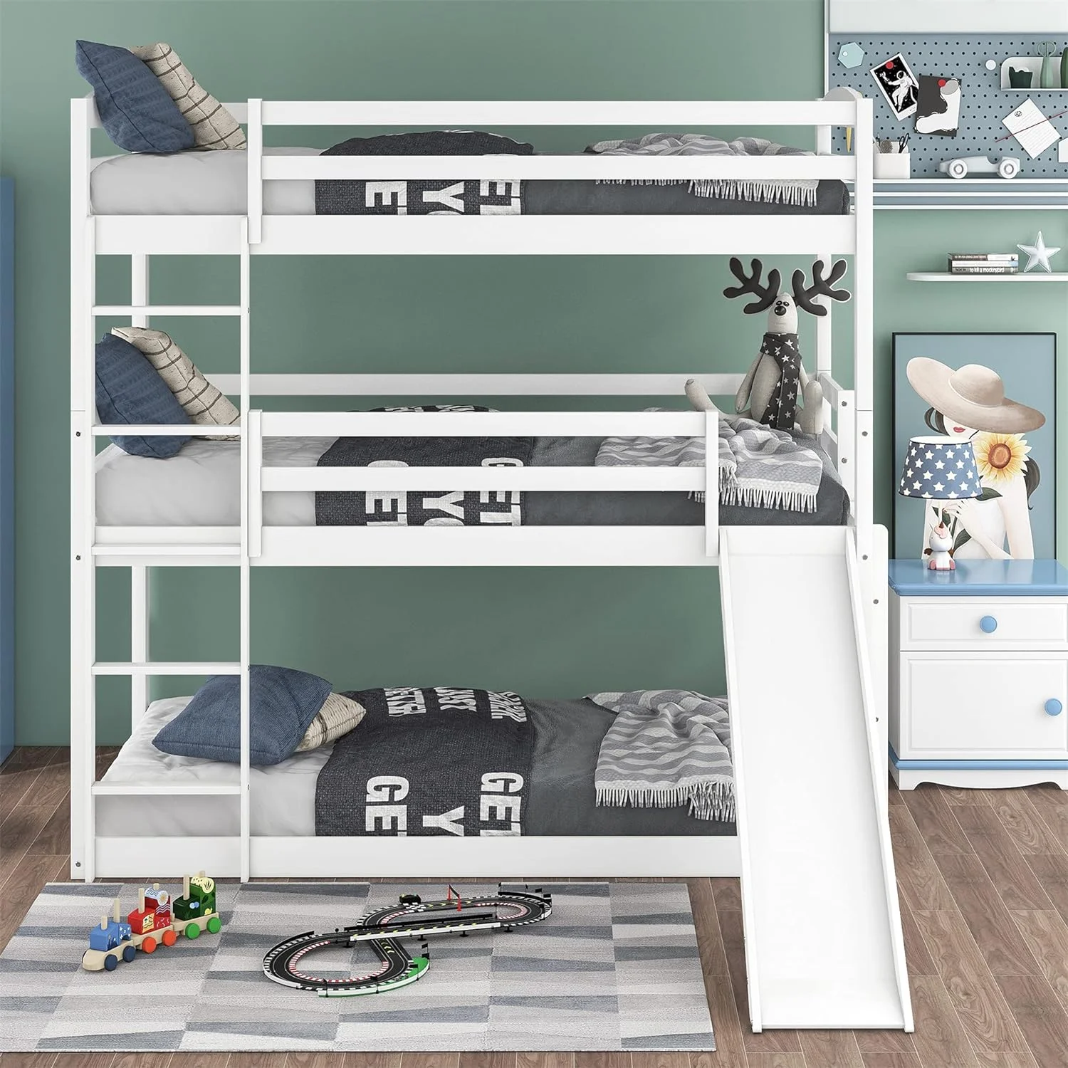 Triple Bunk Bed With Slide, -Over--Over- Triple Bed Frame With Built-In Ladder And Guardrails For Kids (White)