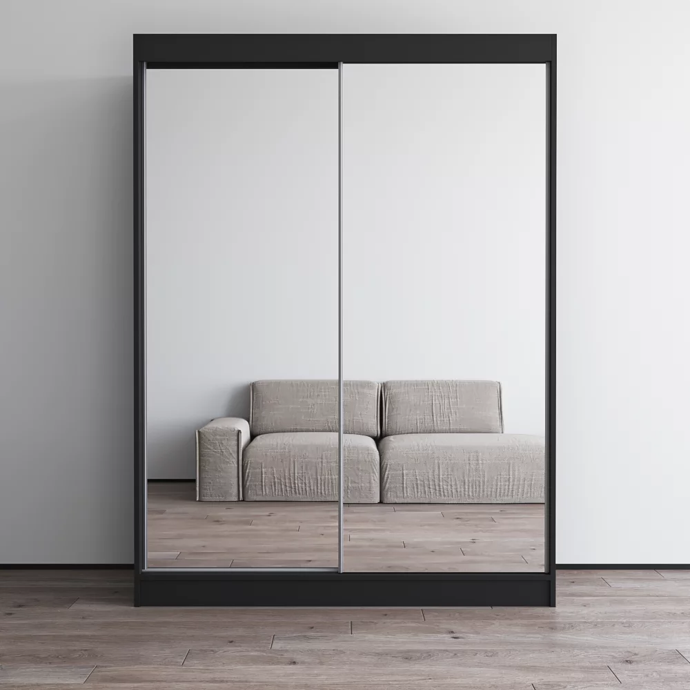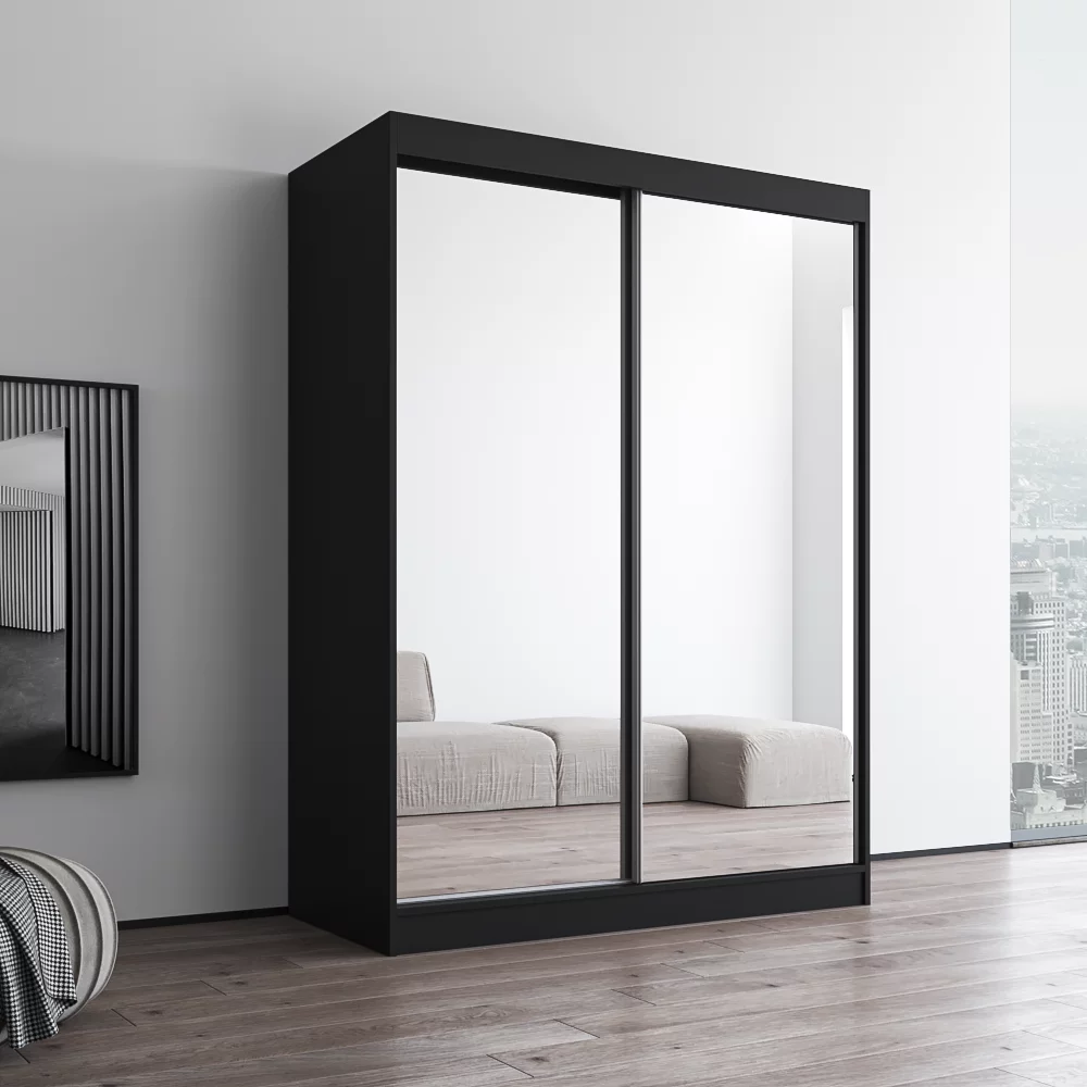 Aria 2 Door 59" Wide Modern High Gloss Wardrobe Armoire, Black Body with All Mirror Fronts