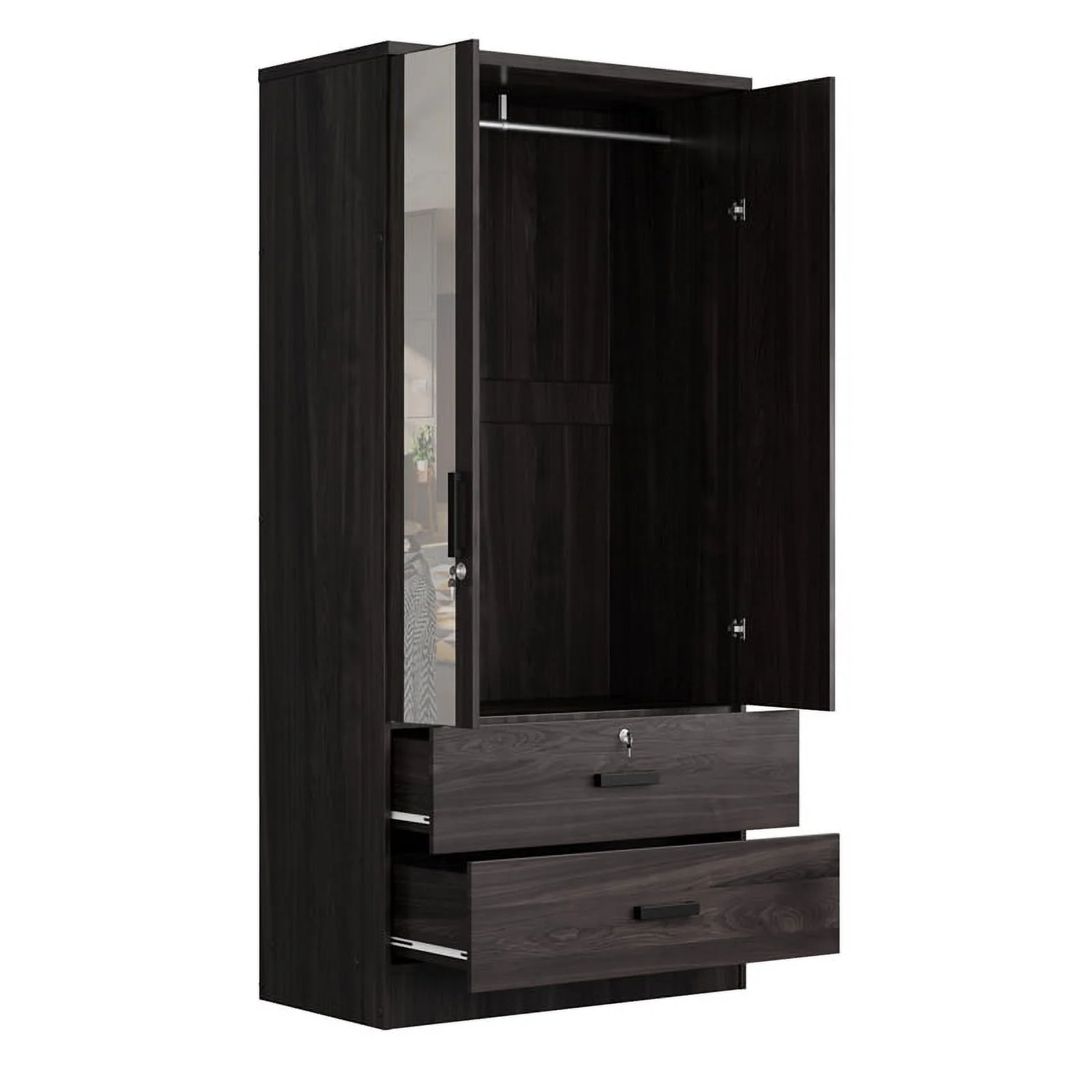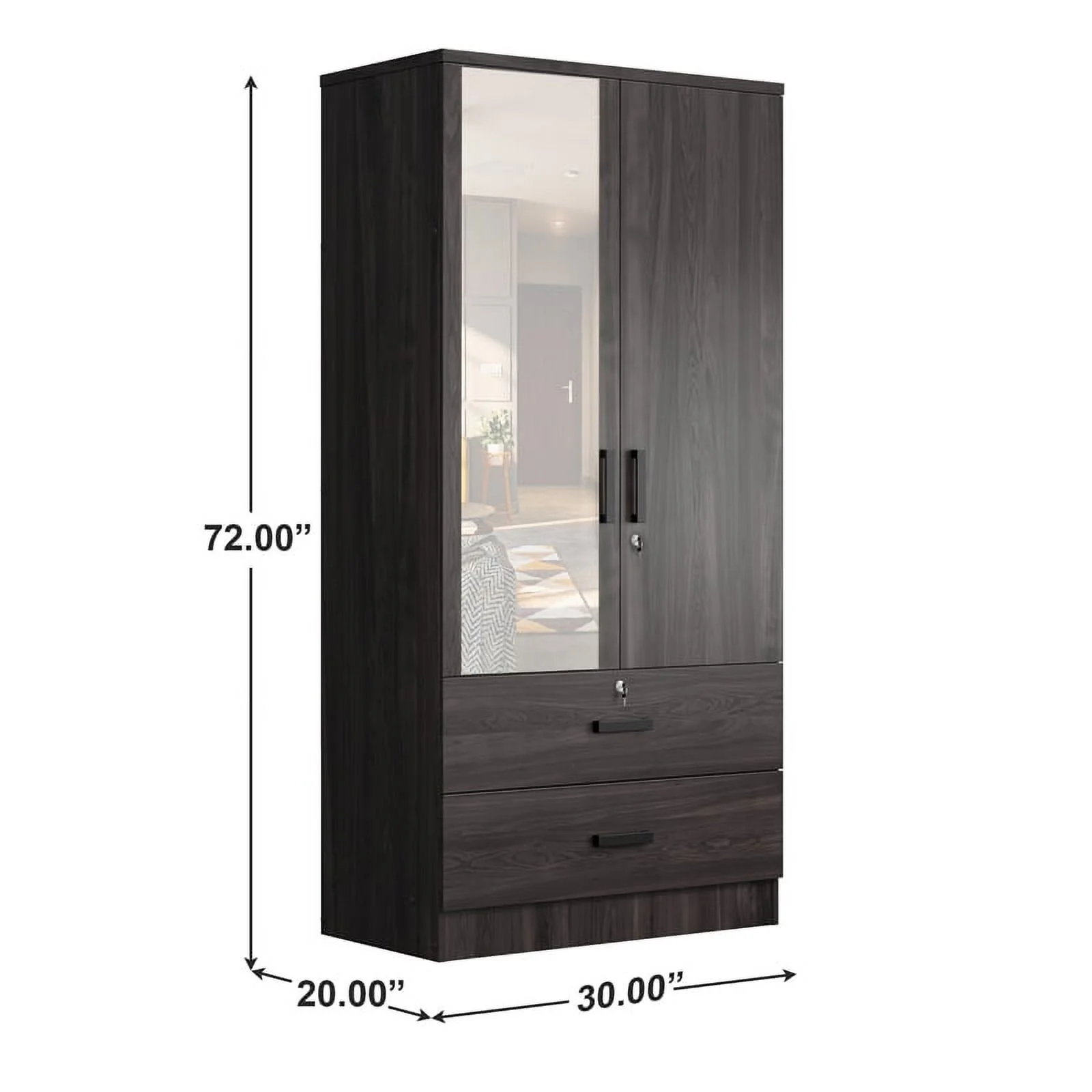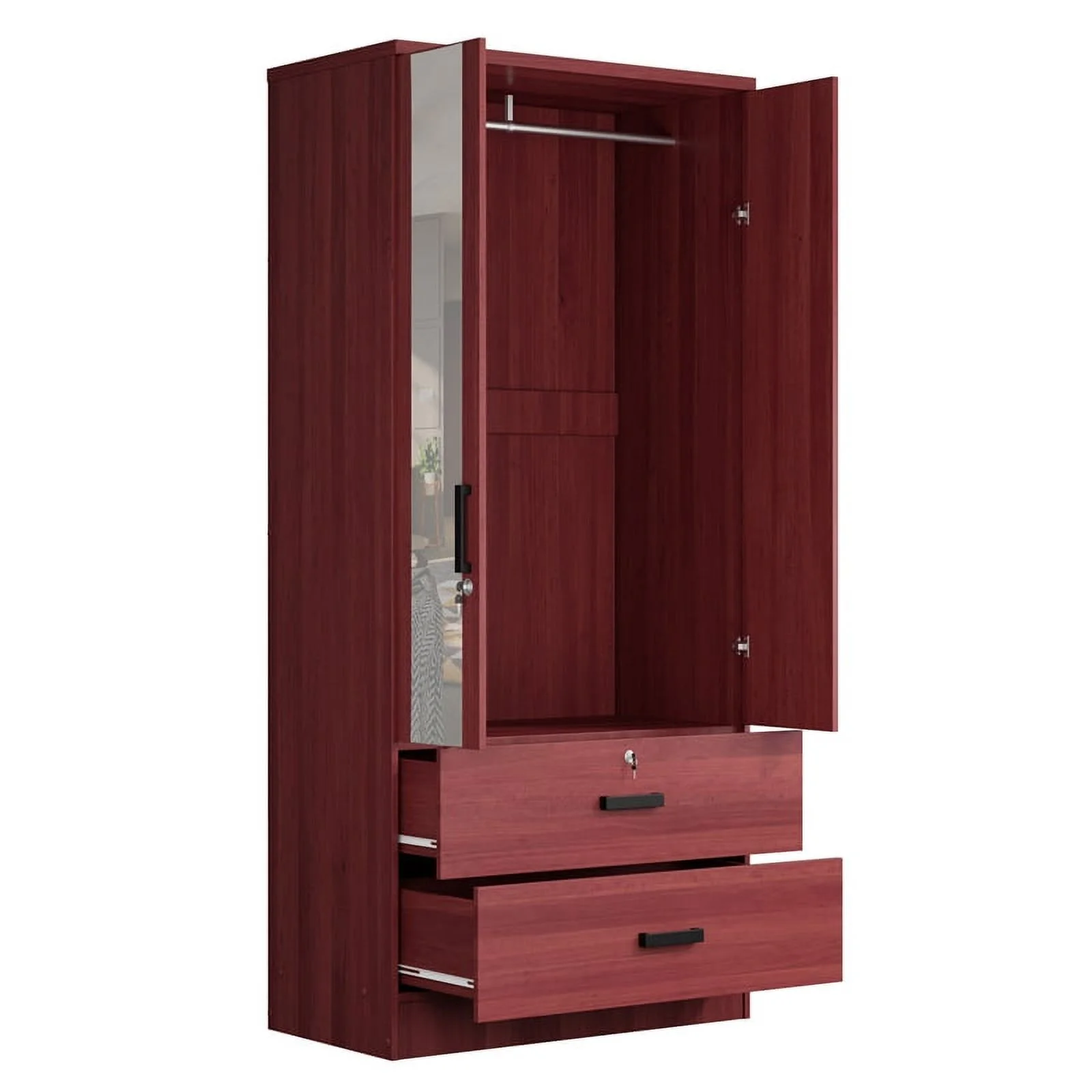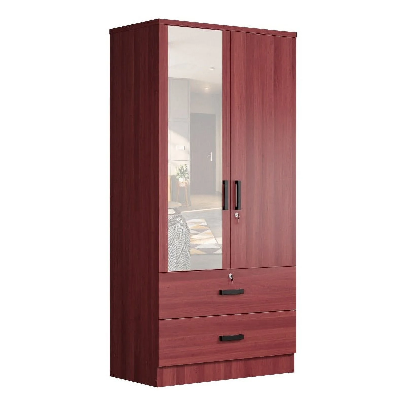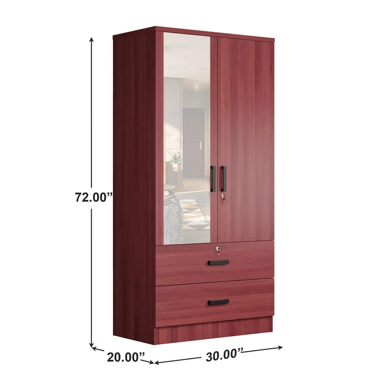 Better Home Products Grace Armoire Wardrobe with Mirror & Drawers in Mahogany