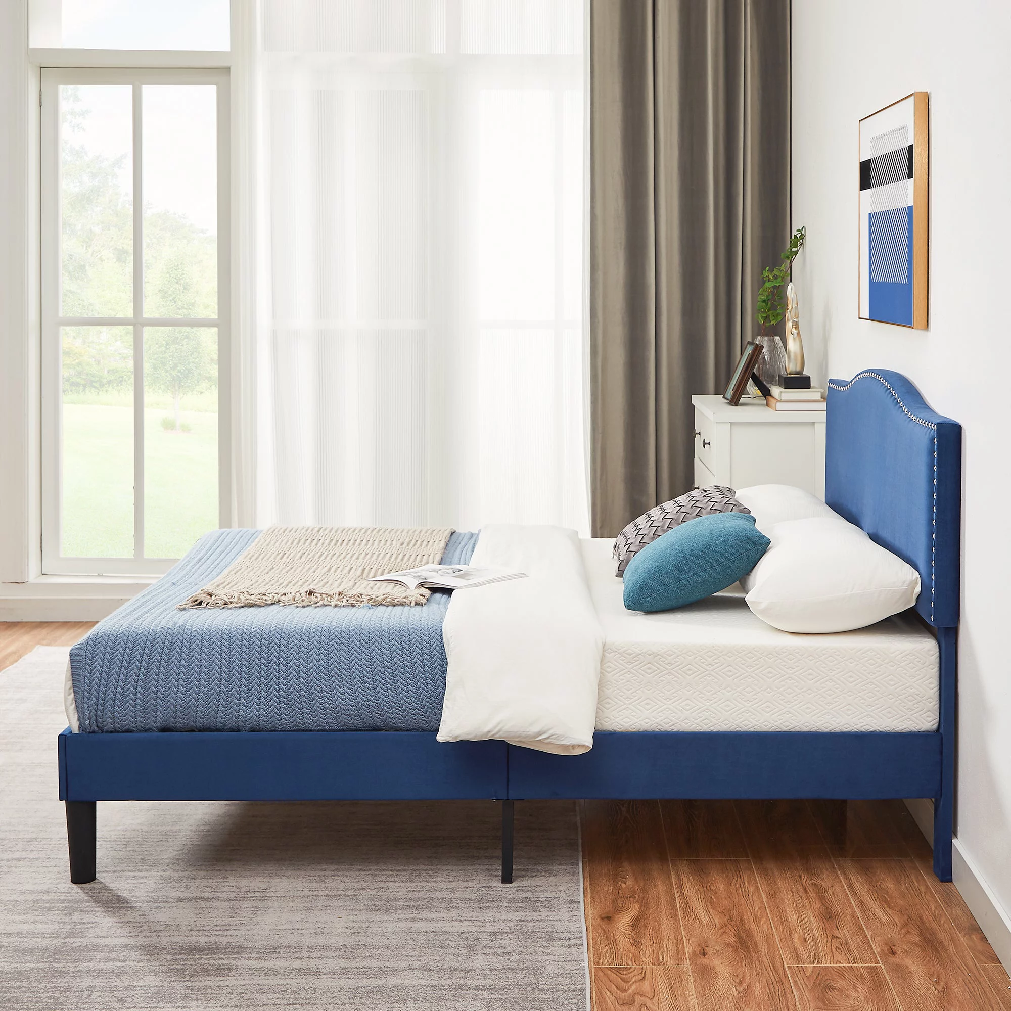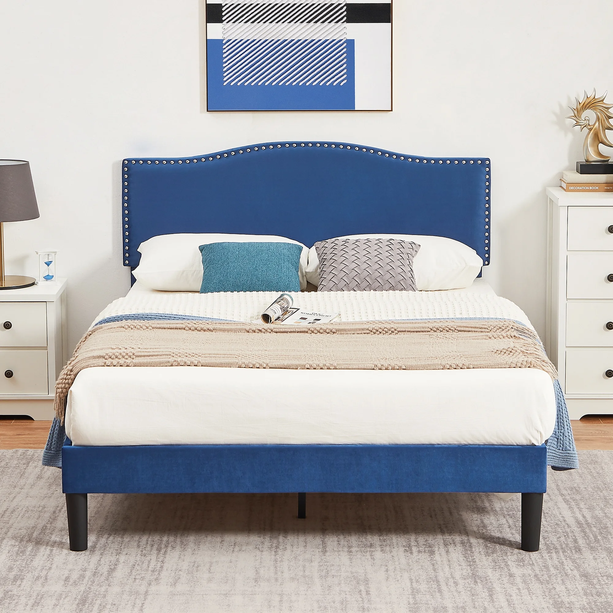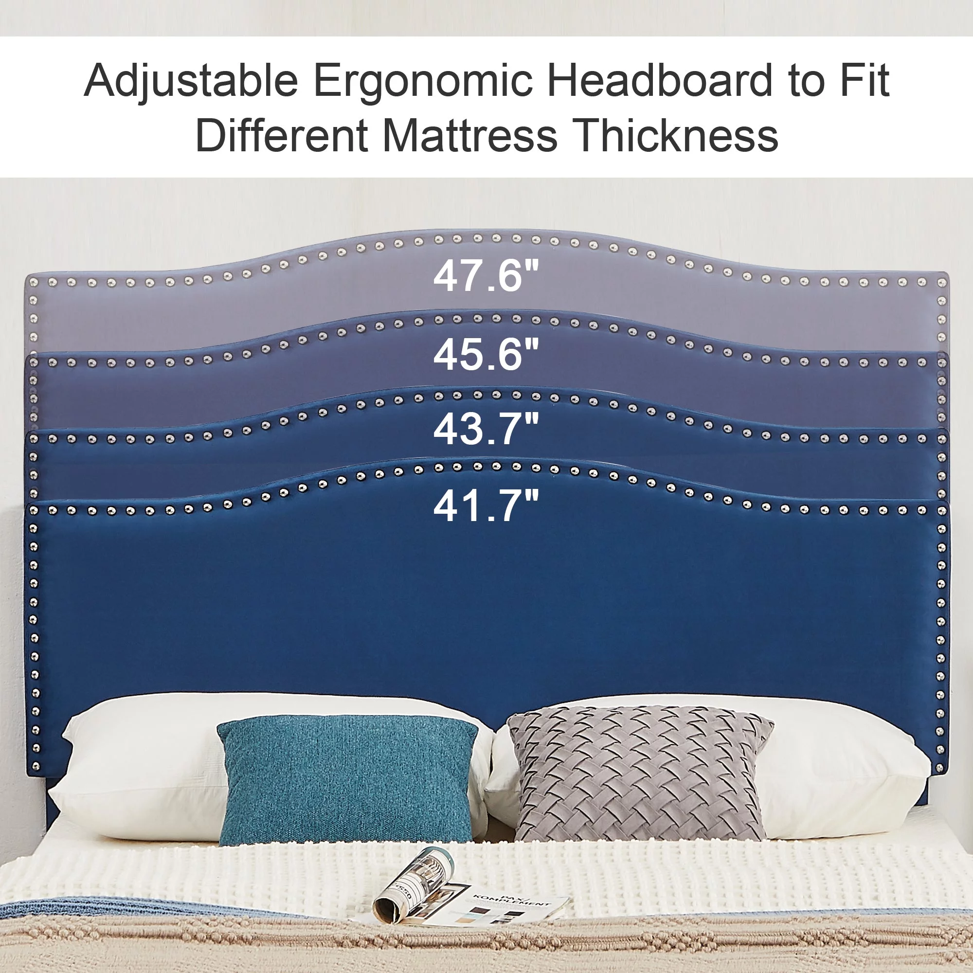 VECELO Queen Size Bed Frame, Upholstered Platform Bed with Adjustable Headboard, No Box Spring Needed, Dark Blue
