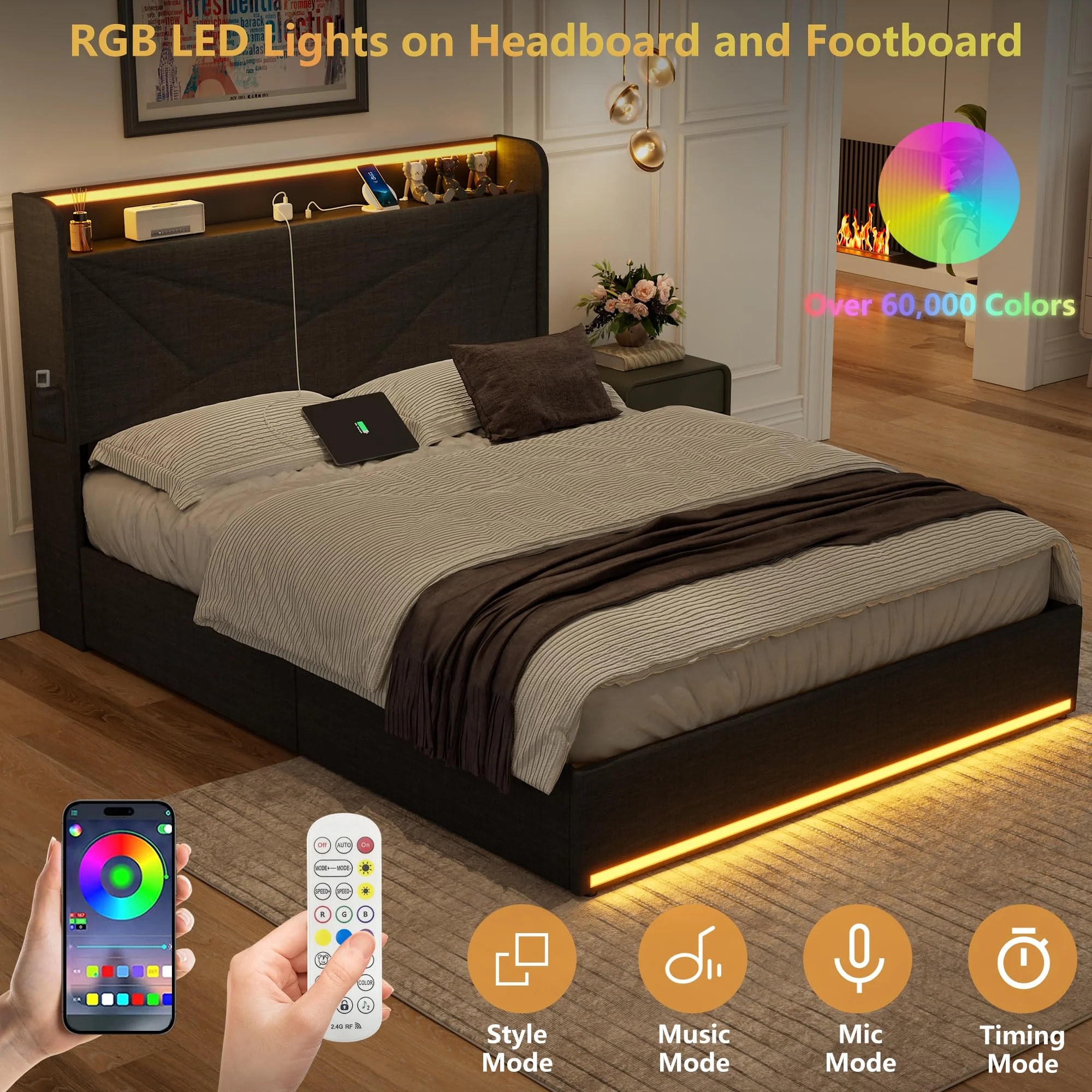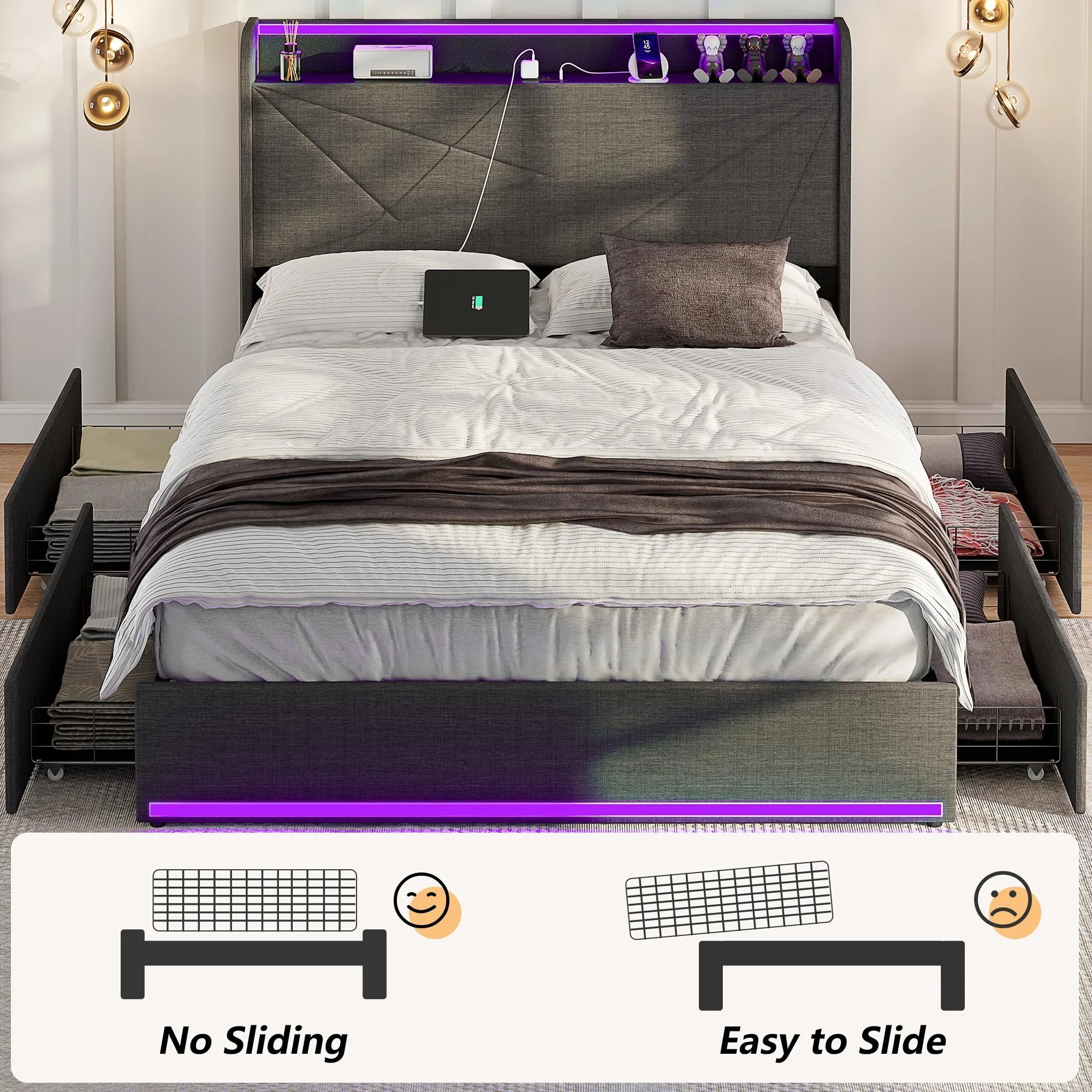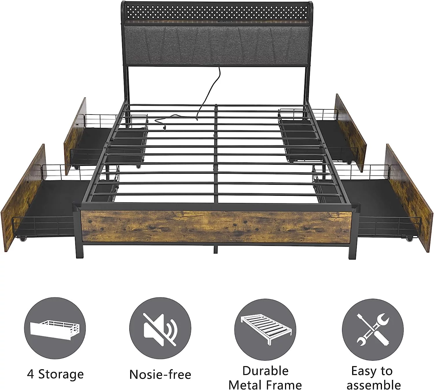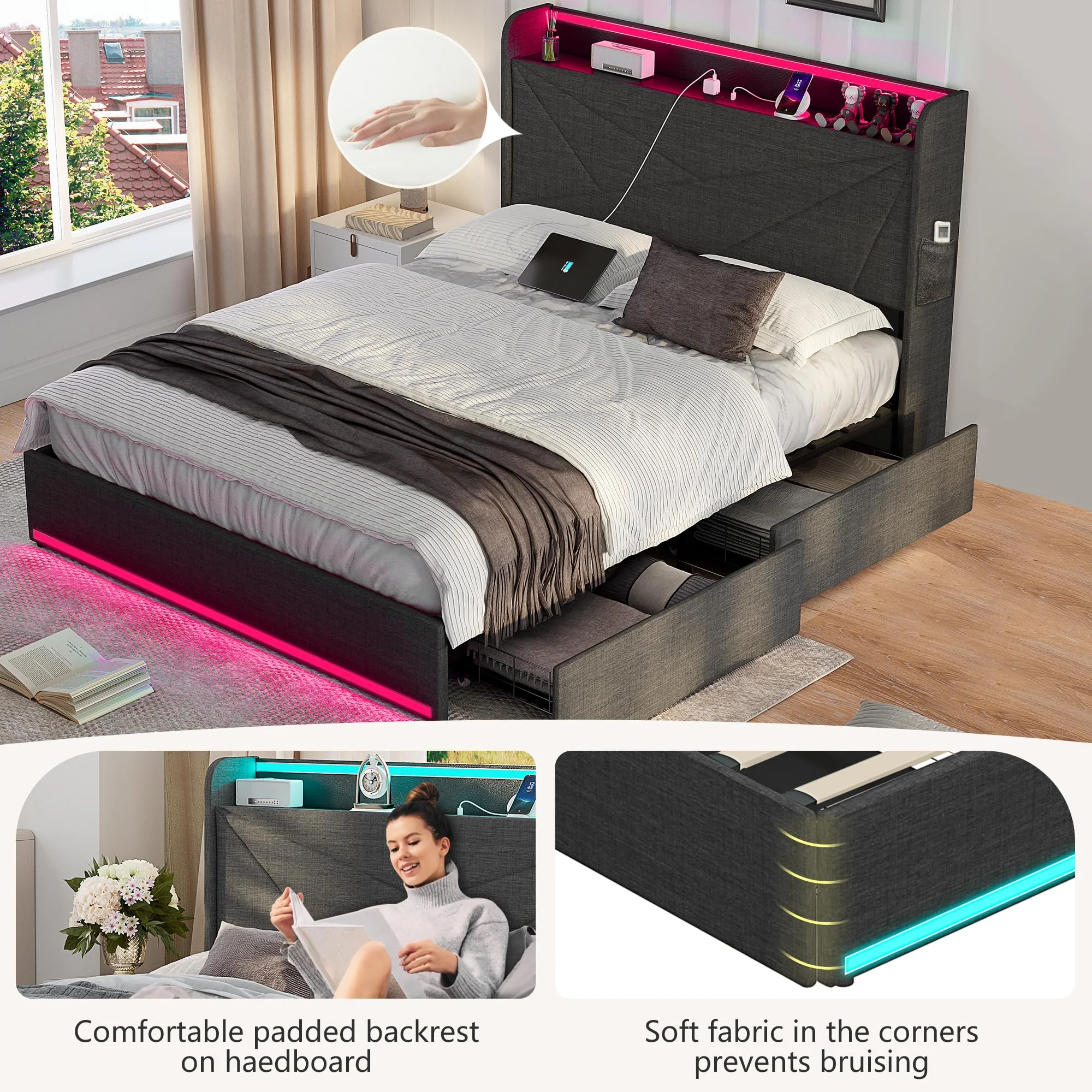 Afuhokles LED Queen Size Bed Frame with 4 Storage Drawers, Upholstered Platform Metal Bed Frame with Headboard, Black