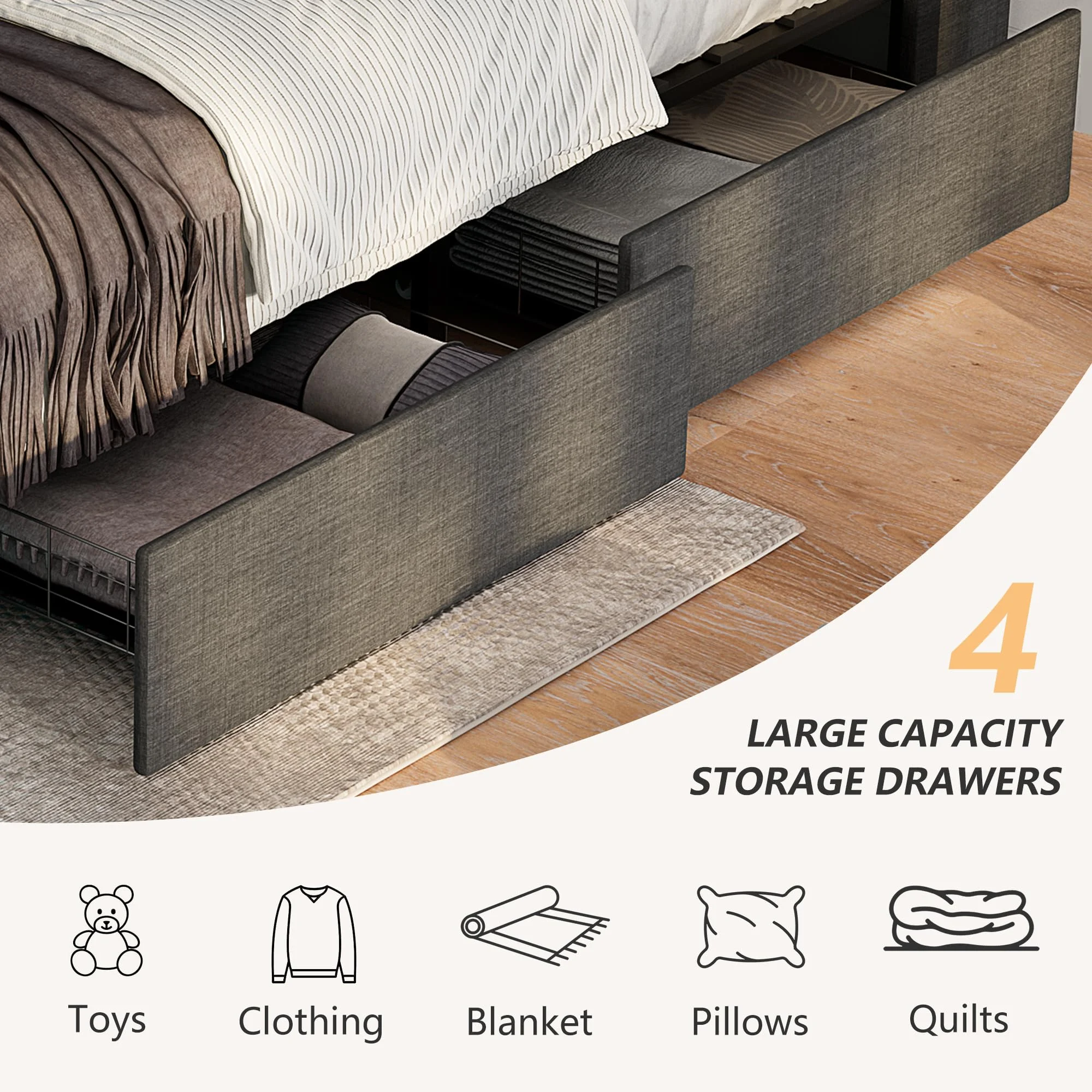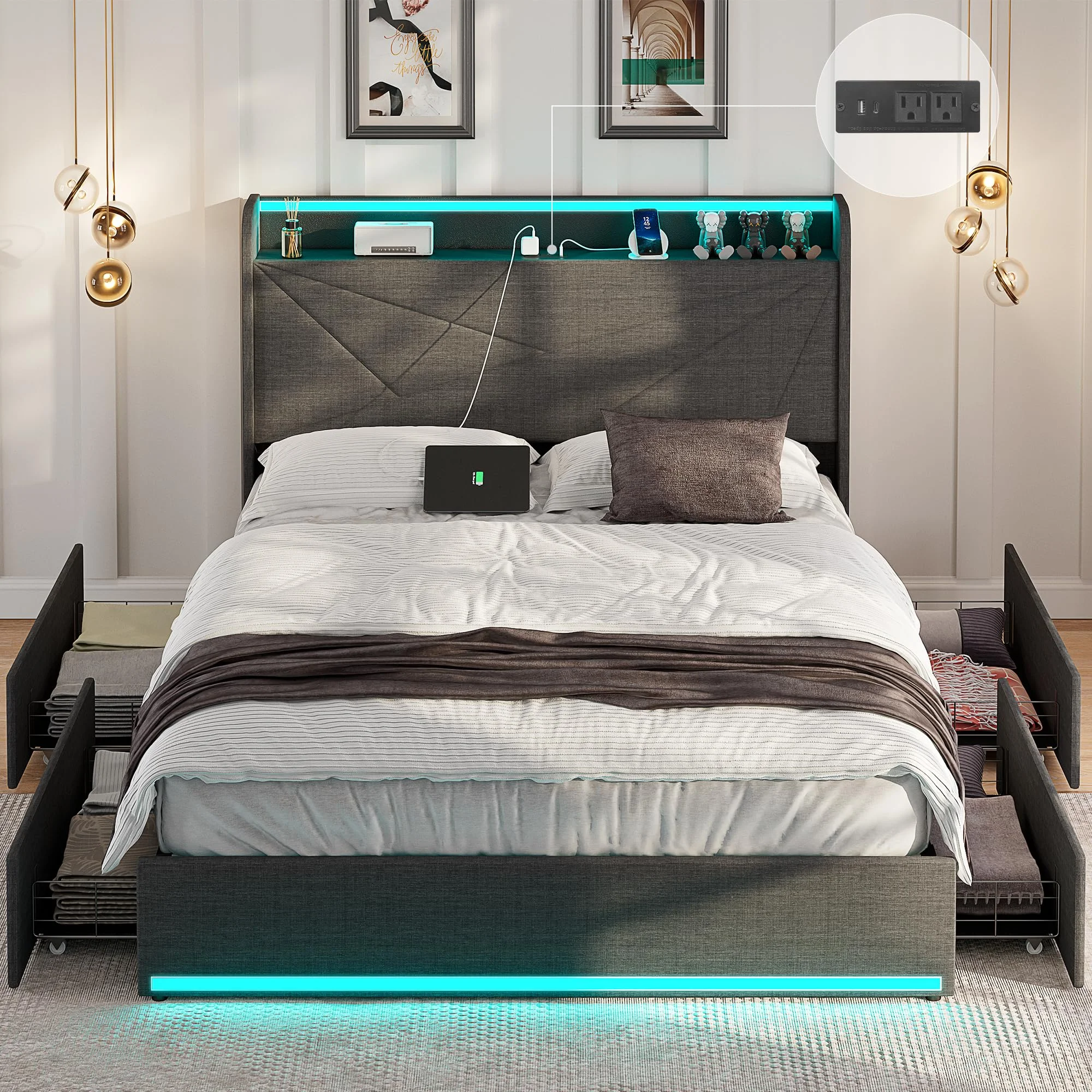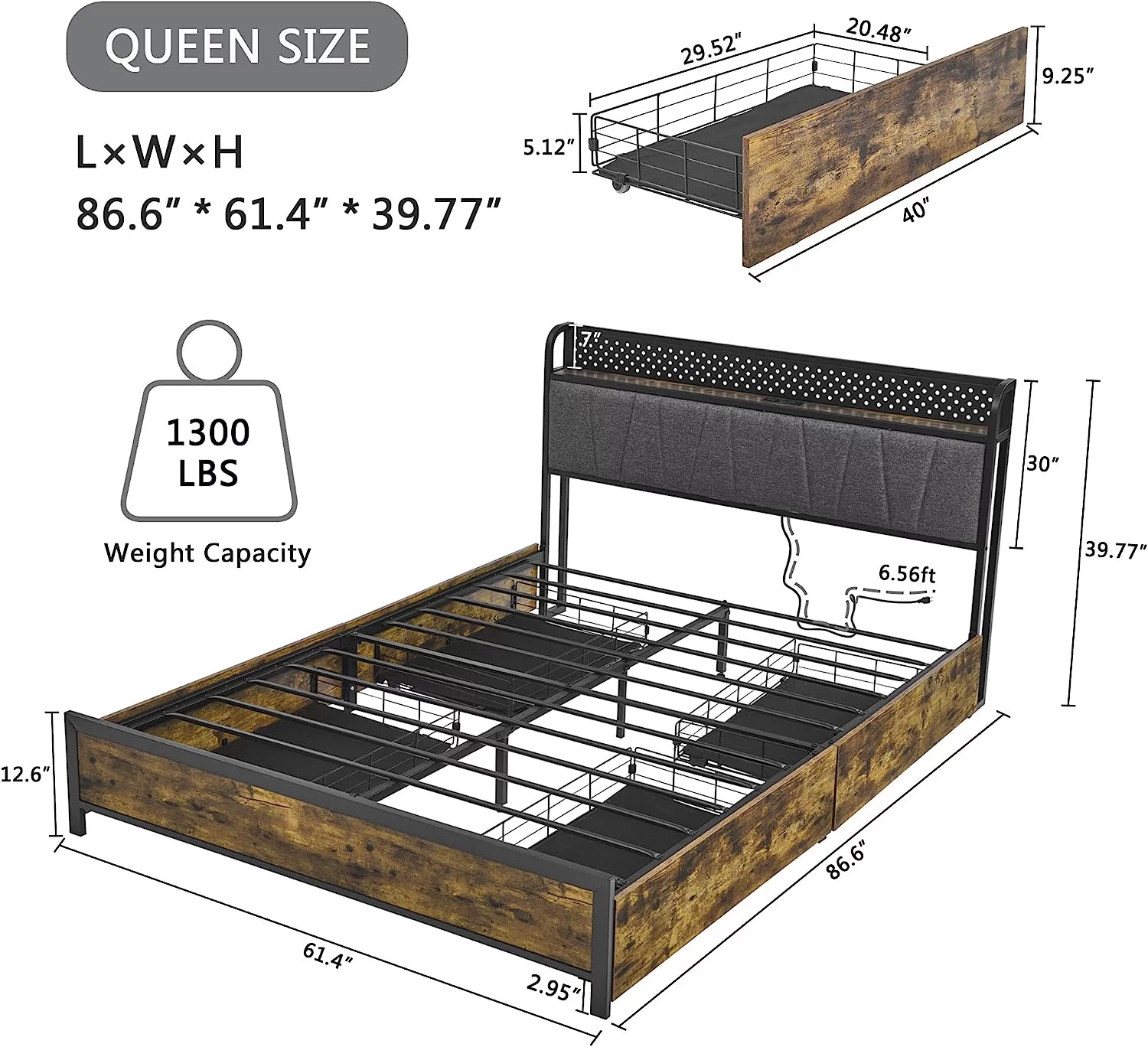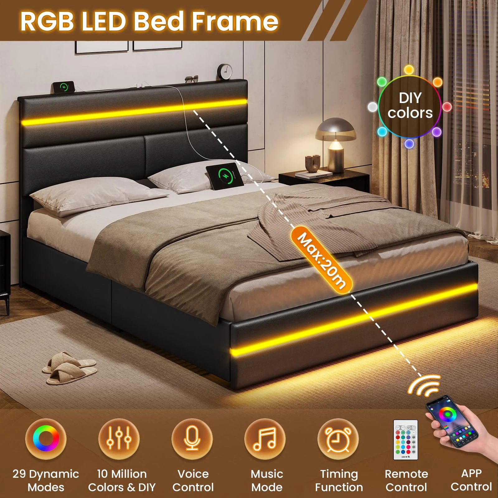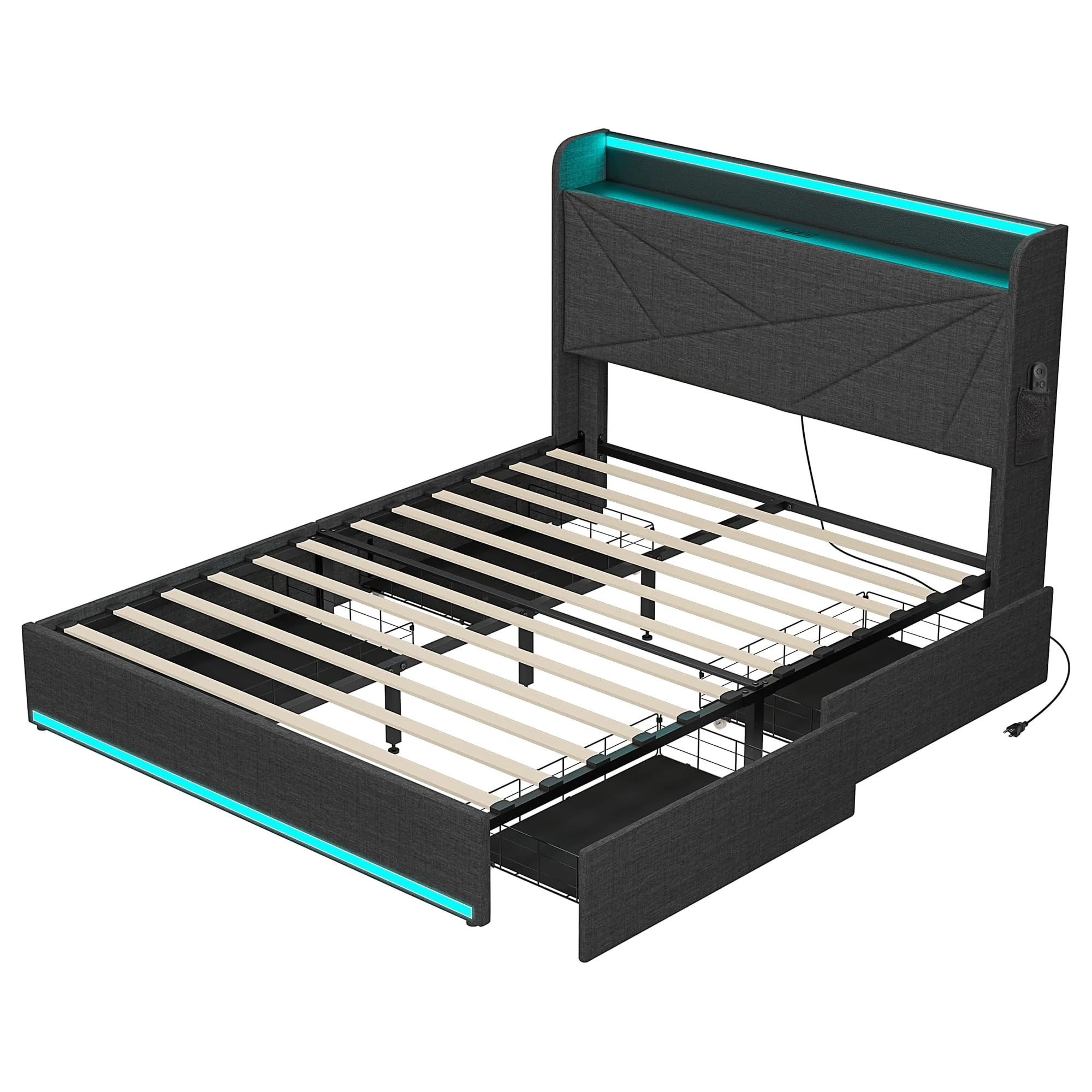 Afuhokles LED Queen Size Bed Frame with 4 Storage Drawers, Upholstered Platform Metal Bed Frame with Headboard, Black