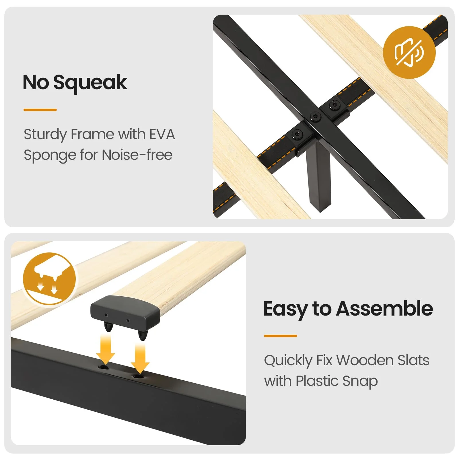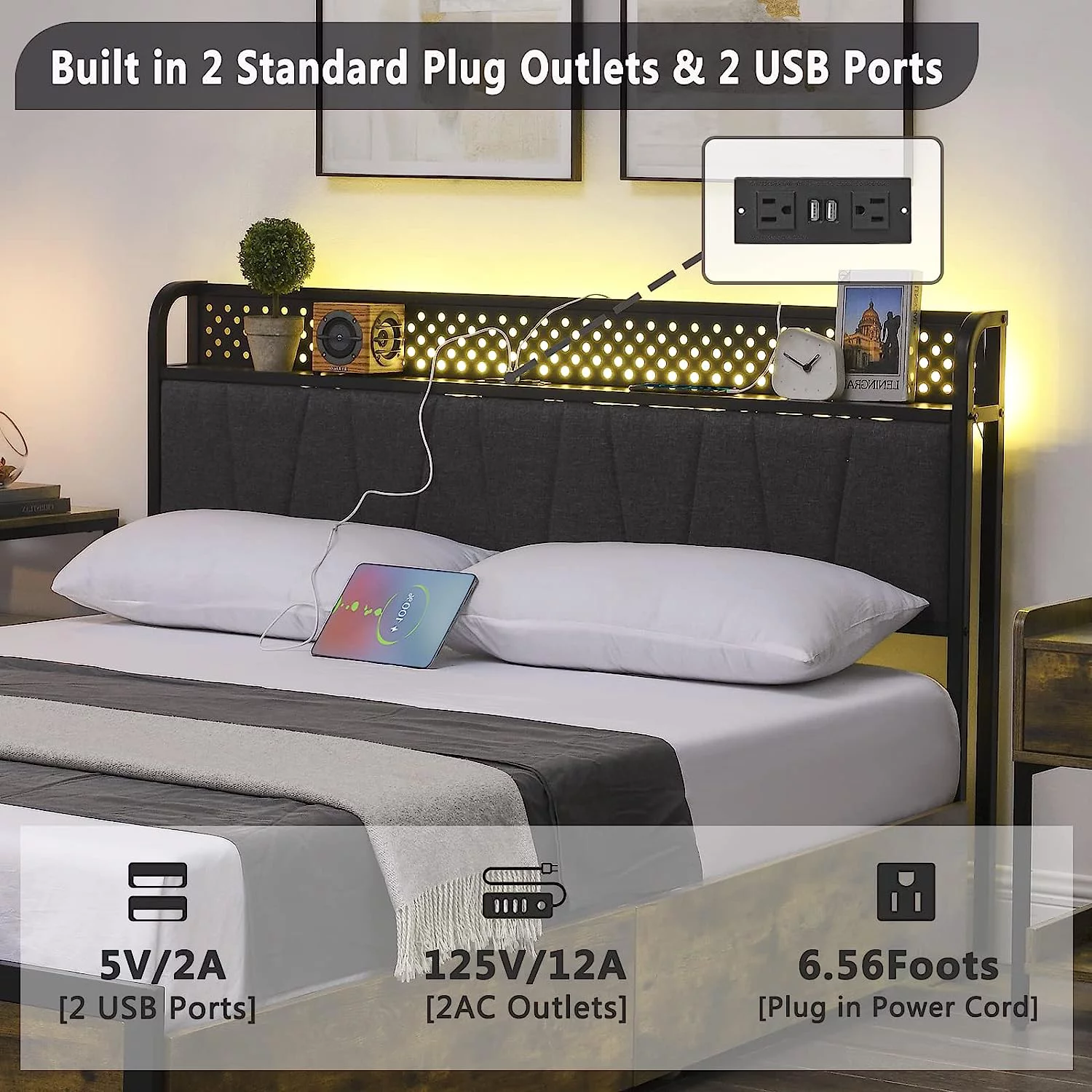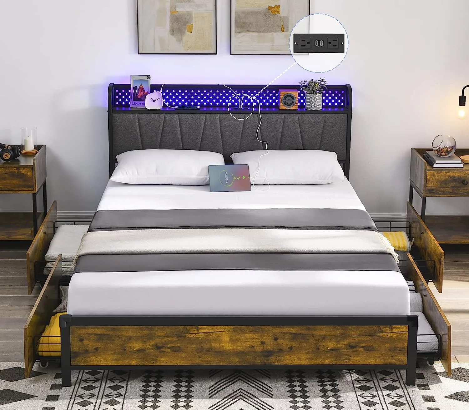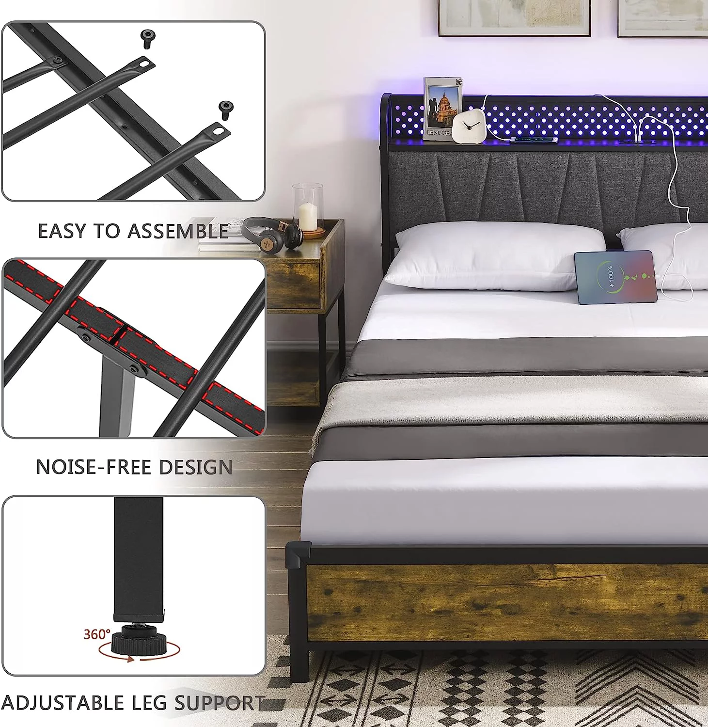 Afuhokles LED Queen Size Bed Frame with 4 Storage Drawers, Upholstered Platform Metal Bed Frame with Headboard, Black