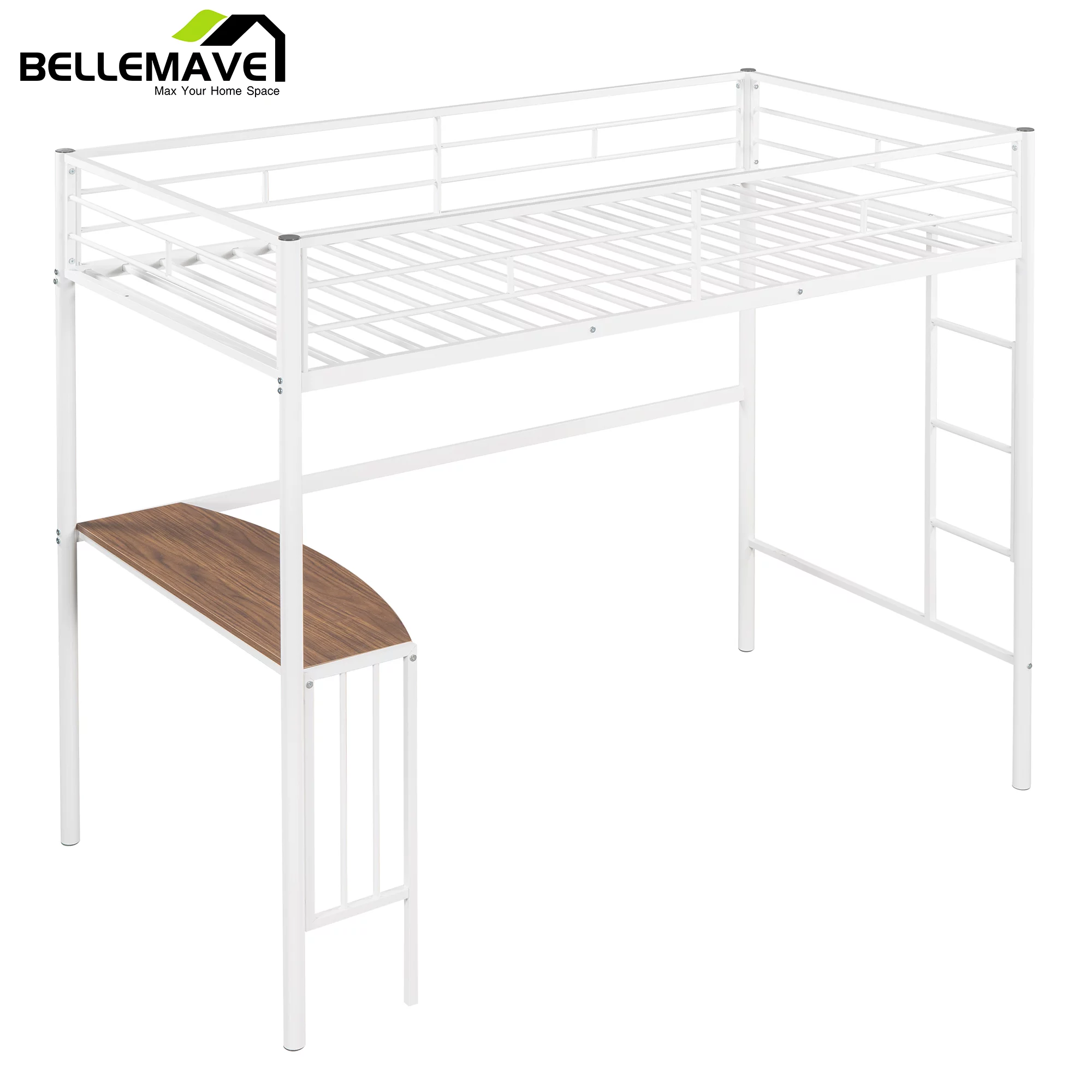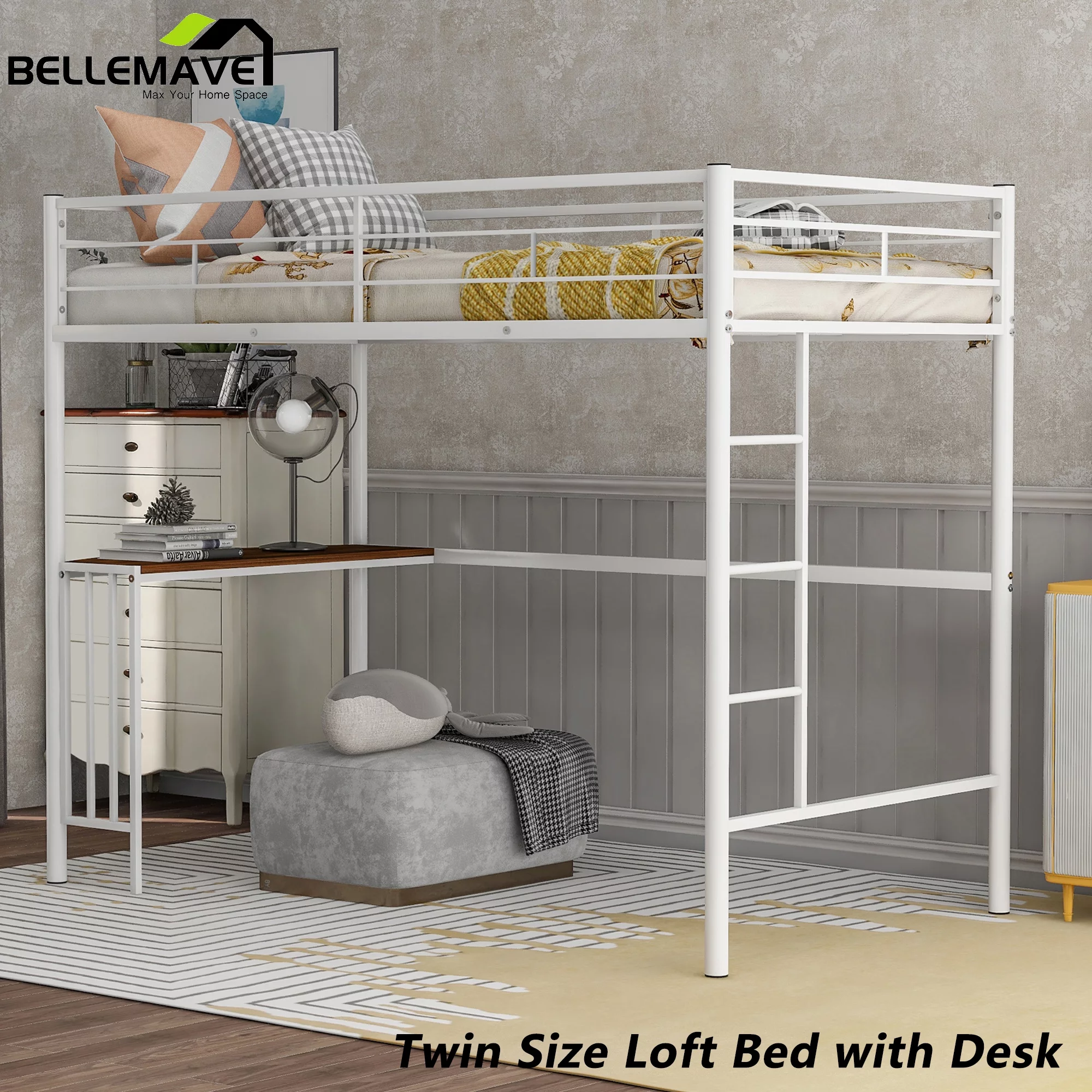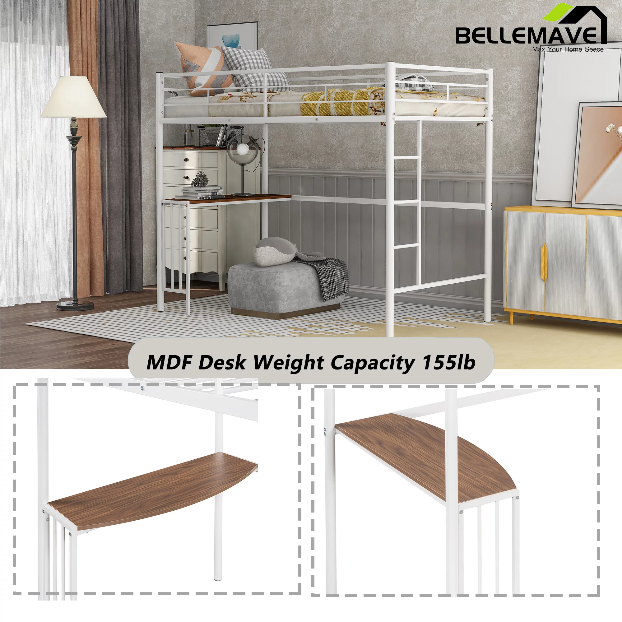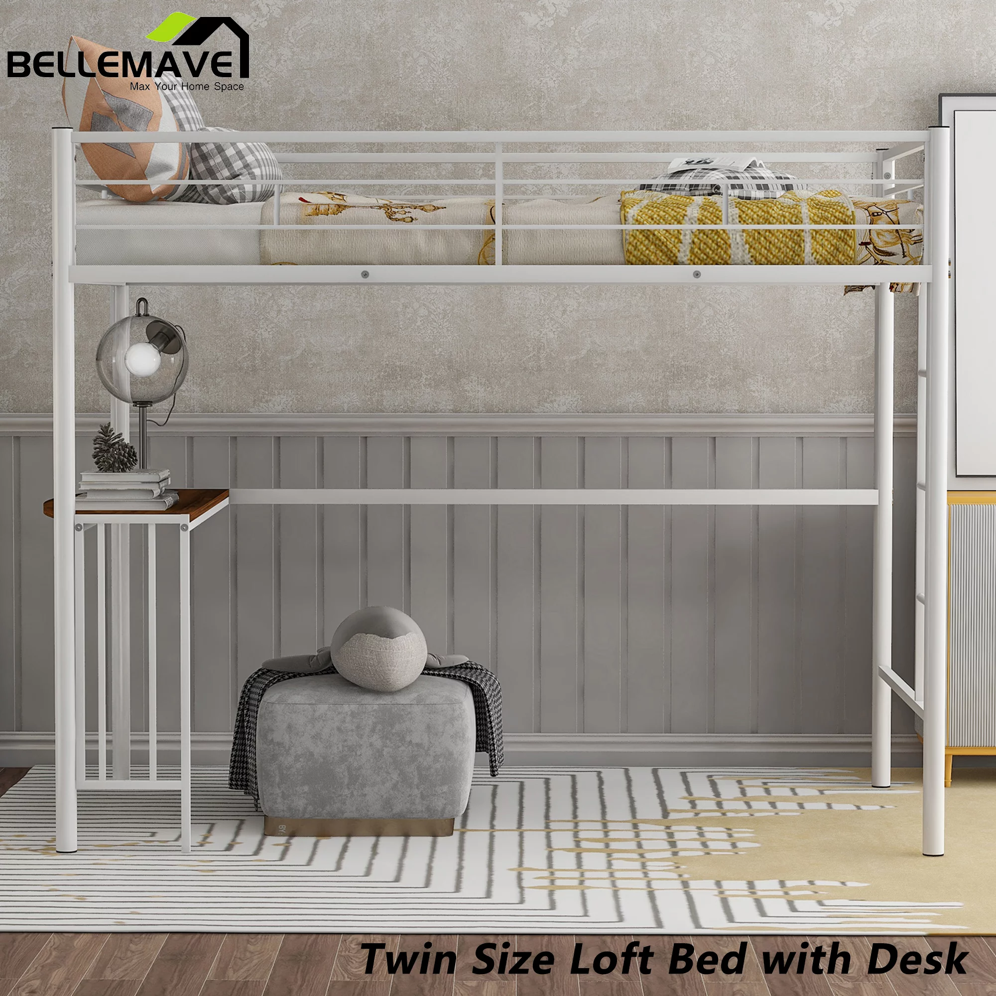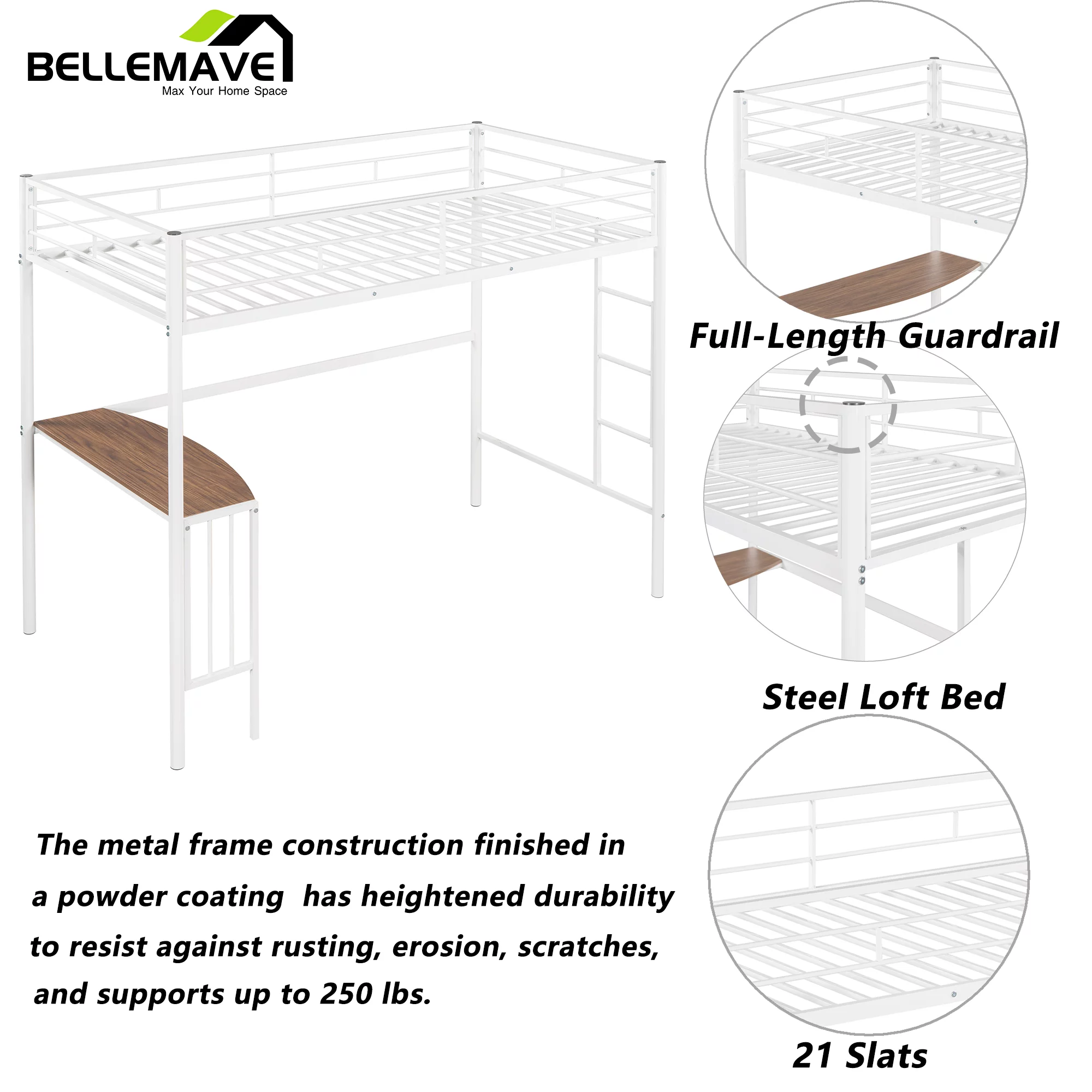 Gewnee Twin Size Metal Loft Bed with L-Shape Desk and Shelves for Kids,Teens,White