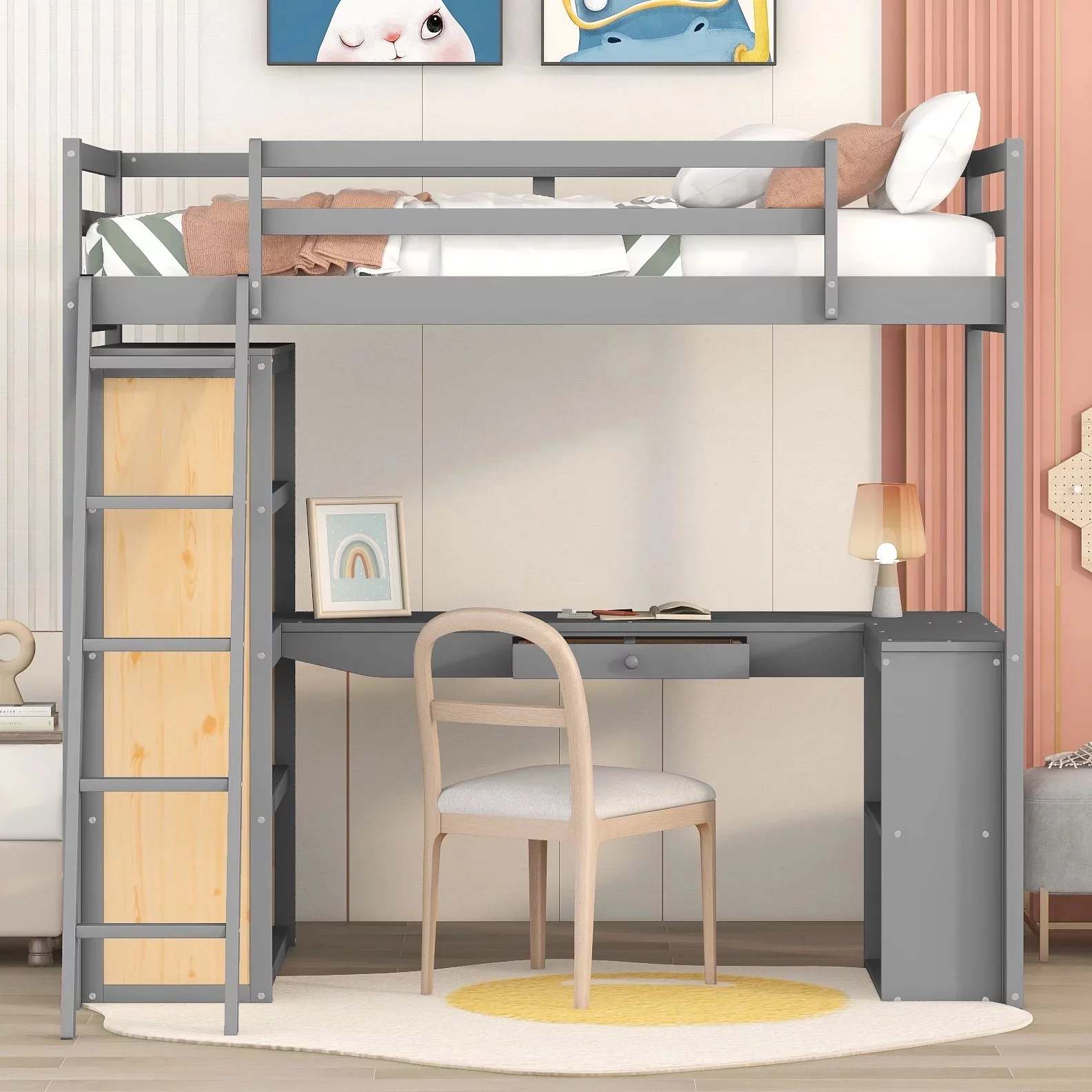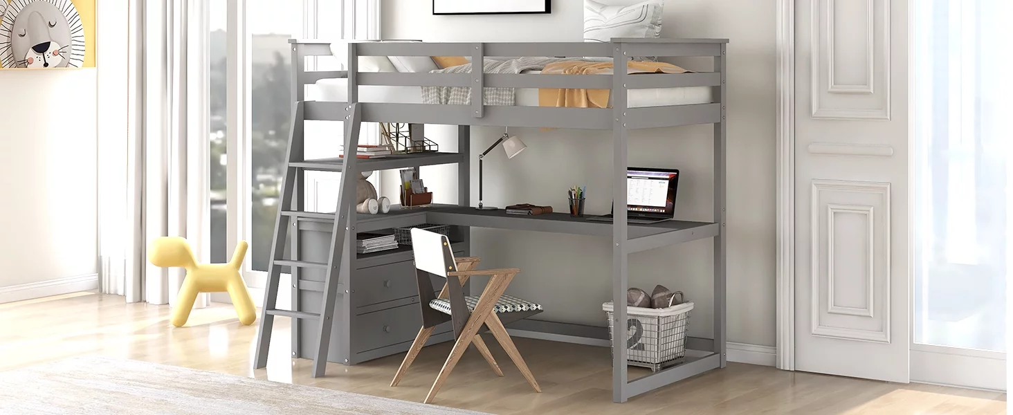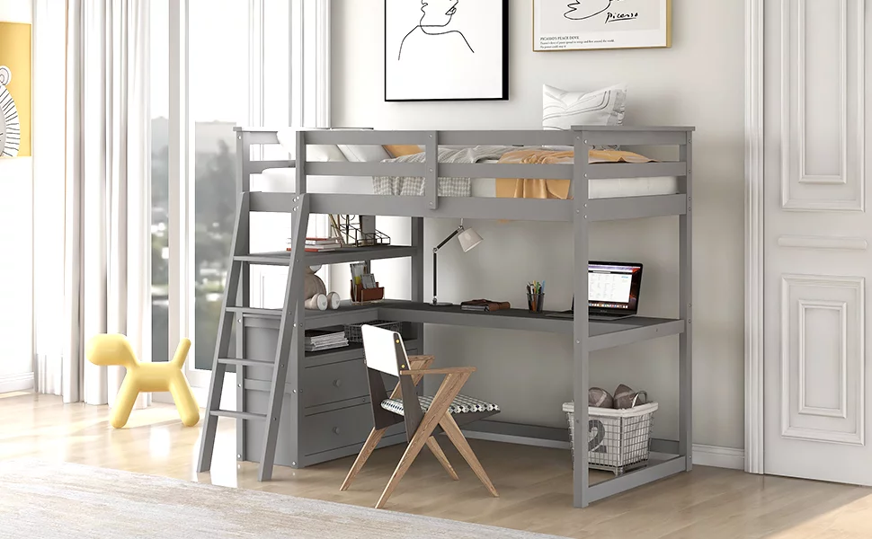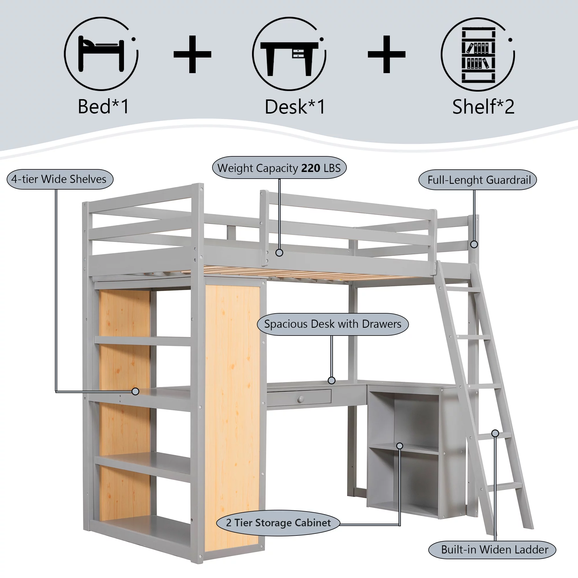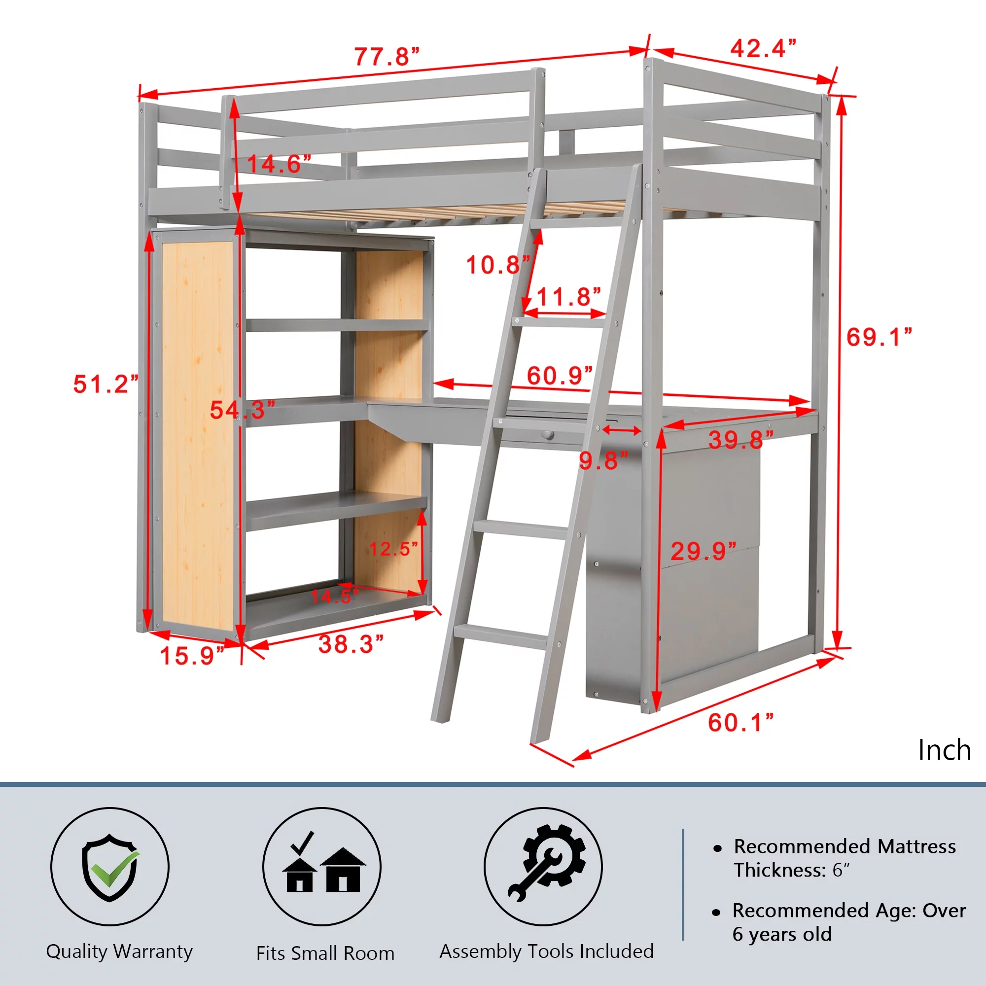 Livspace Twin Size Loft Bed with Desk and Shelves, Two Built-in Drawers, Gray