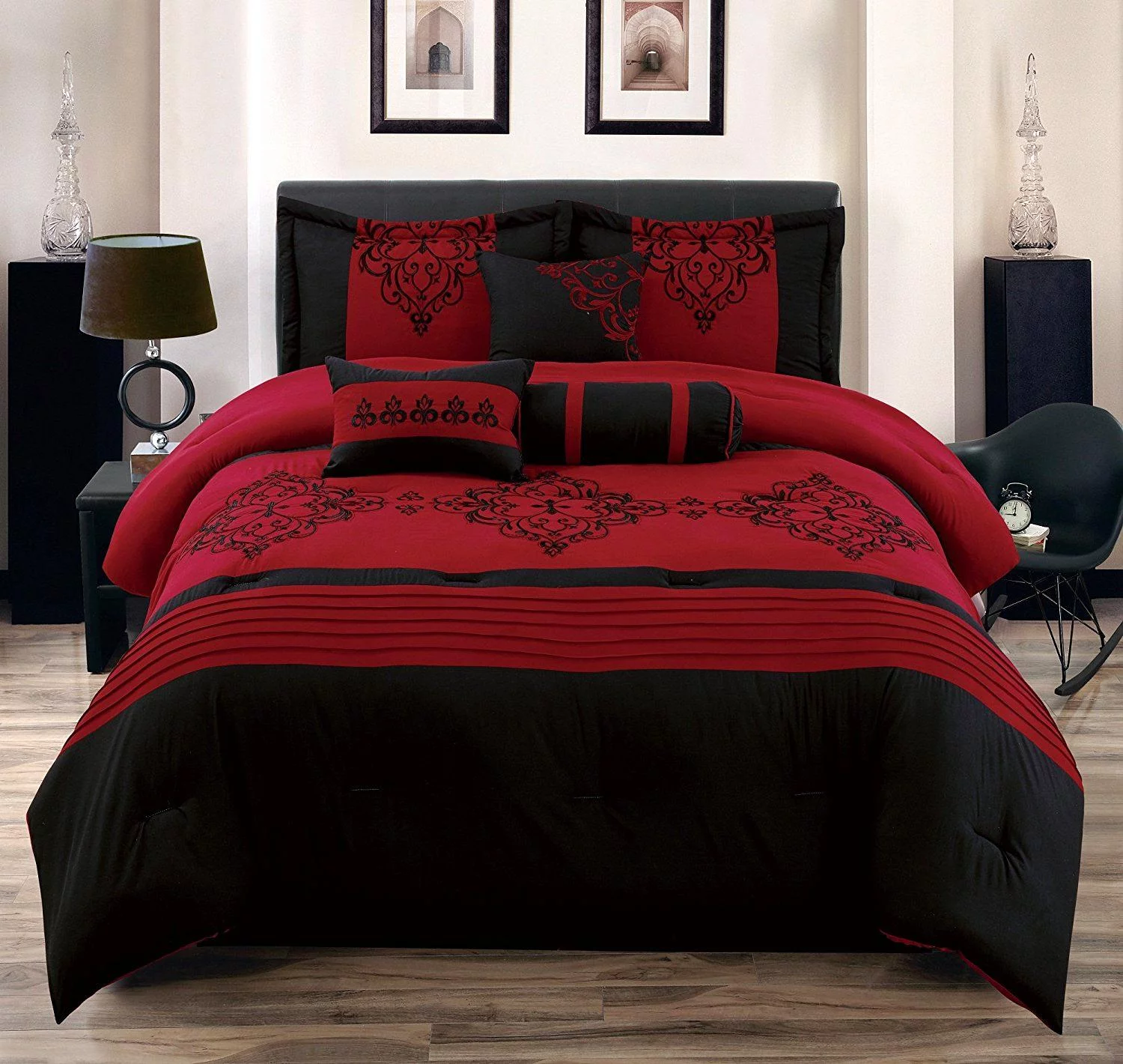 Heba Full Size 8-Piece Cotton Touch Comforter Set Red & Black Bed in a Bag Over-Sized Embroidered Bedding