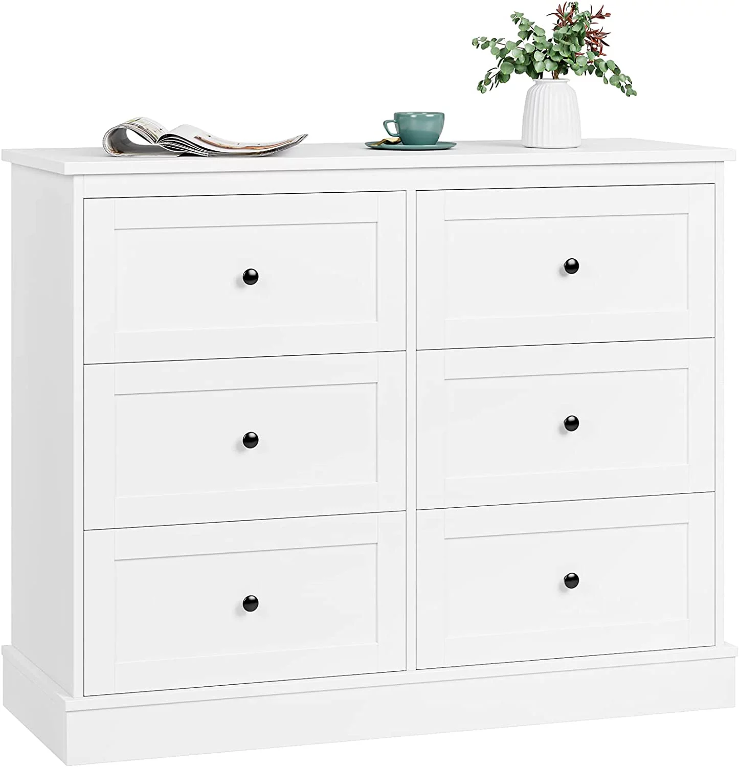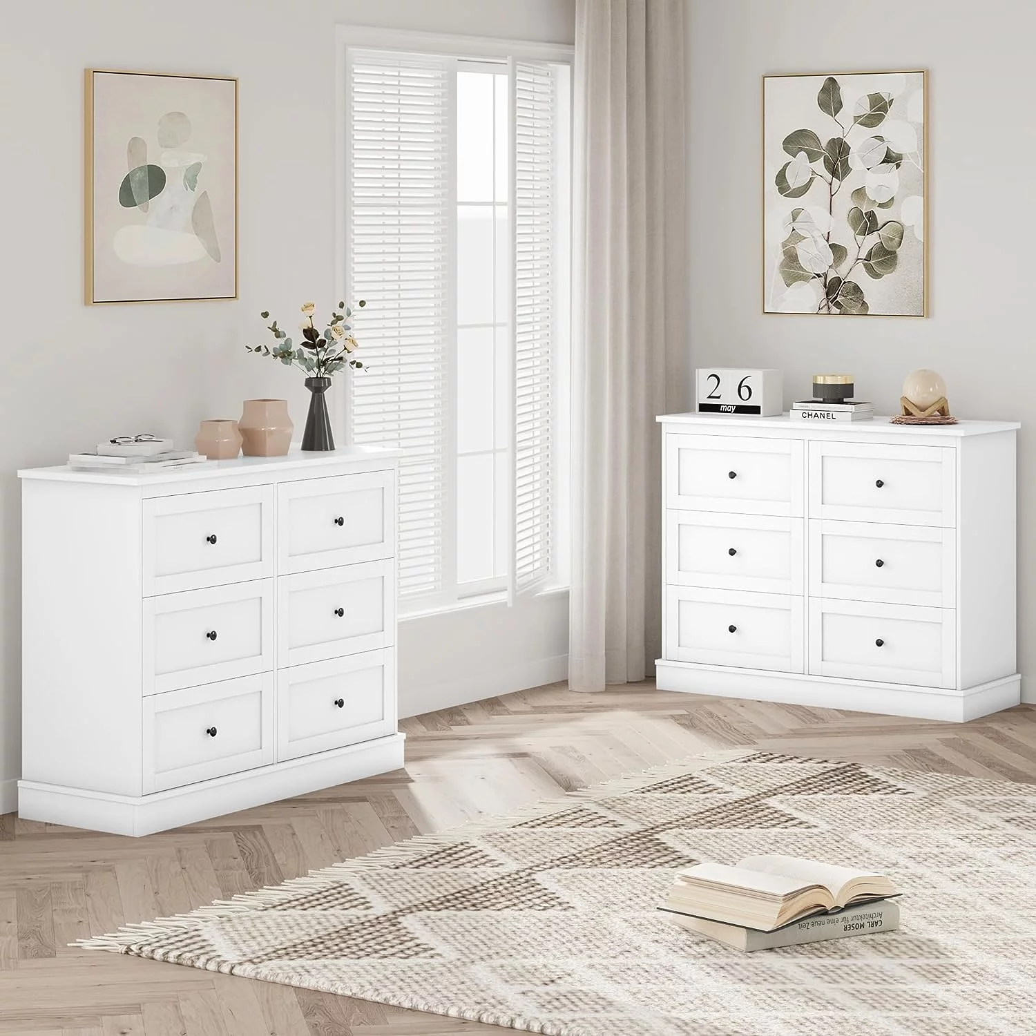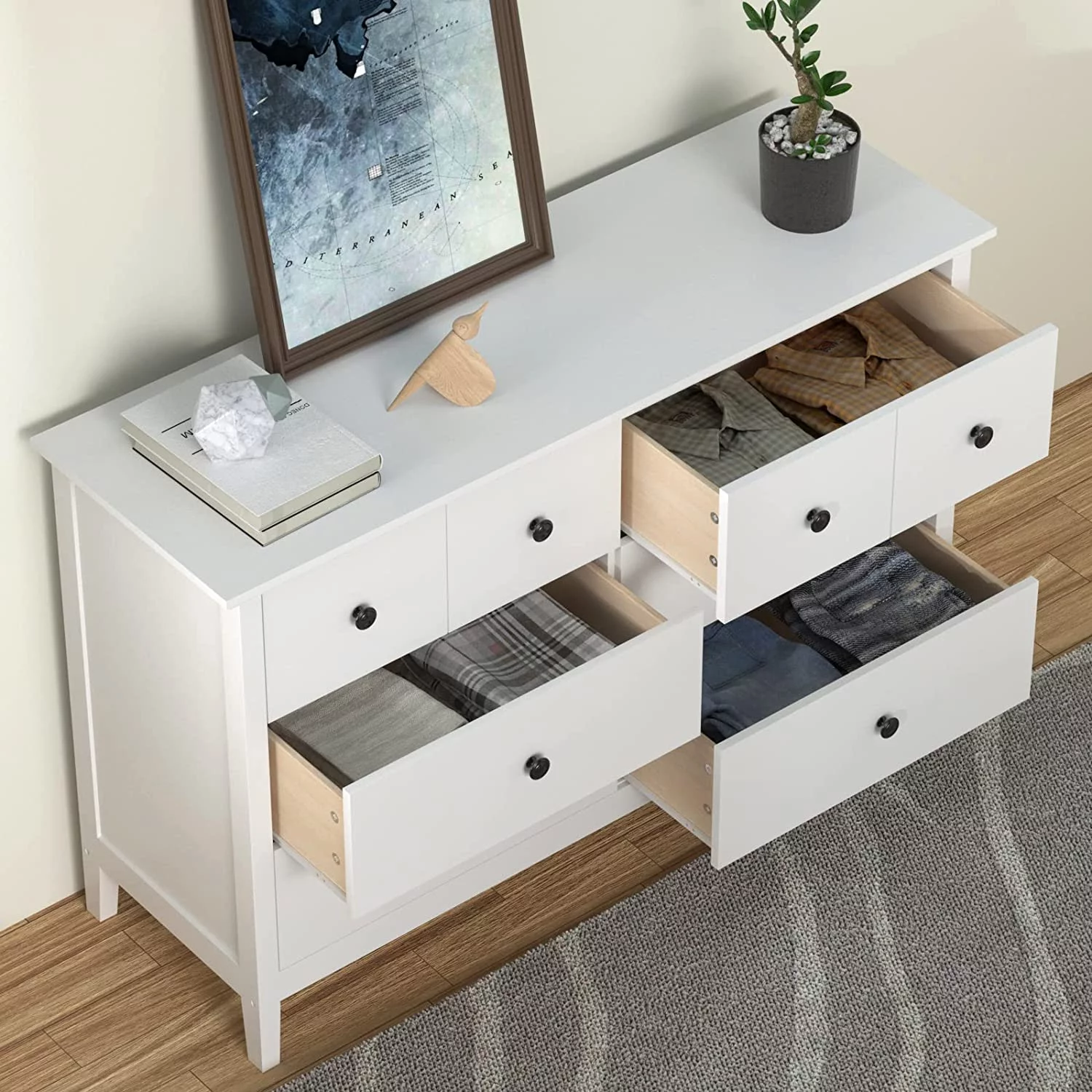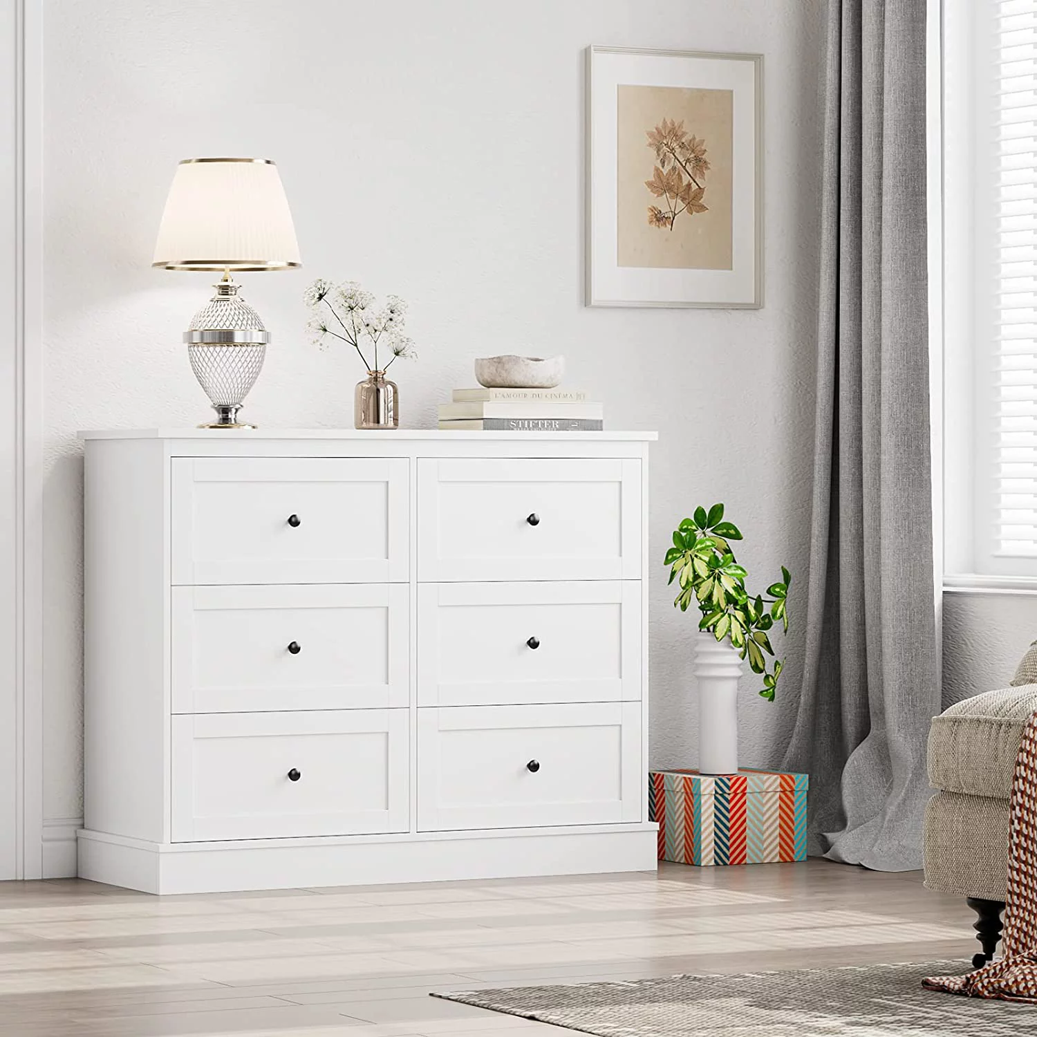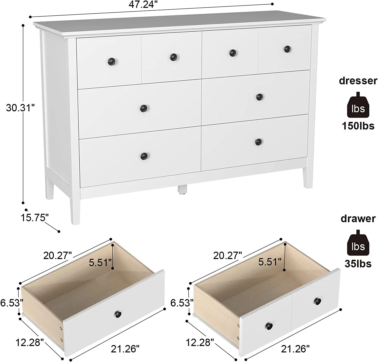 for Bedroom Modern White Dresser with Deep Drawers 6 Drawer Double Dresser with Black Knobs and Solid Wood Legs