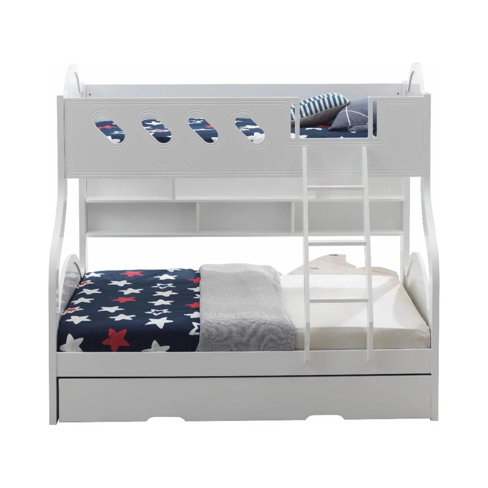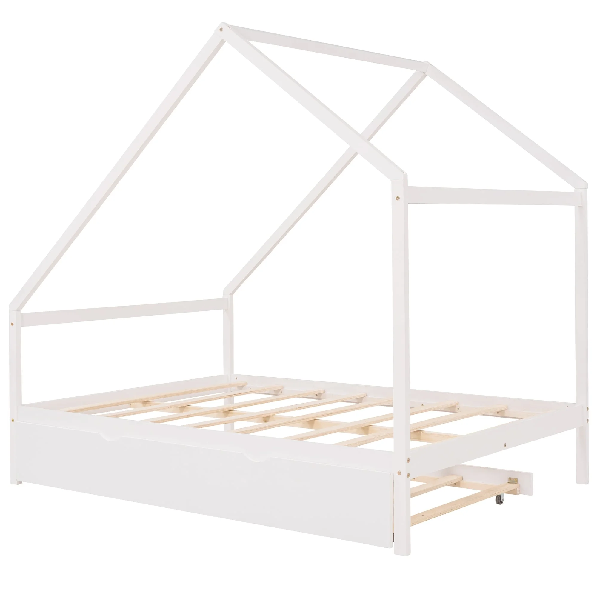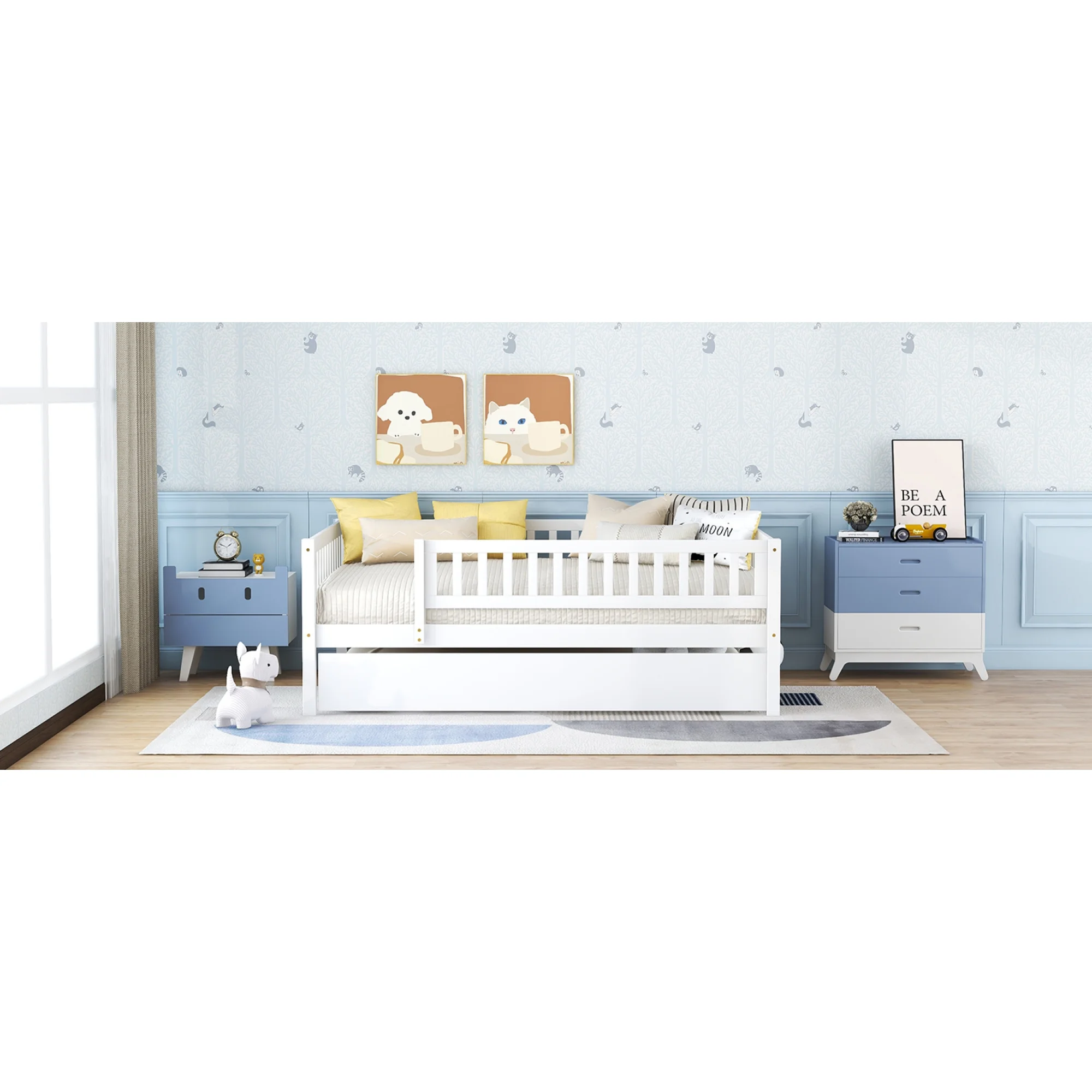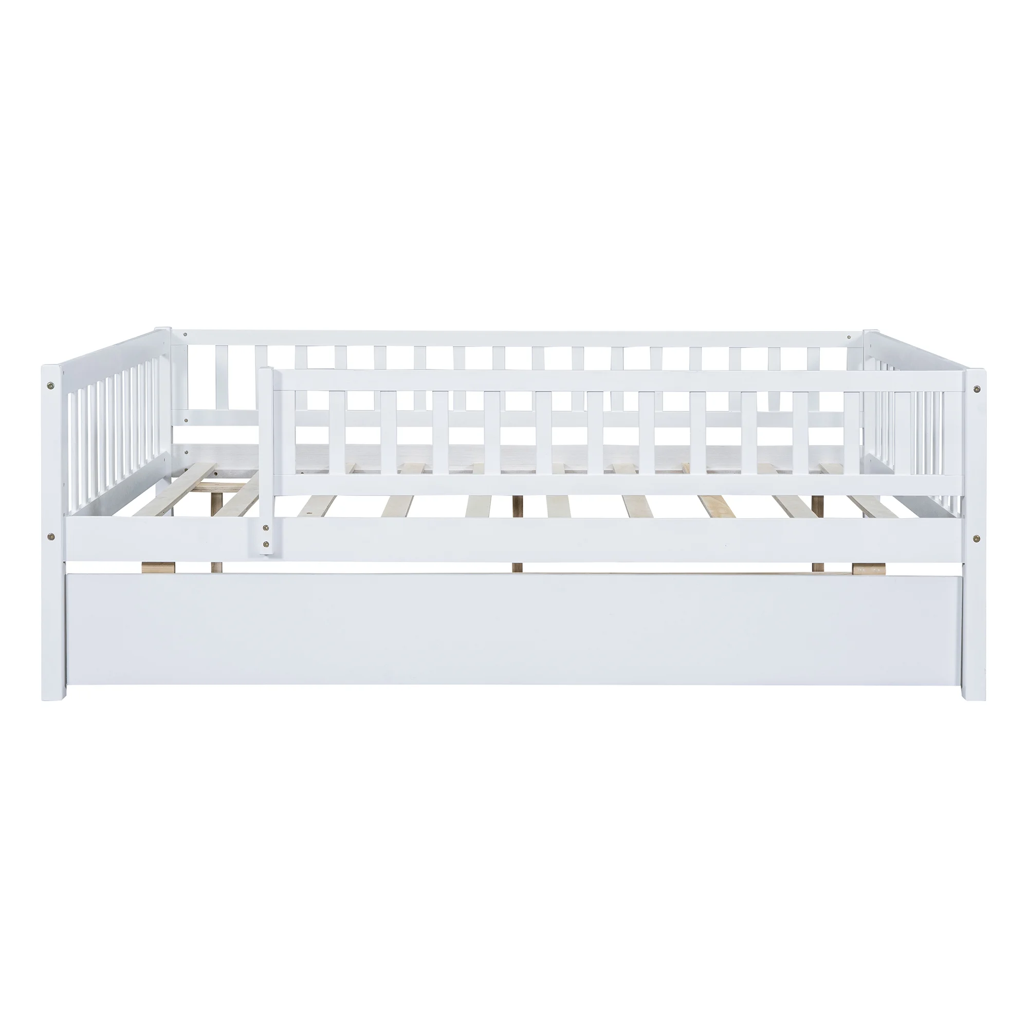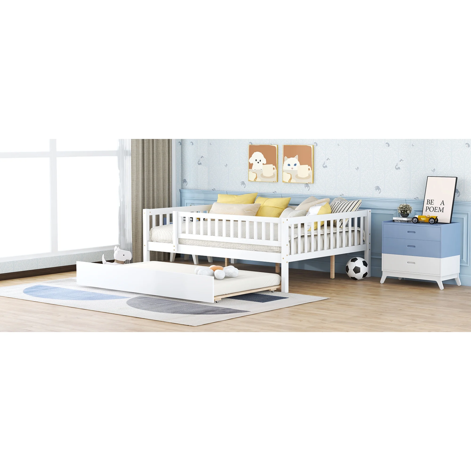 "White Full-Size Wooden Daybed with Pull-Out Trundle and Protective Fence Guardrails"