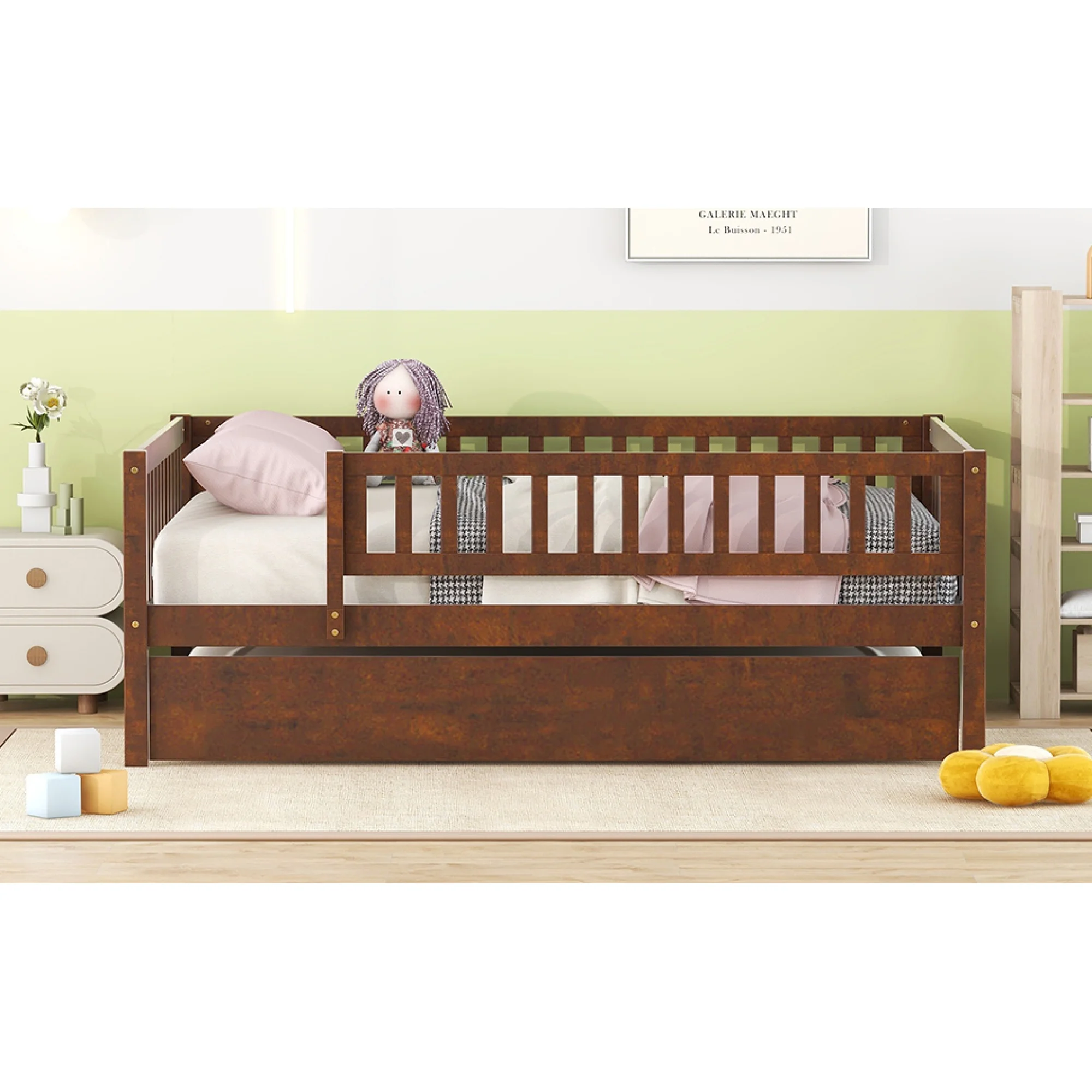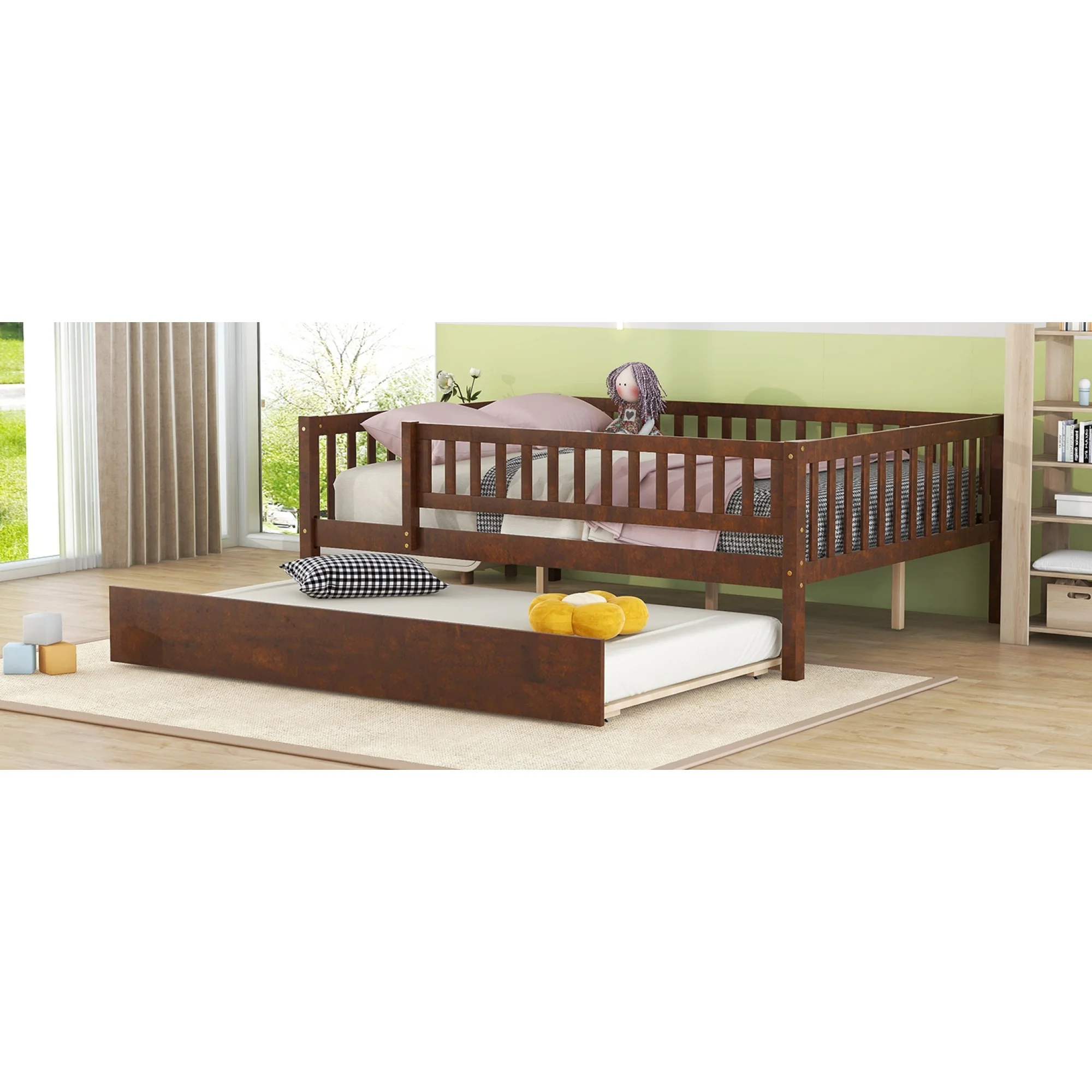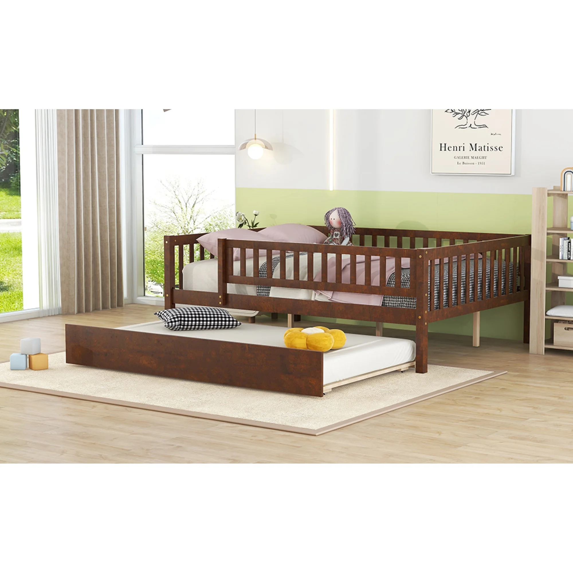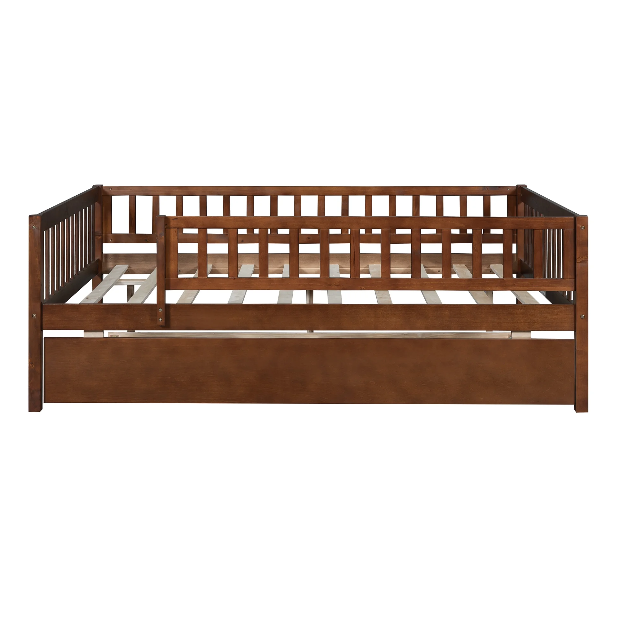 "Walnut Full-Size Wood Daybed with Roll-Out Trundle and Protective Fence Guardrails - Elegant and Functional Design"