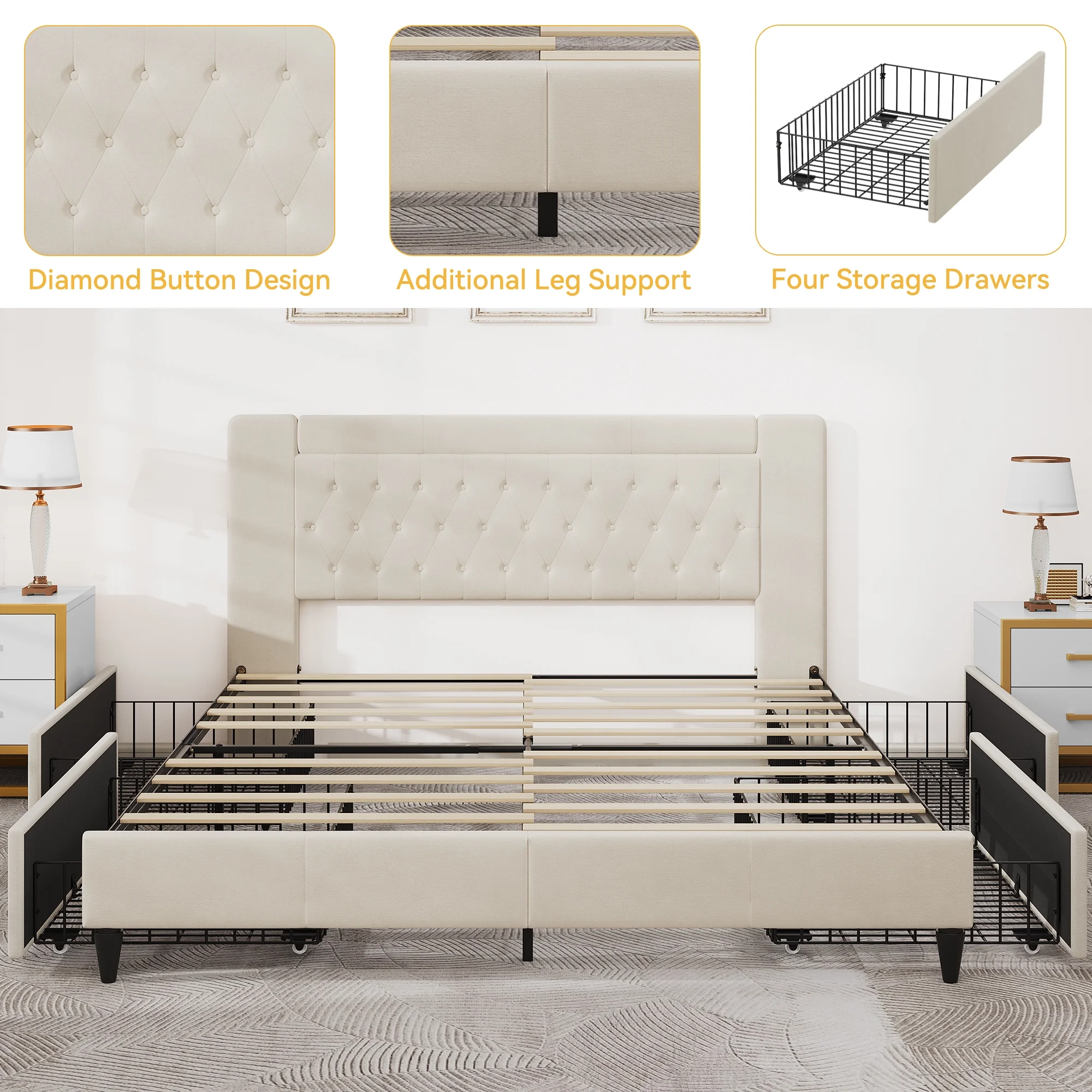 CoSoTower Queen Size Wood Storage Platform Bed with 2 Drawers, Rattan Headboard and Footboard, Black