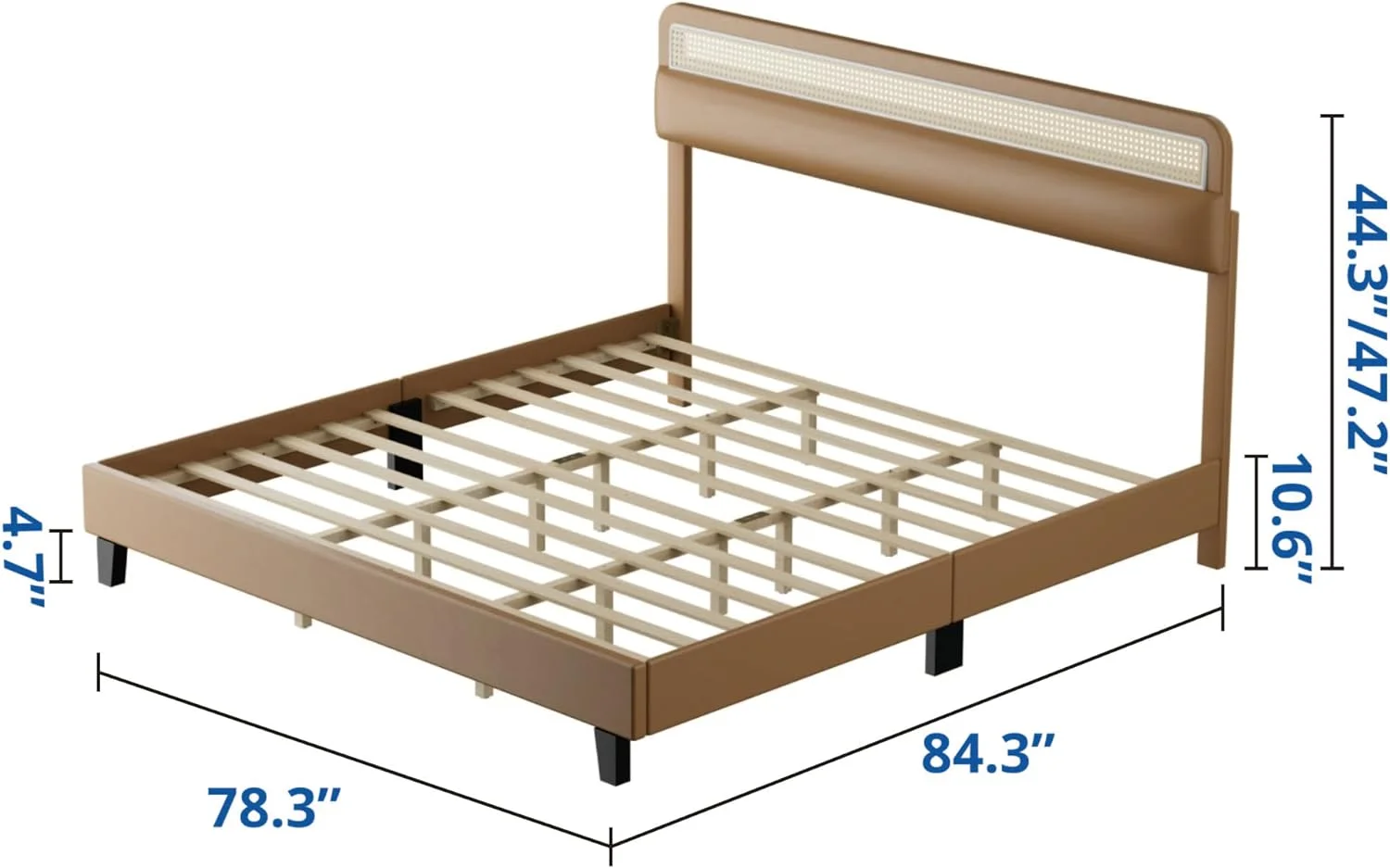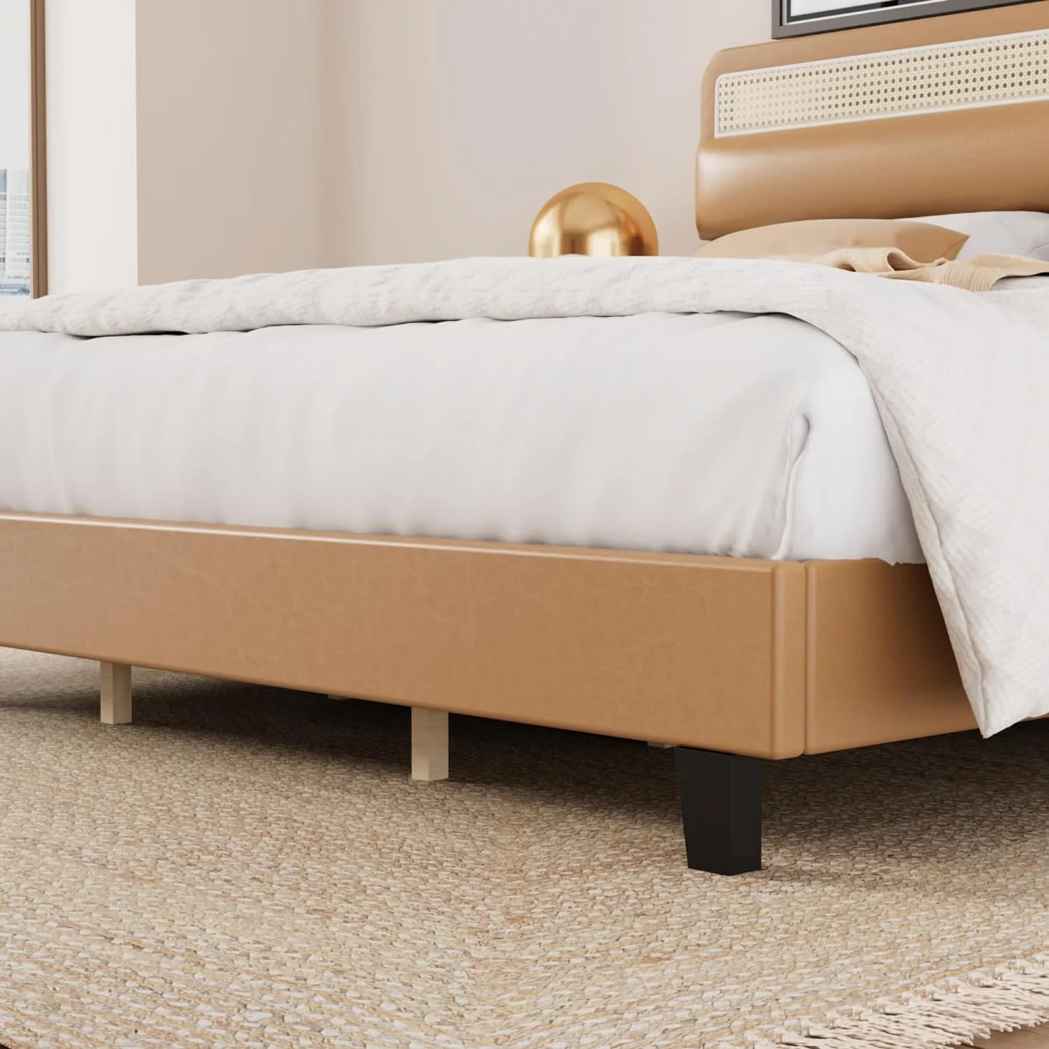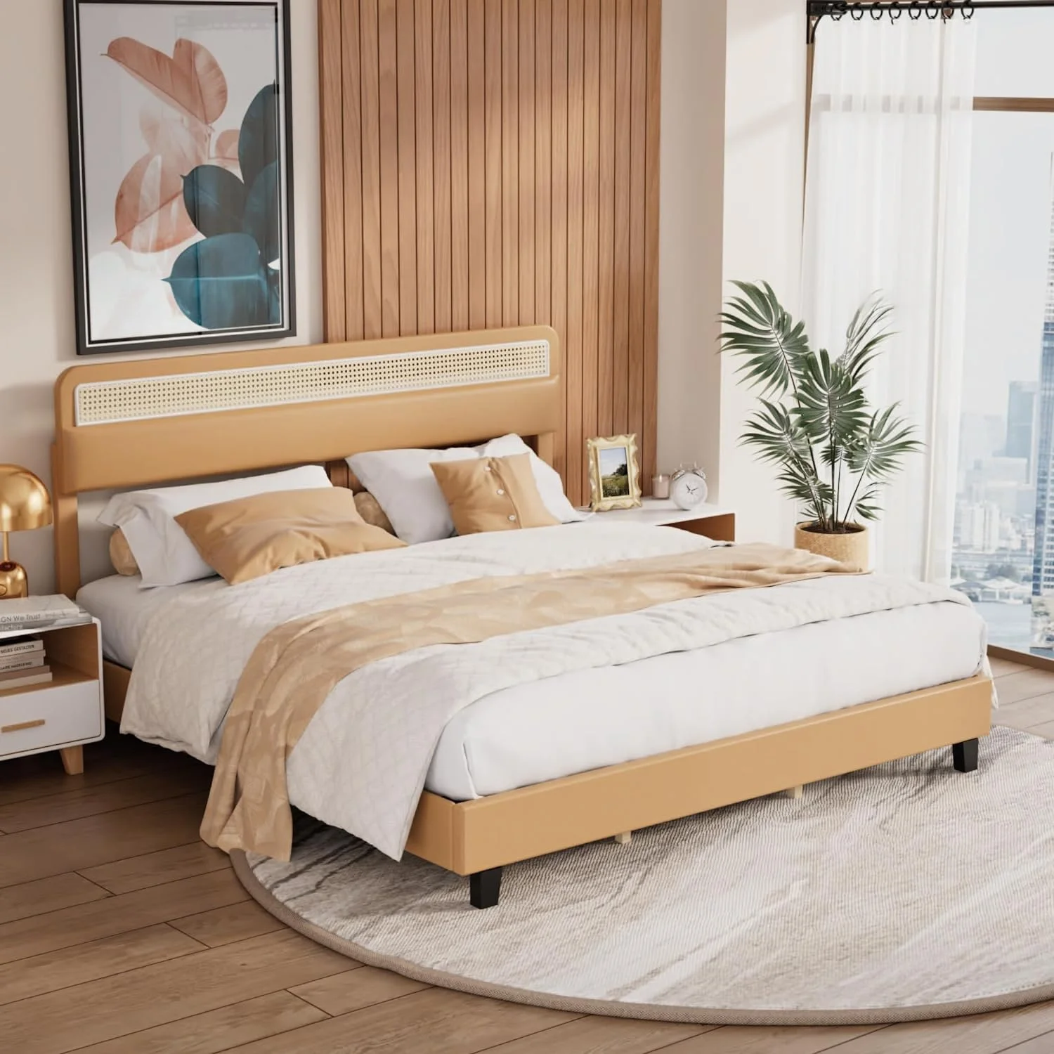 Baxton Studio Eridian Mid-Century Modern Walnut Brown Finished Wood and Natural Rattan Platform Bed King